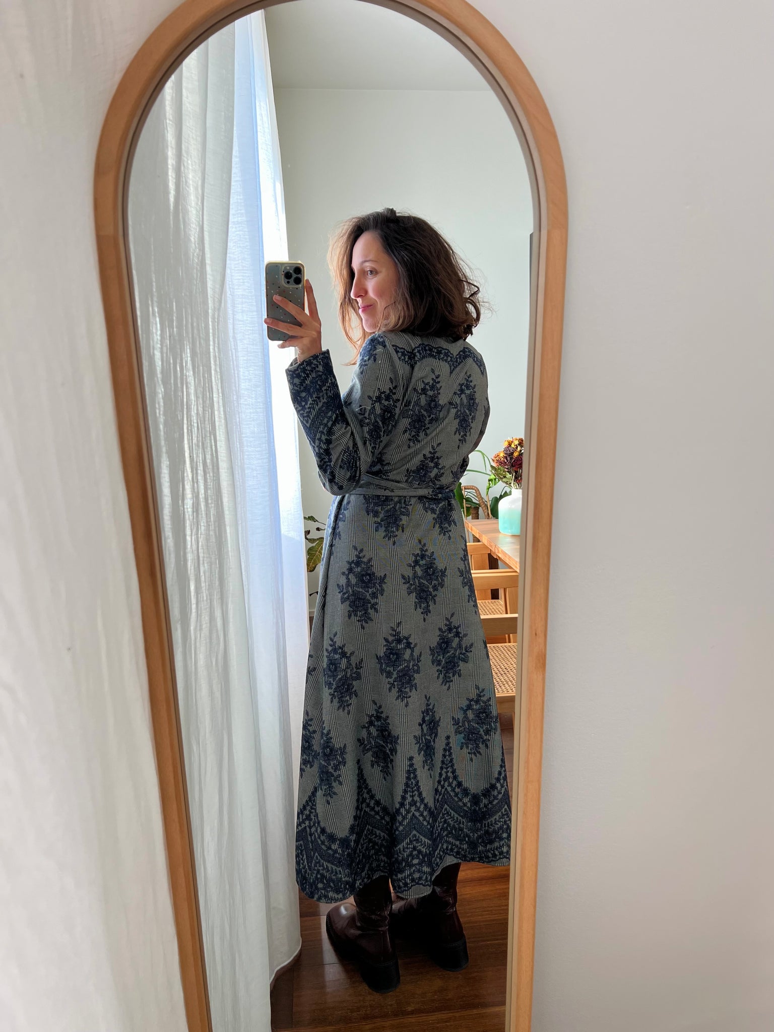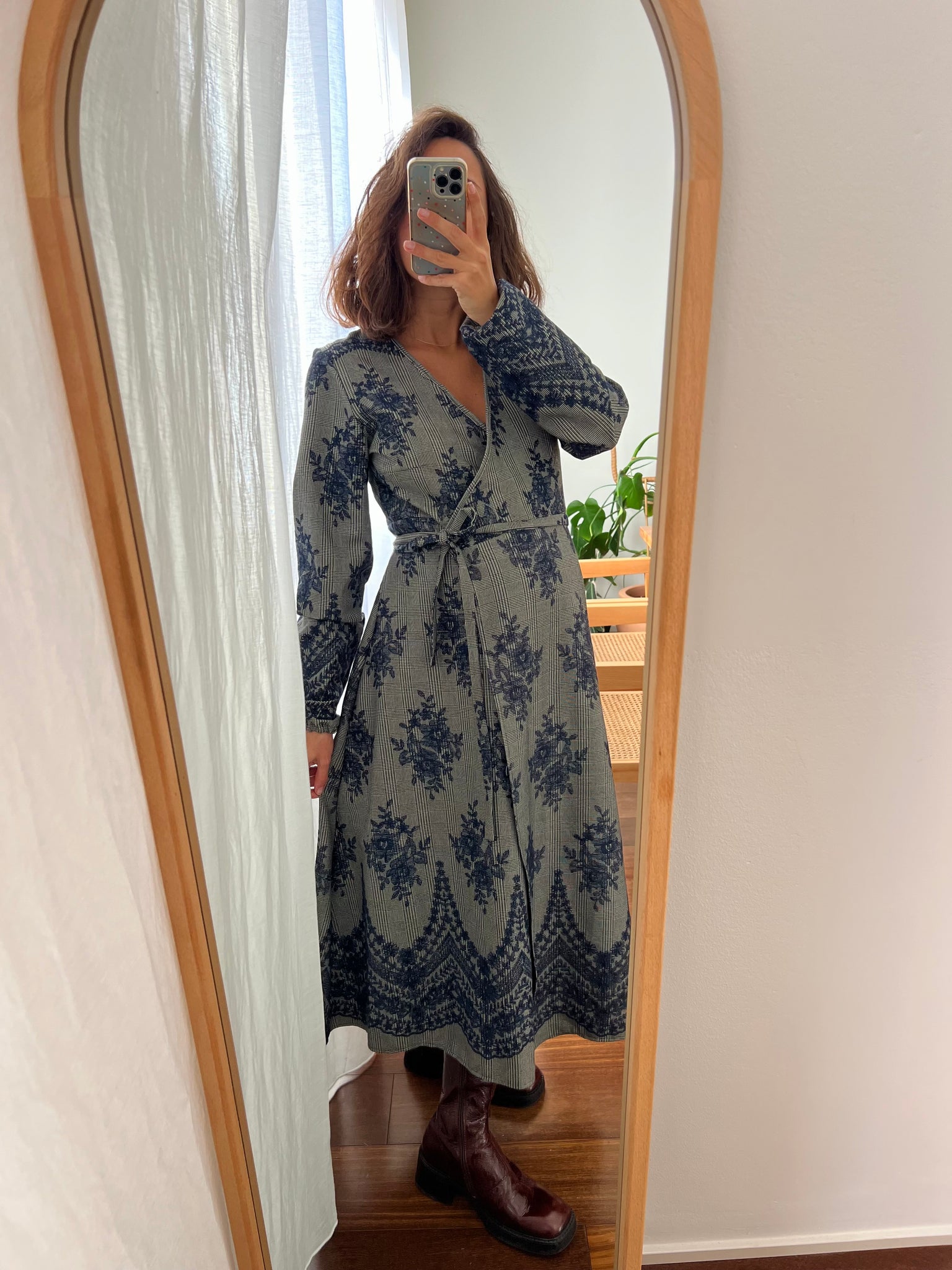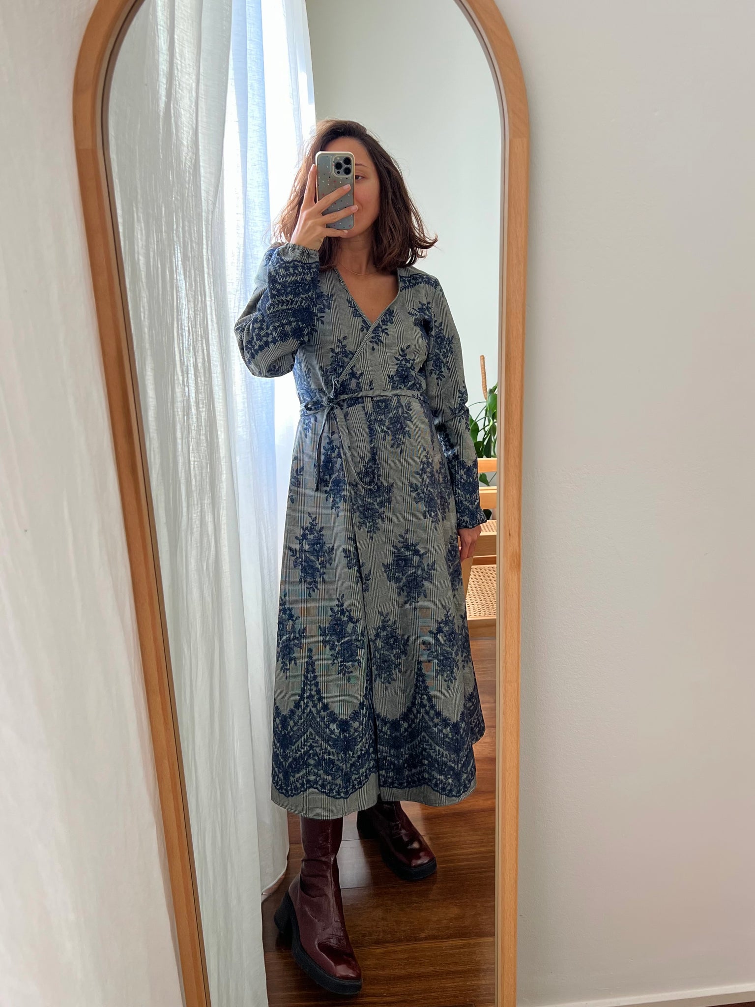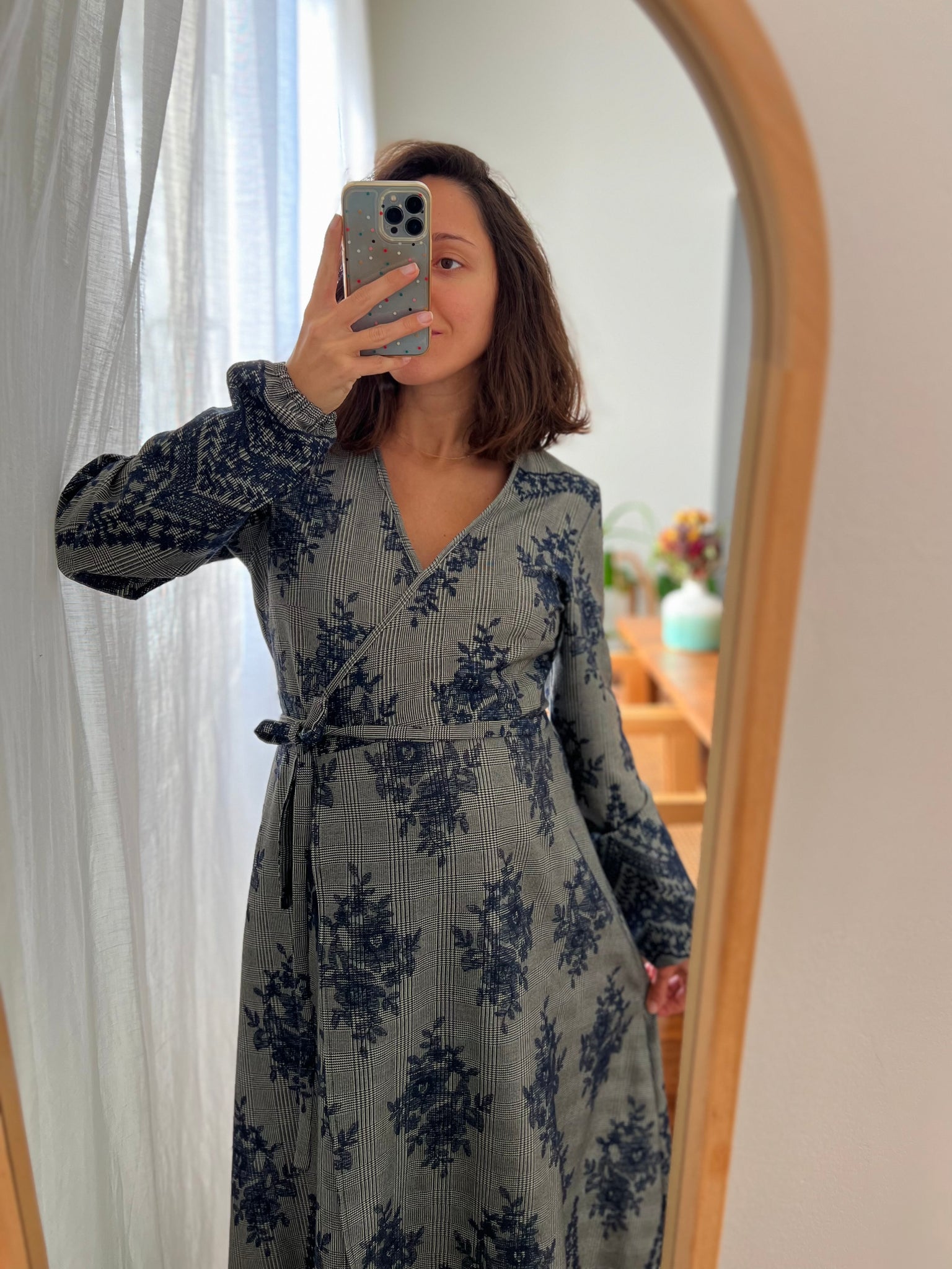 Abito handmade by Chiara Luppi, modello con chiusura a portafoglio e laccetto che valorizza il punto vita, e manica un po’ ampia che si stringe sul polso.