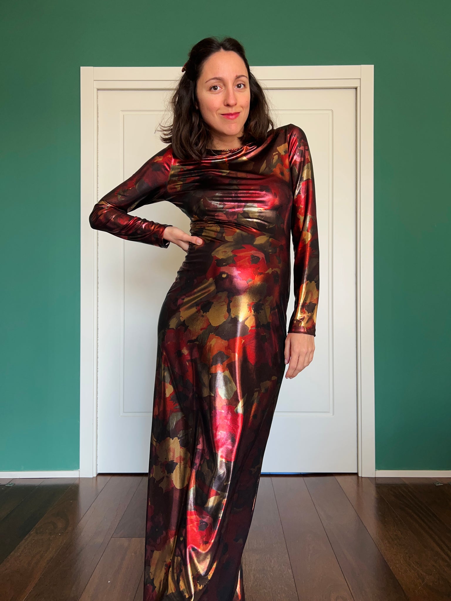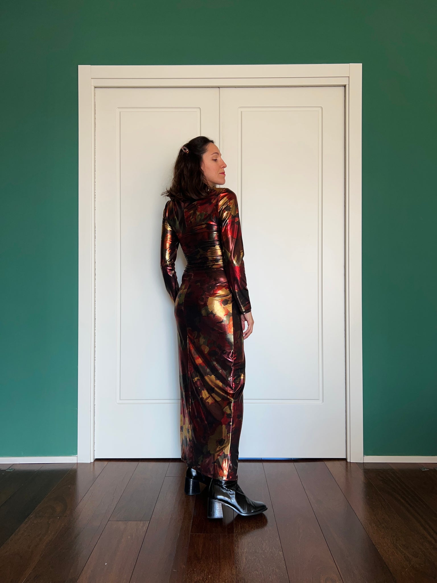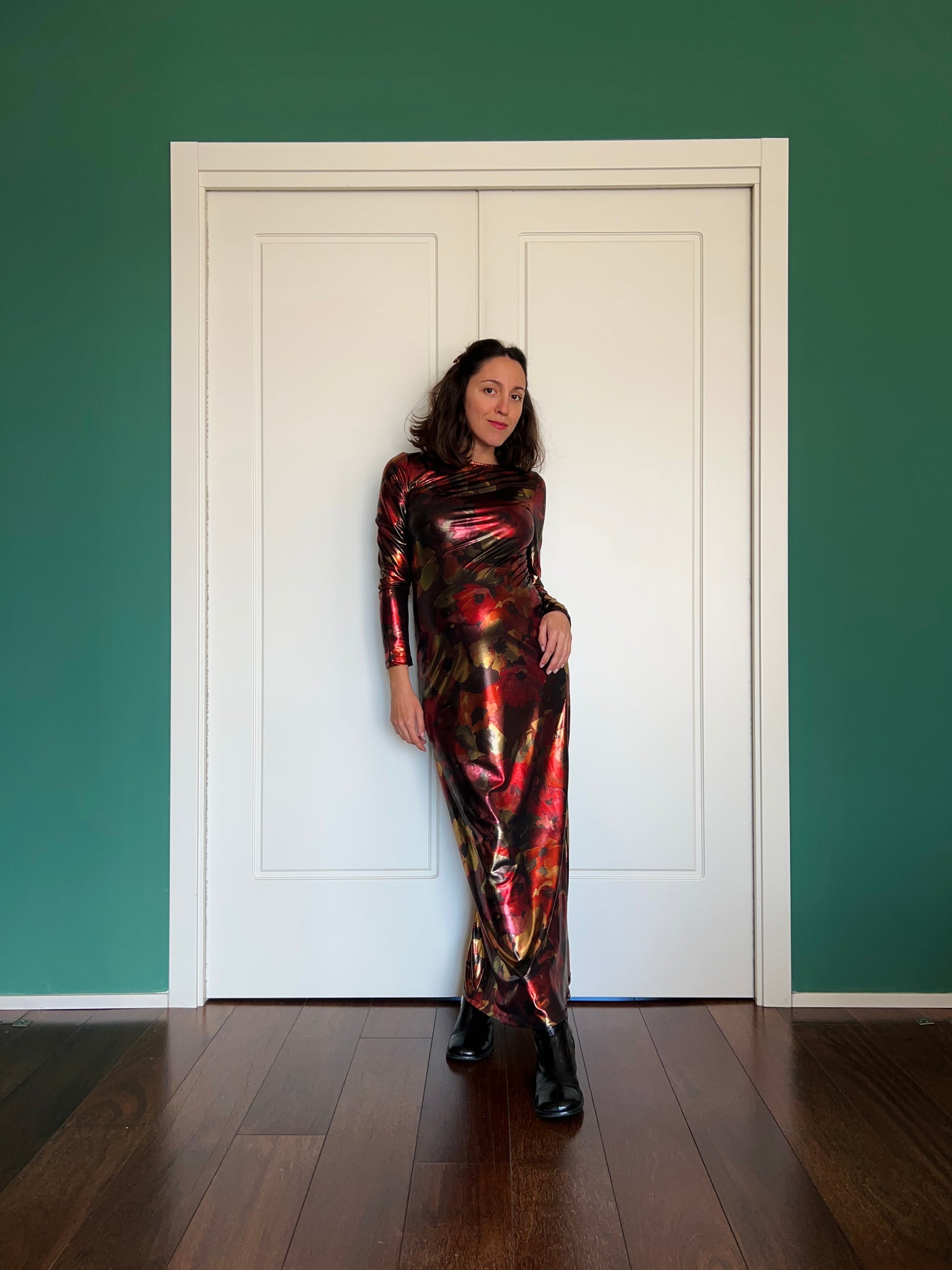 Abito sartoriale by Chiara Luppi, nuovo modello stretto a manica lunga, in tessuto elasticizzato metallizzato in poliestere e viscosa.