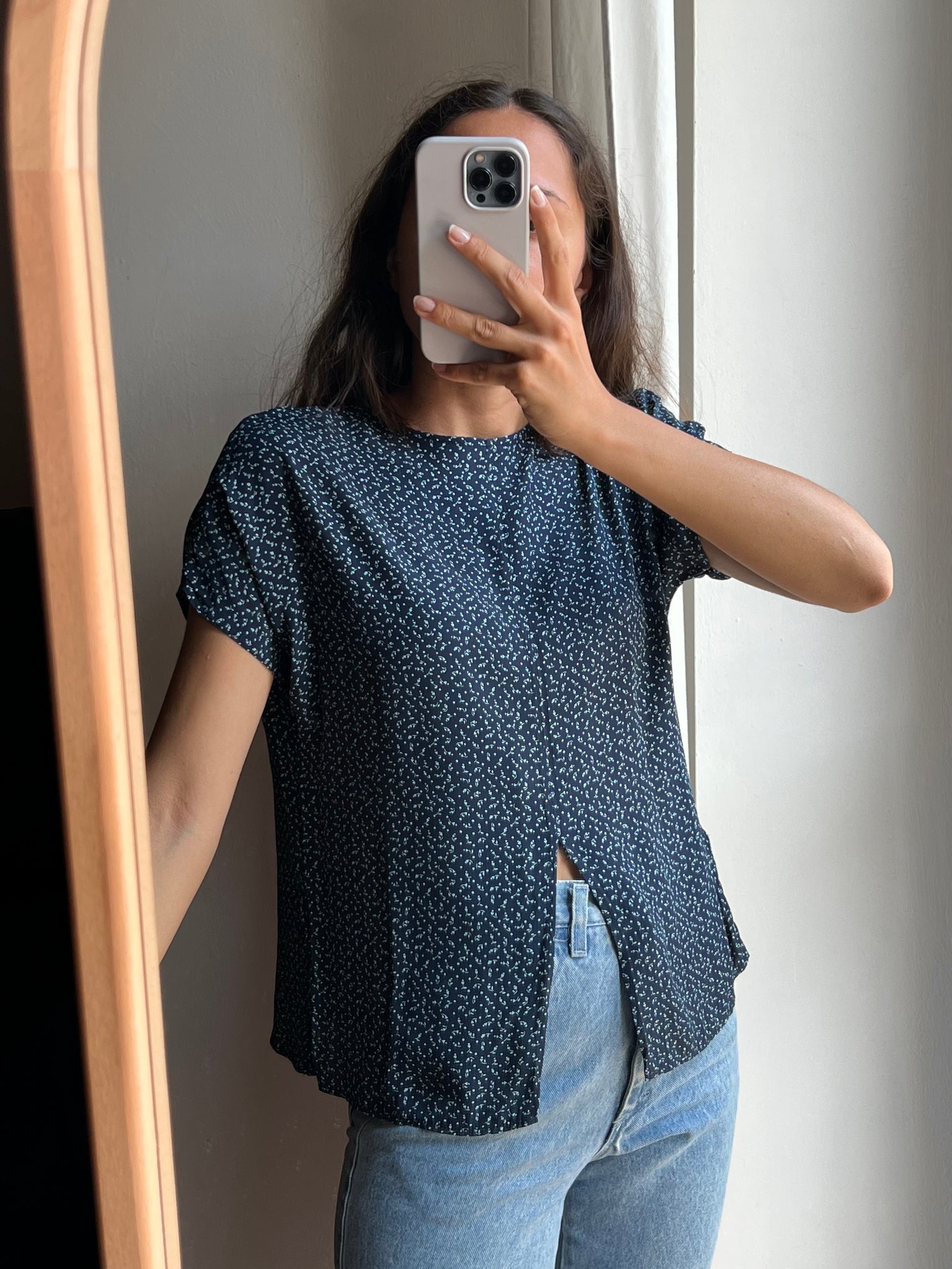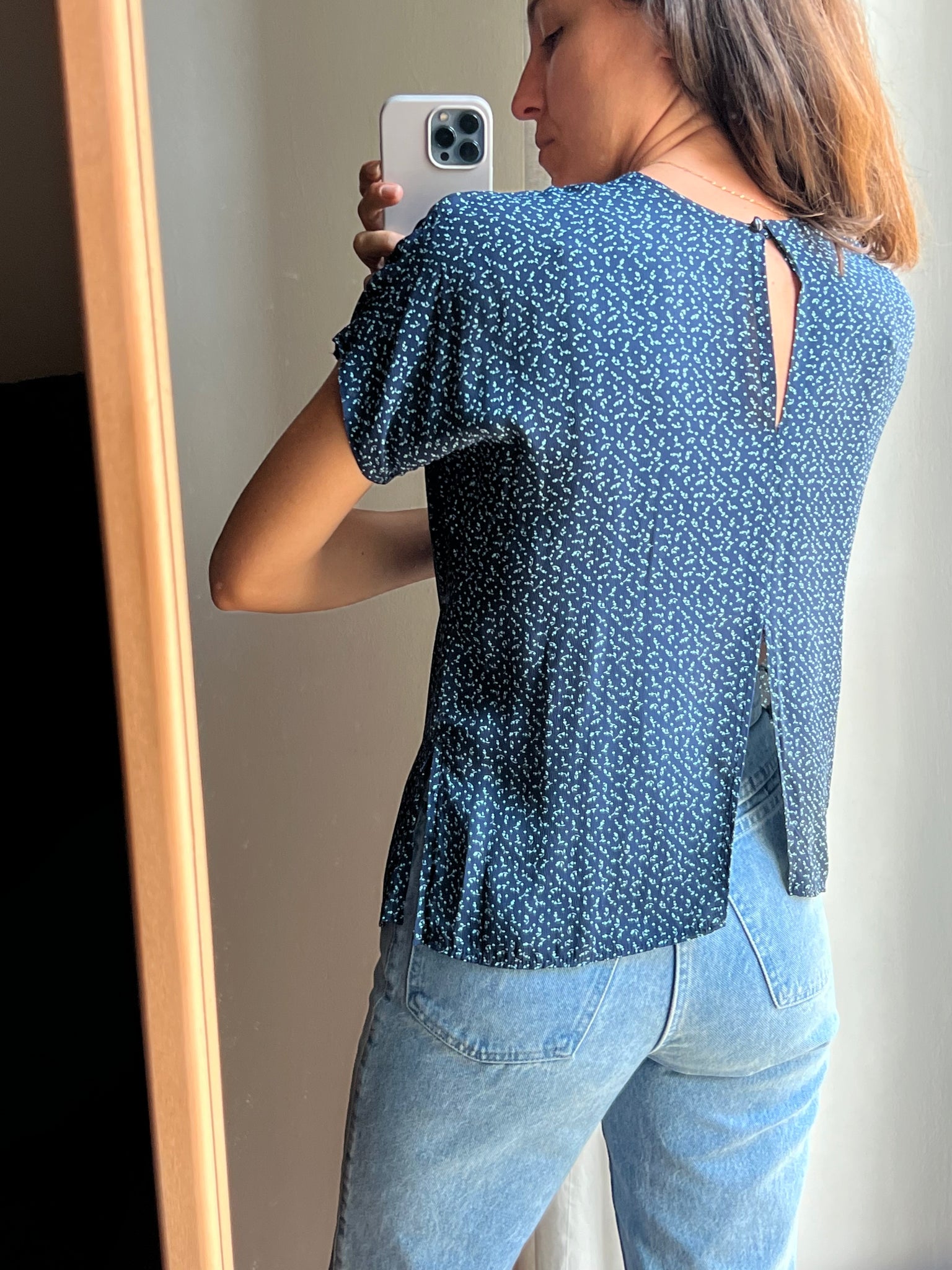 Camicetta vintage di viscosa con spacco sia davanti che dietro, e manica a kimono.