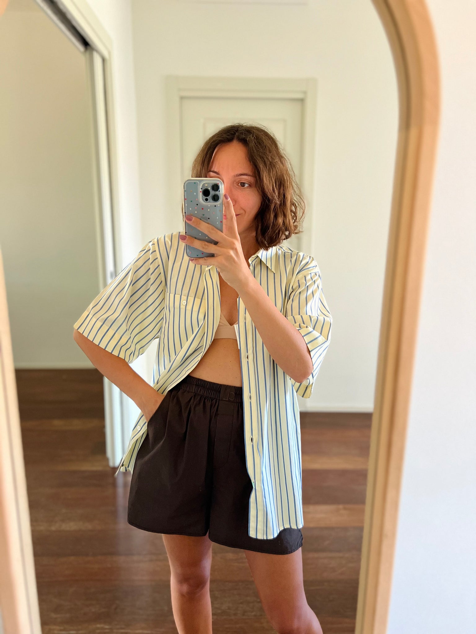 100% cotone, con una bellissima trama jacquard leggera sulla parte delle righe.