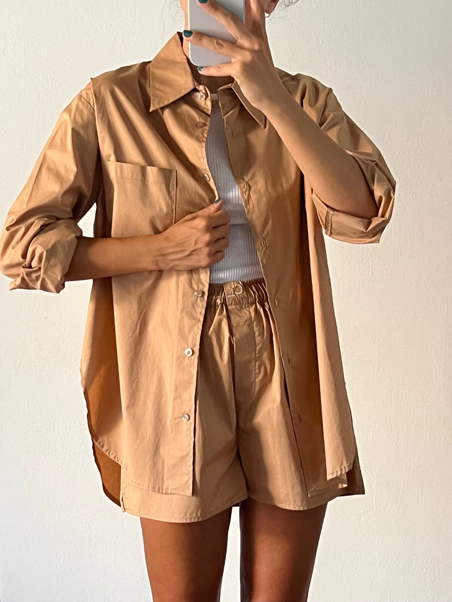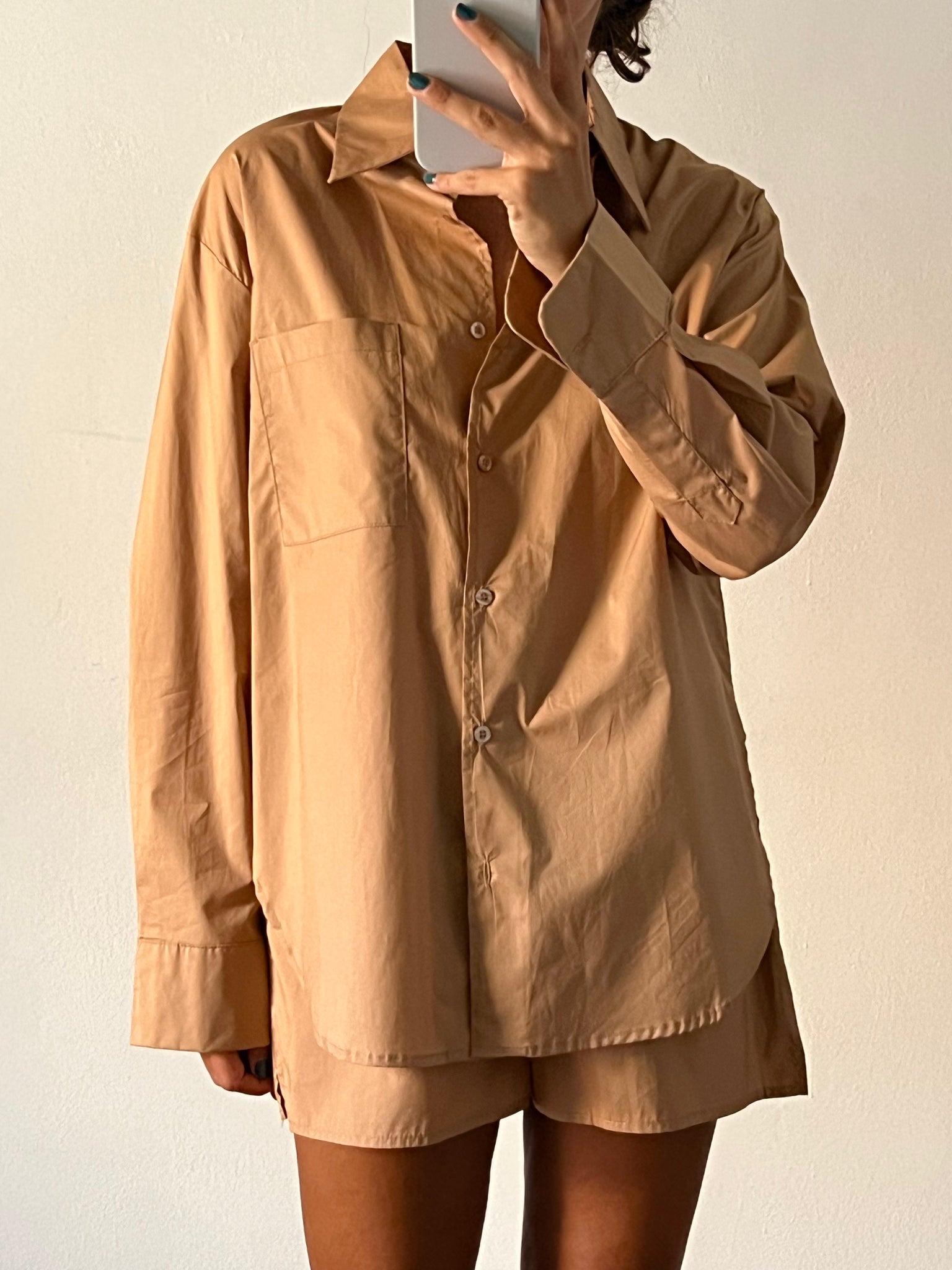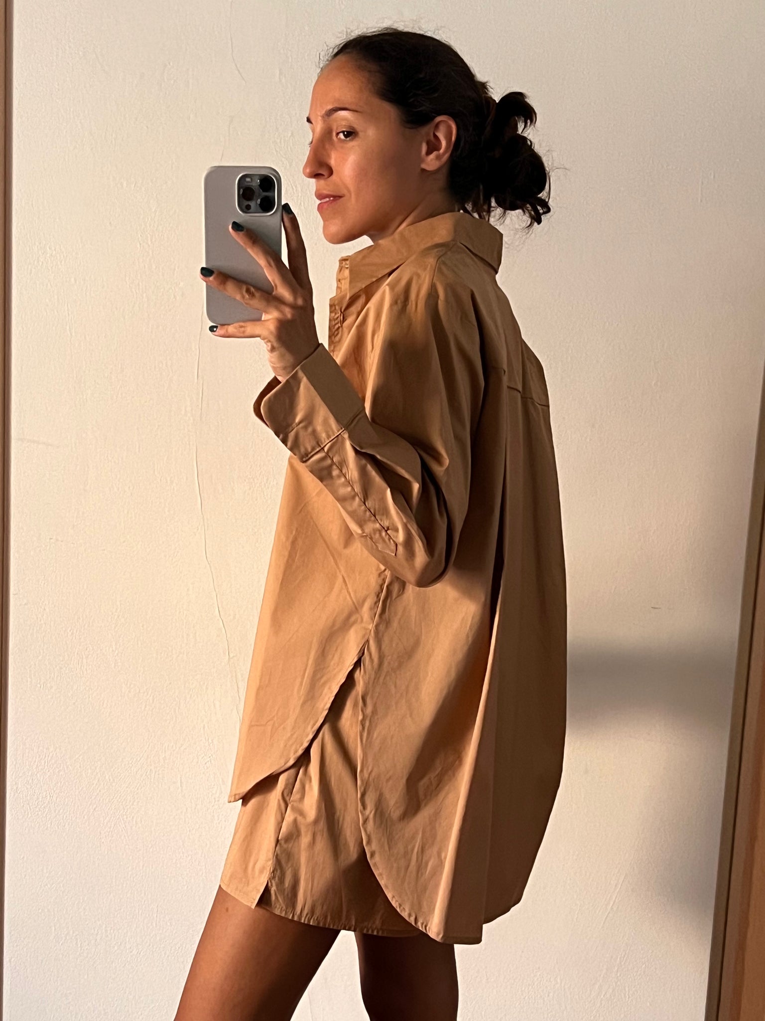 Camicia handmade by Chiara Luppi, modello ampio e lunghetto con tasca frontale e pieghe sul retro.