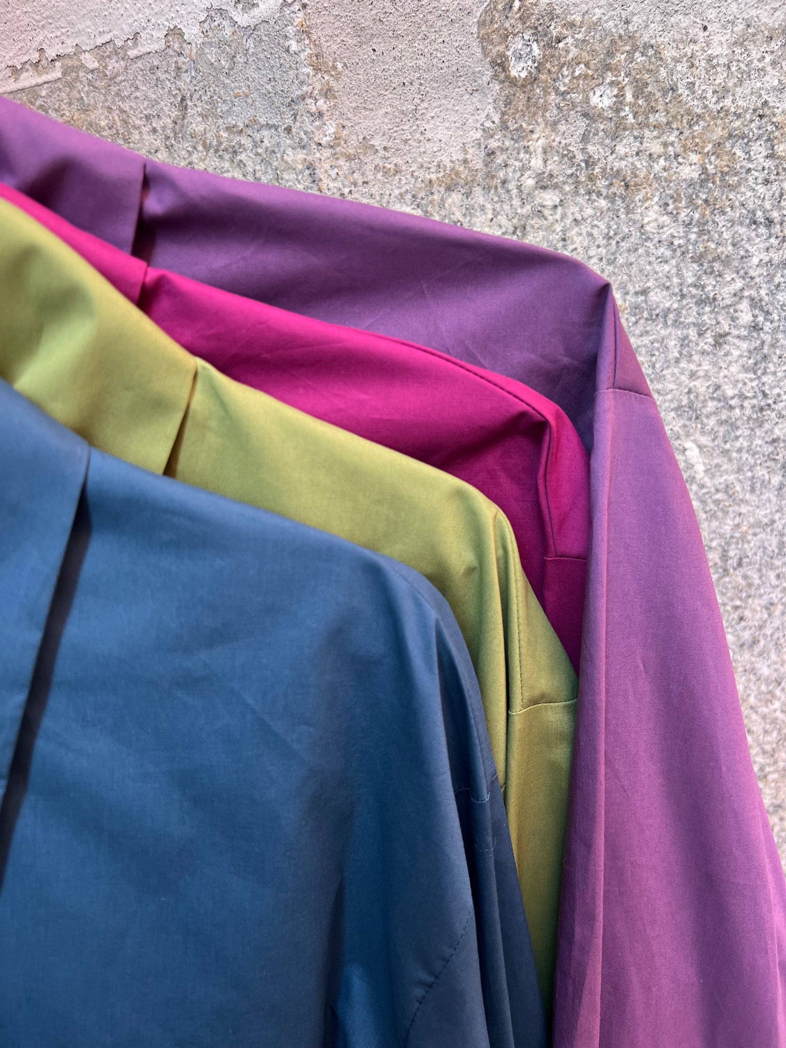 Camicia handmade by Chiara Luppi, modello ampio e lunghetto con tasca frontale e pieghe sul retro.