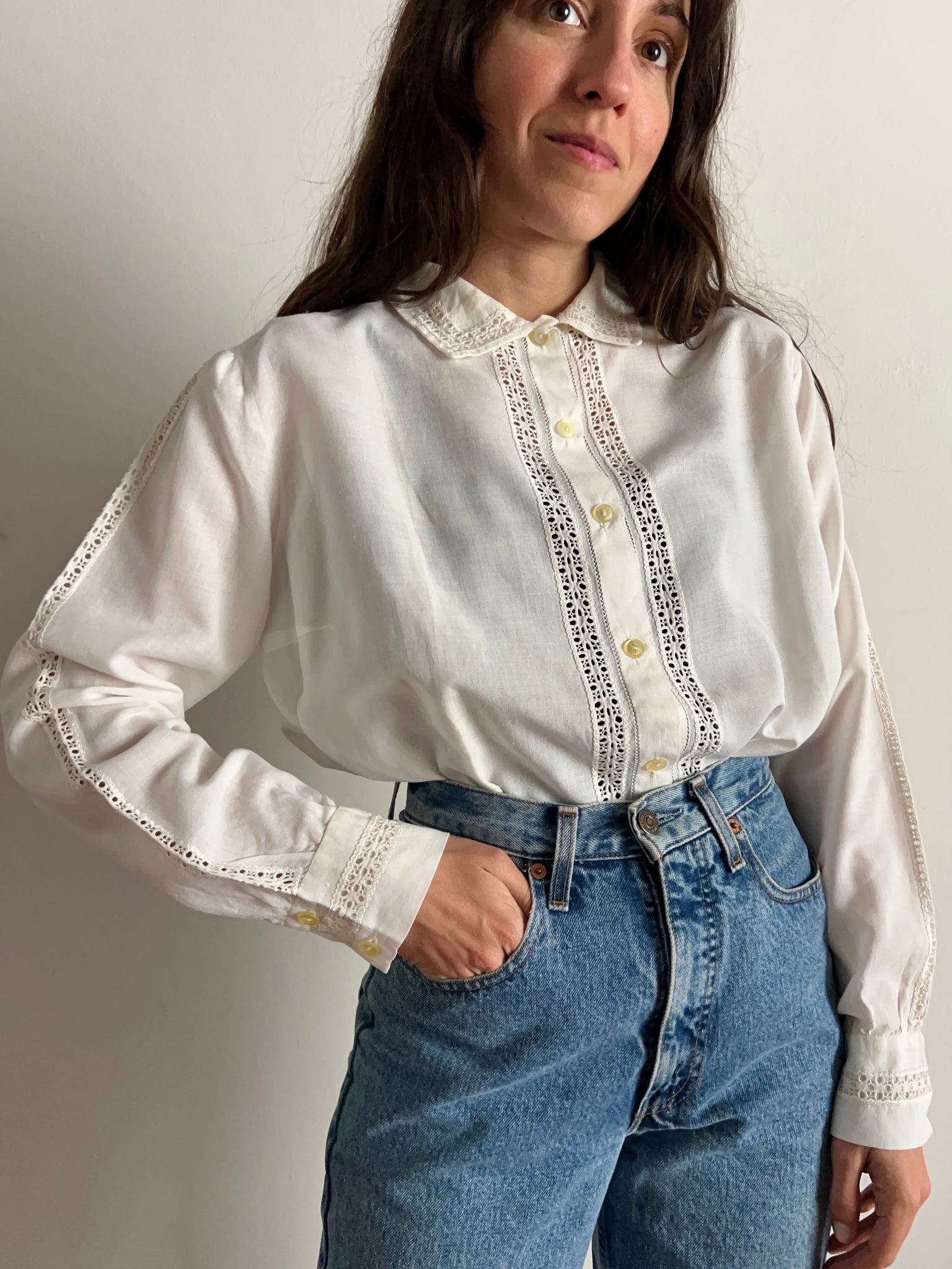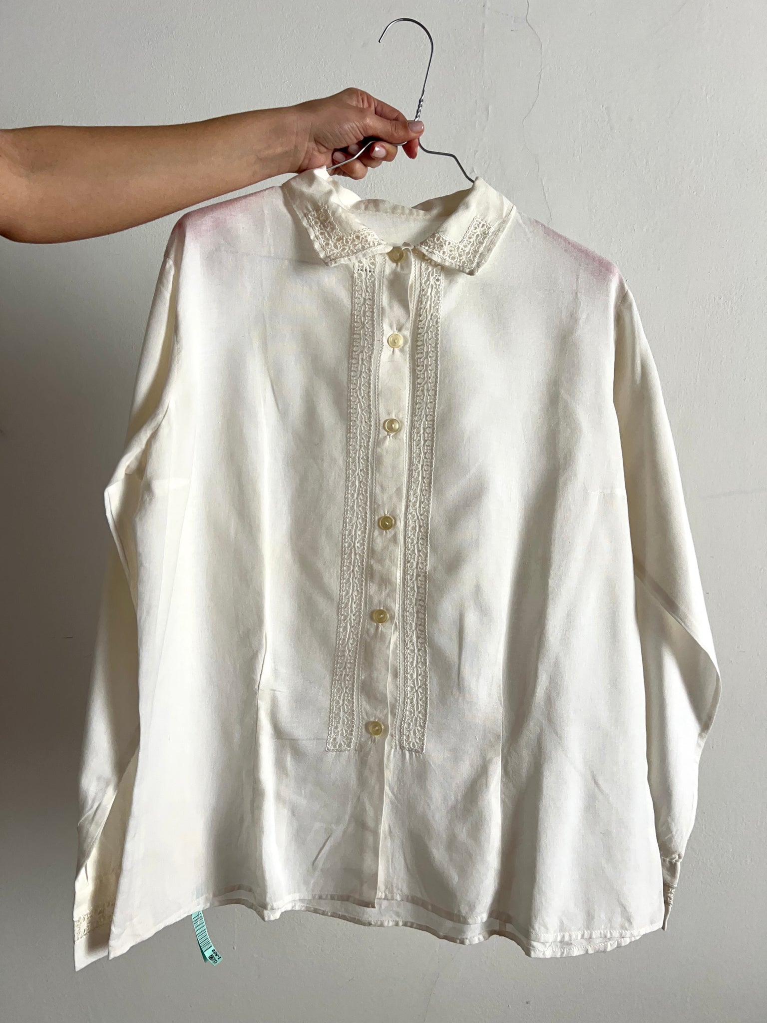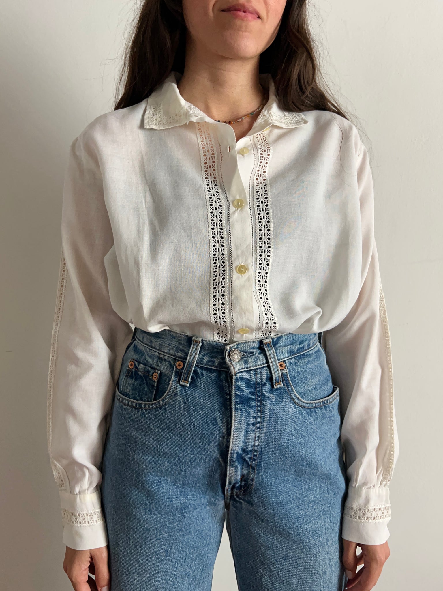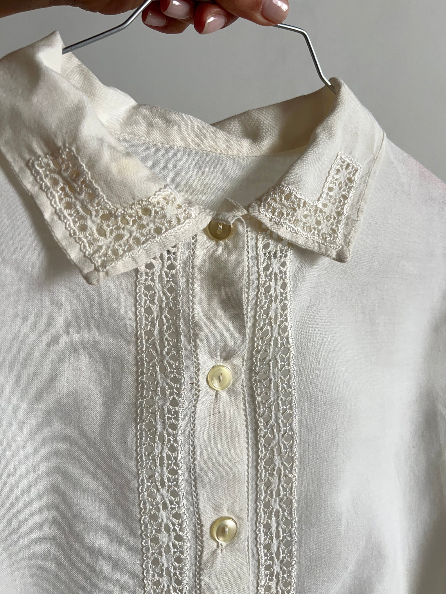 Camicia vintage antica in garza di cotone con parti in pizzo.