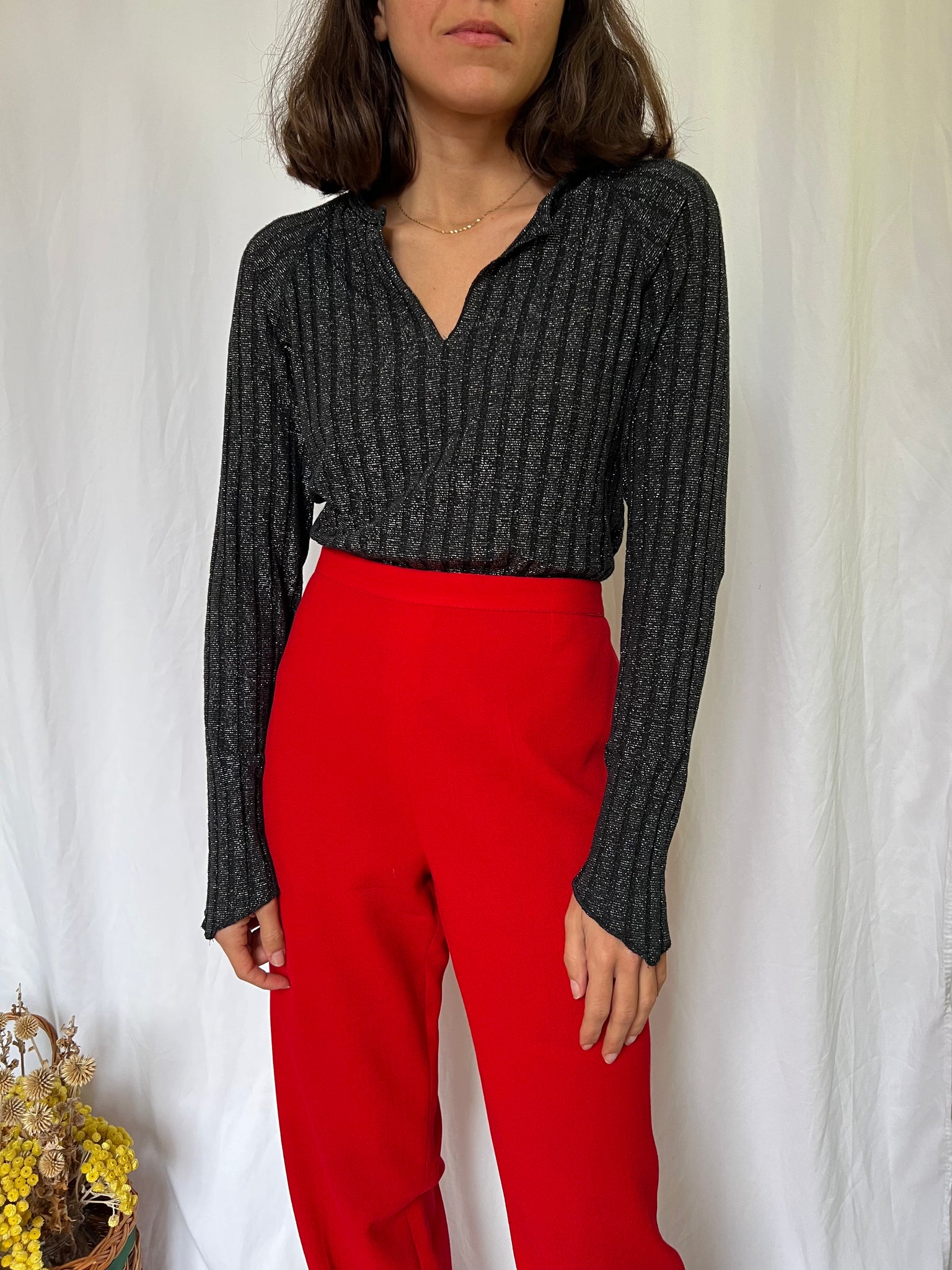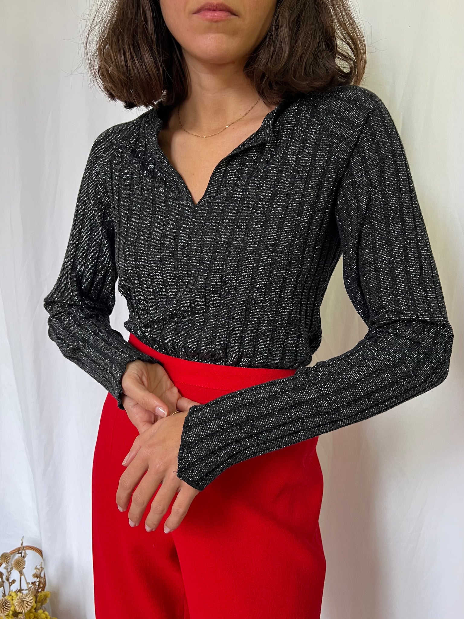 Maglia vintage a coste con filo argentato.