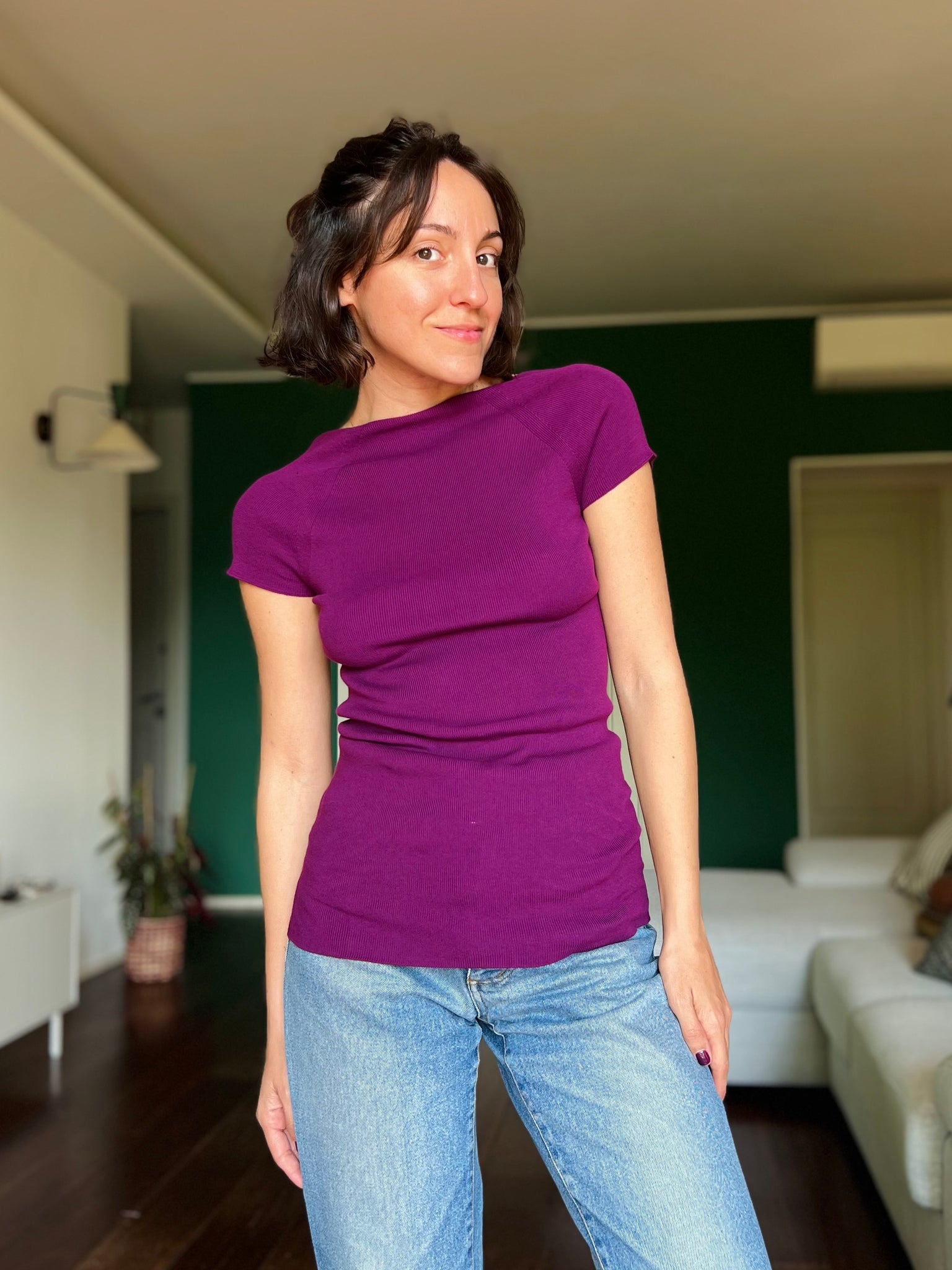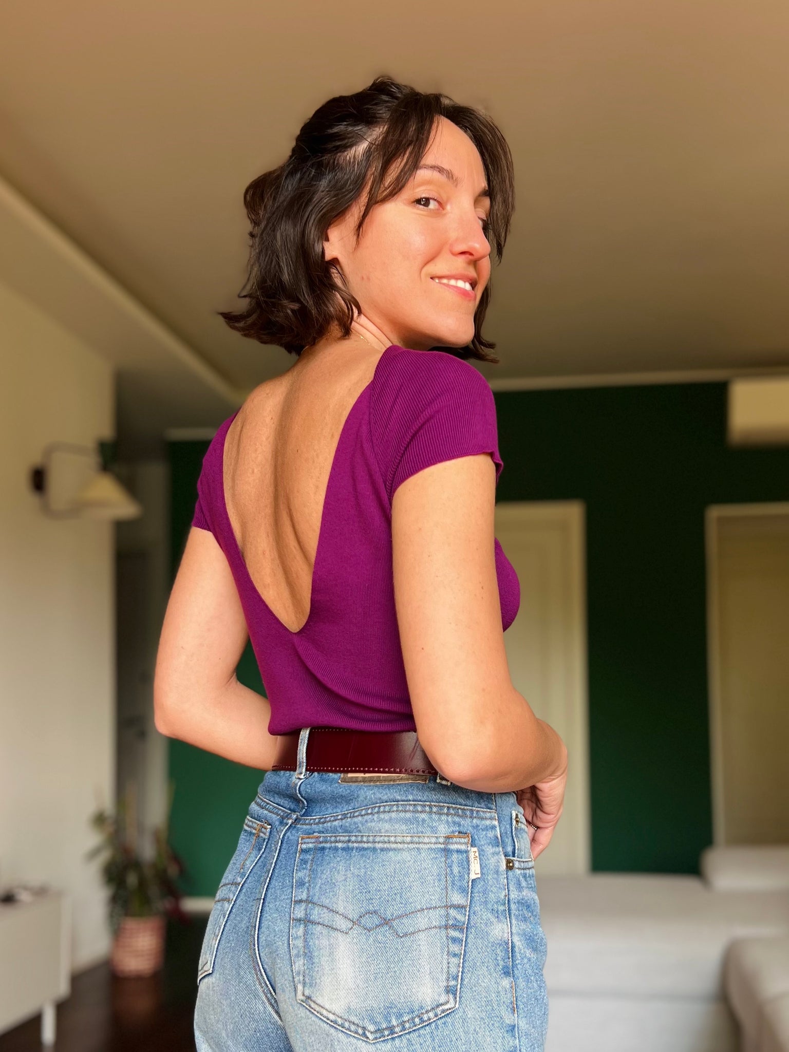 T-shirt in maglia con scollo sulla schiena • prugna