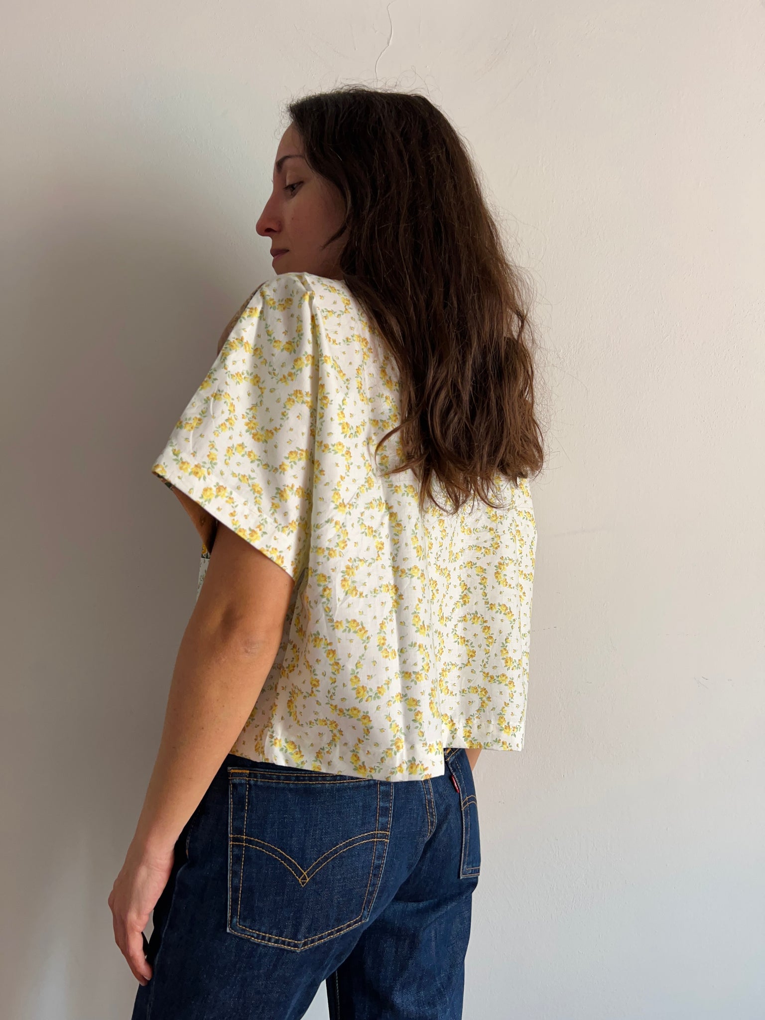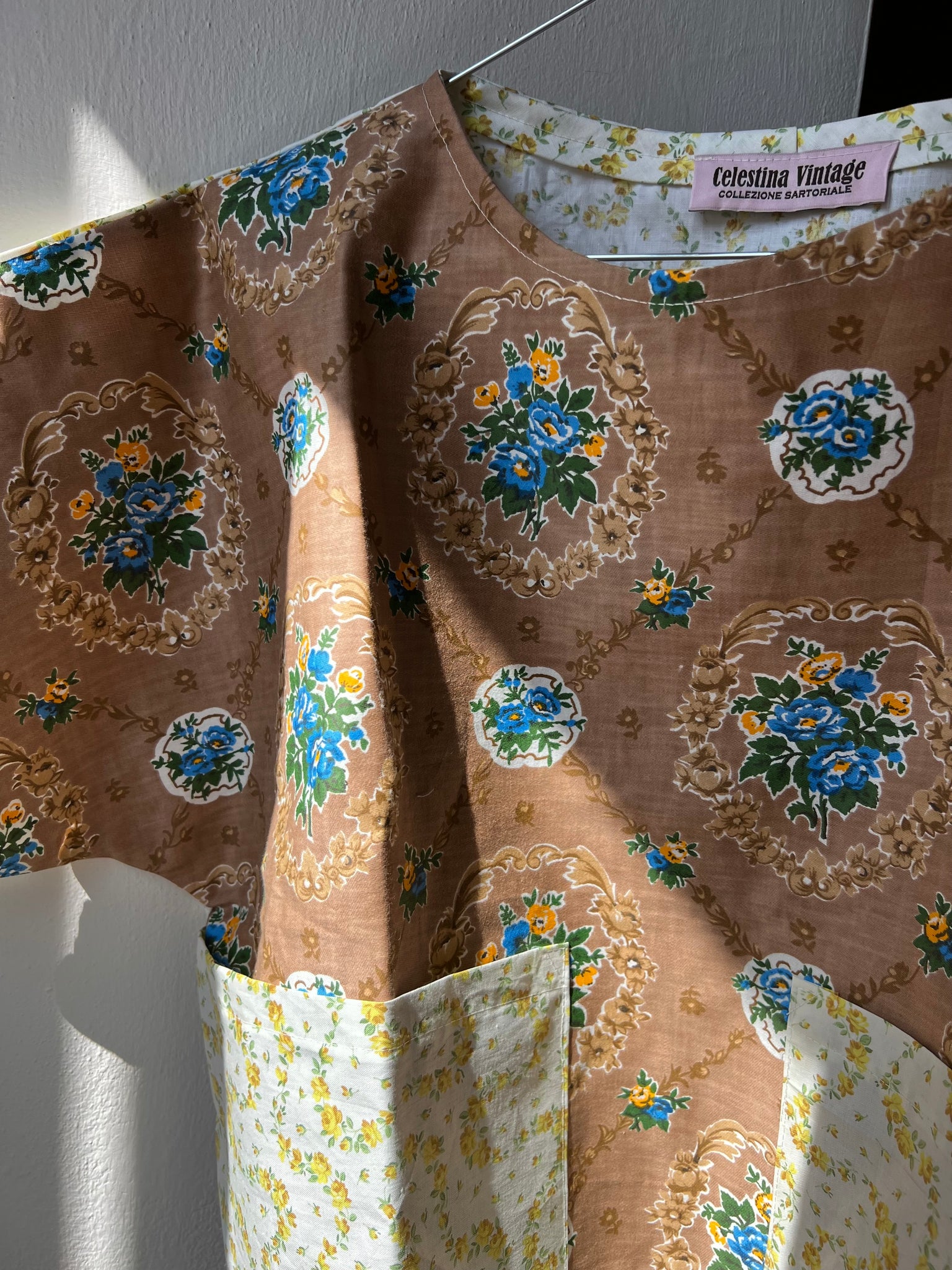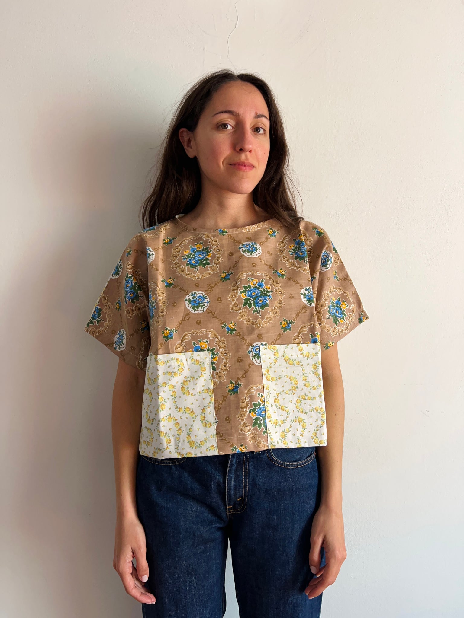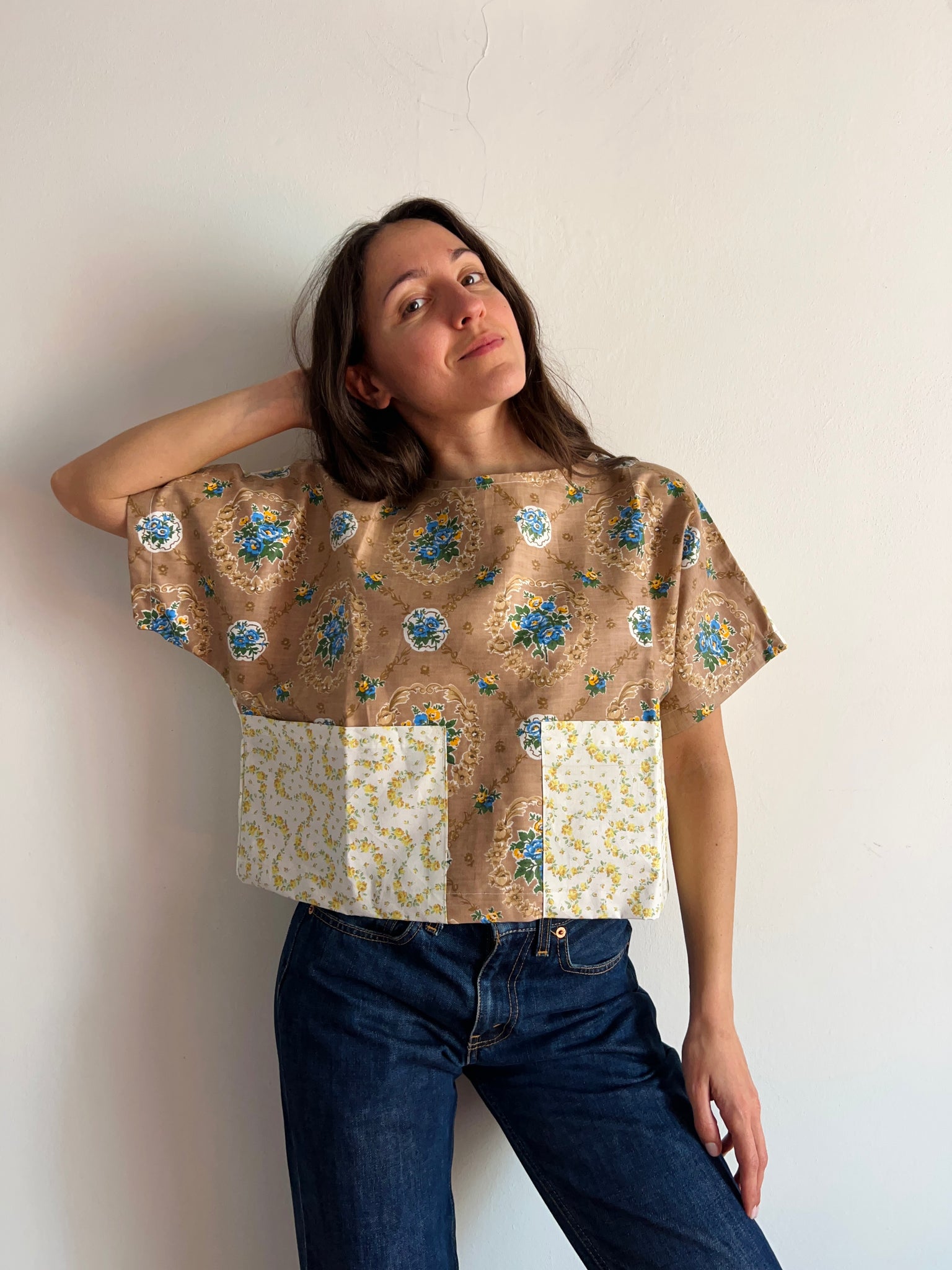 Maglietta handmade di cotone realizzata con tessuti vintage e di recupero. Due tessuti diversi abbinati per ogni maglietta.