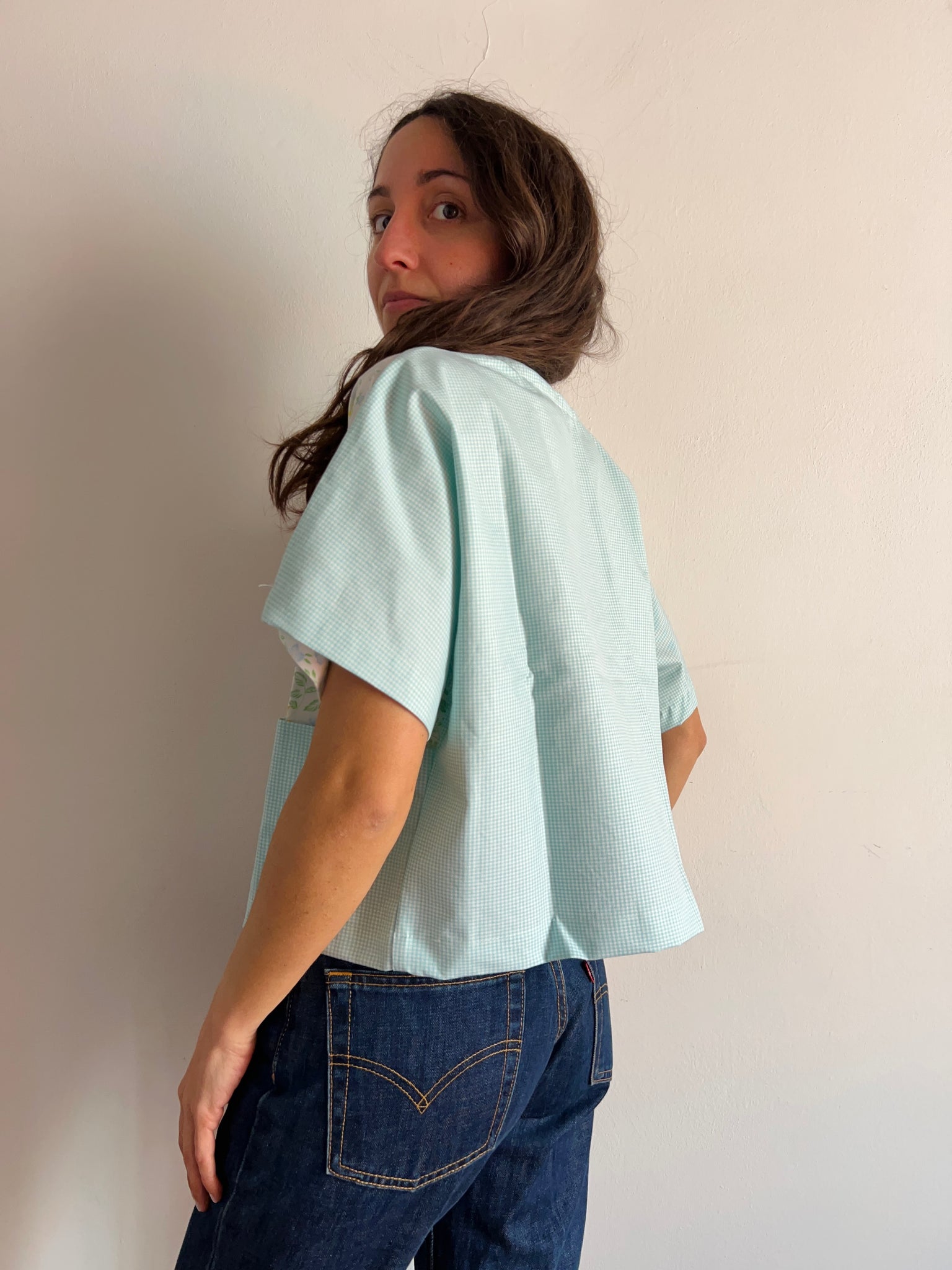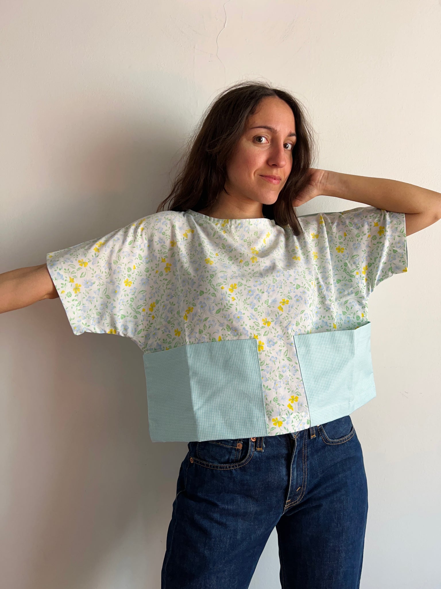 Maglietta handmade di cotone realizzata con tessuti vintage e di recupero. Due tessuti diversi abbinati per ogni maglietta.