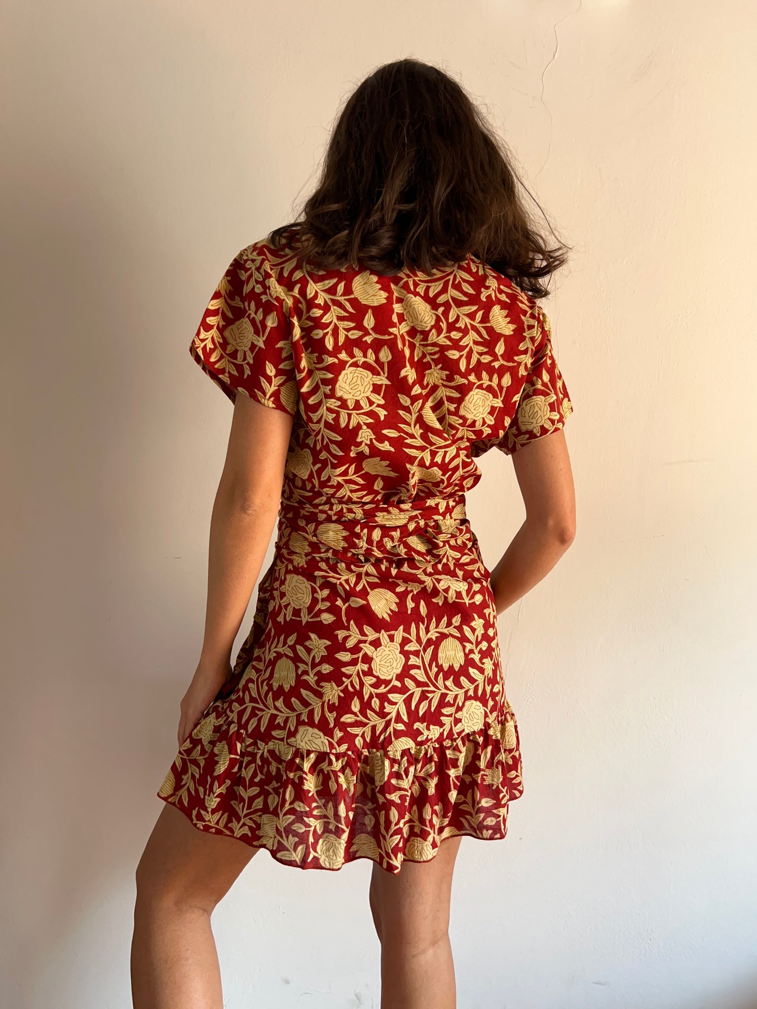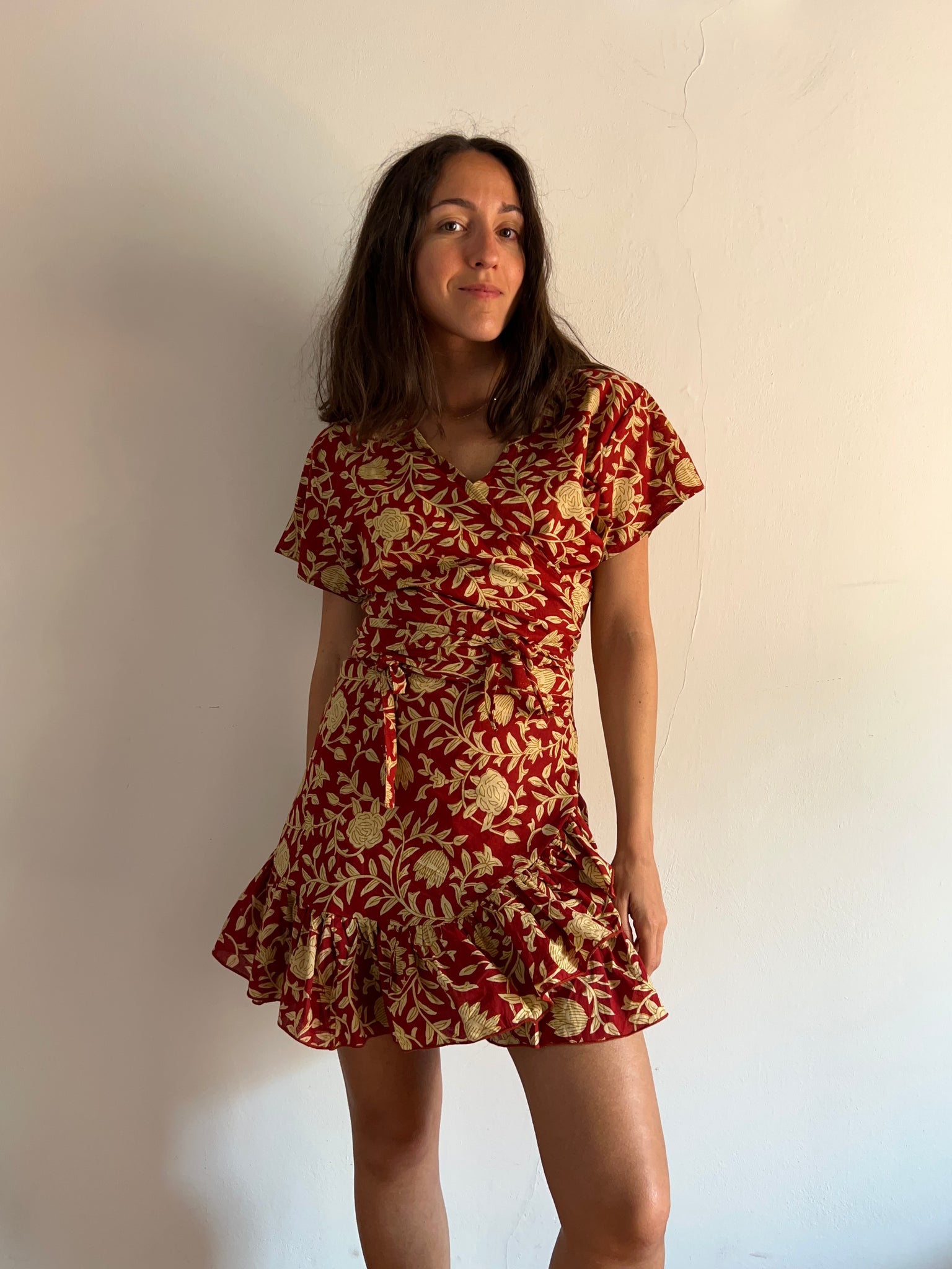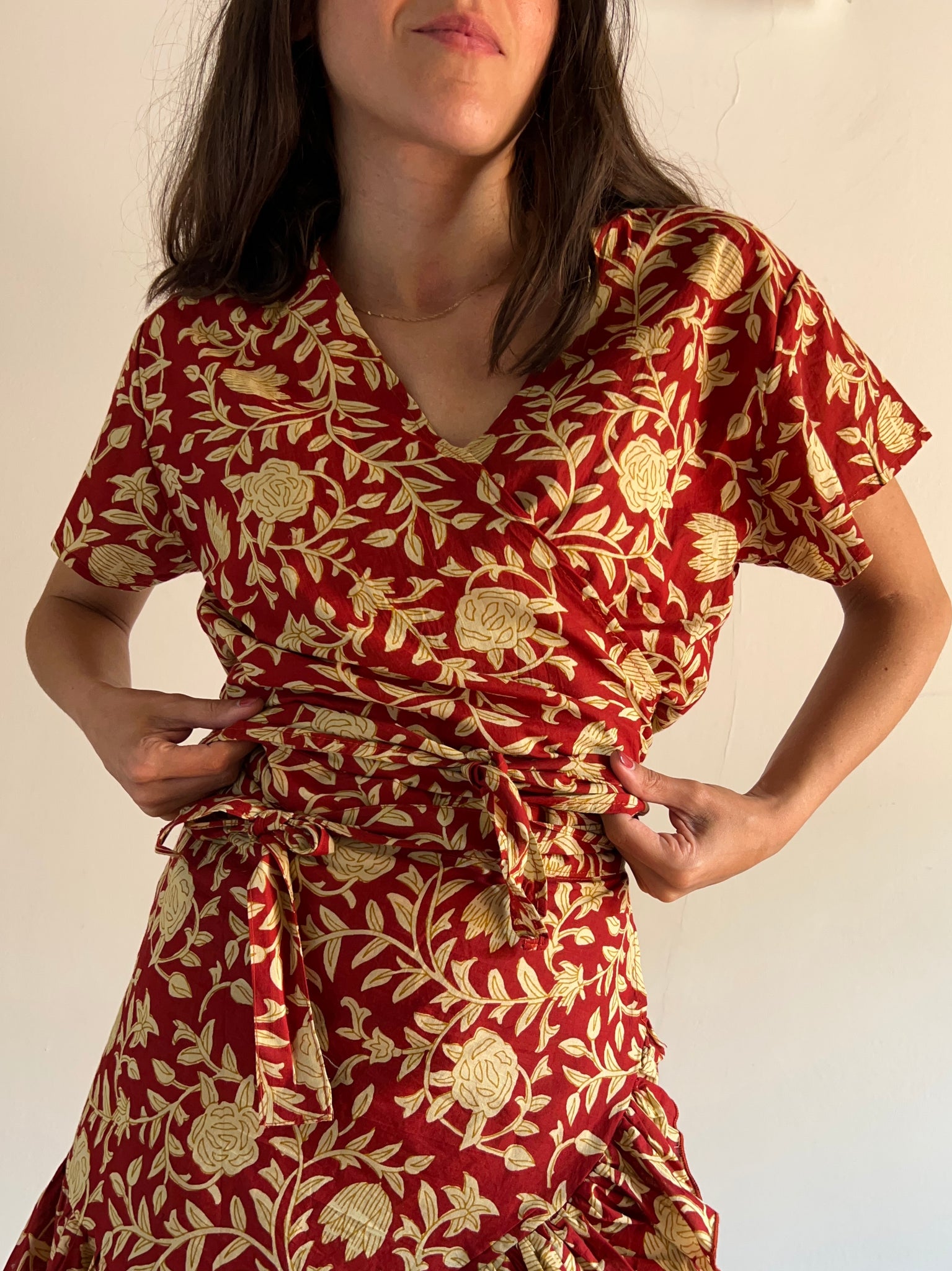 Top Made in India in puro cotone, modello incrociato a portafoglio, a manica corta.