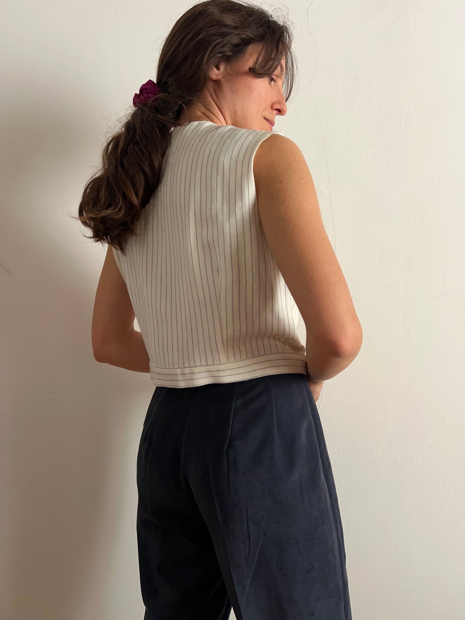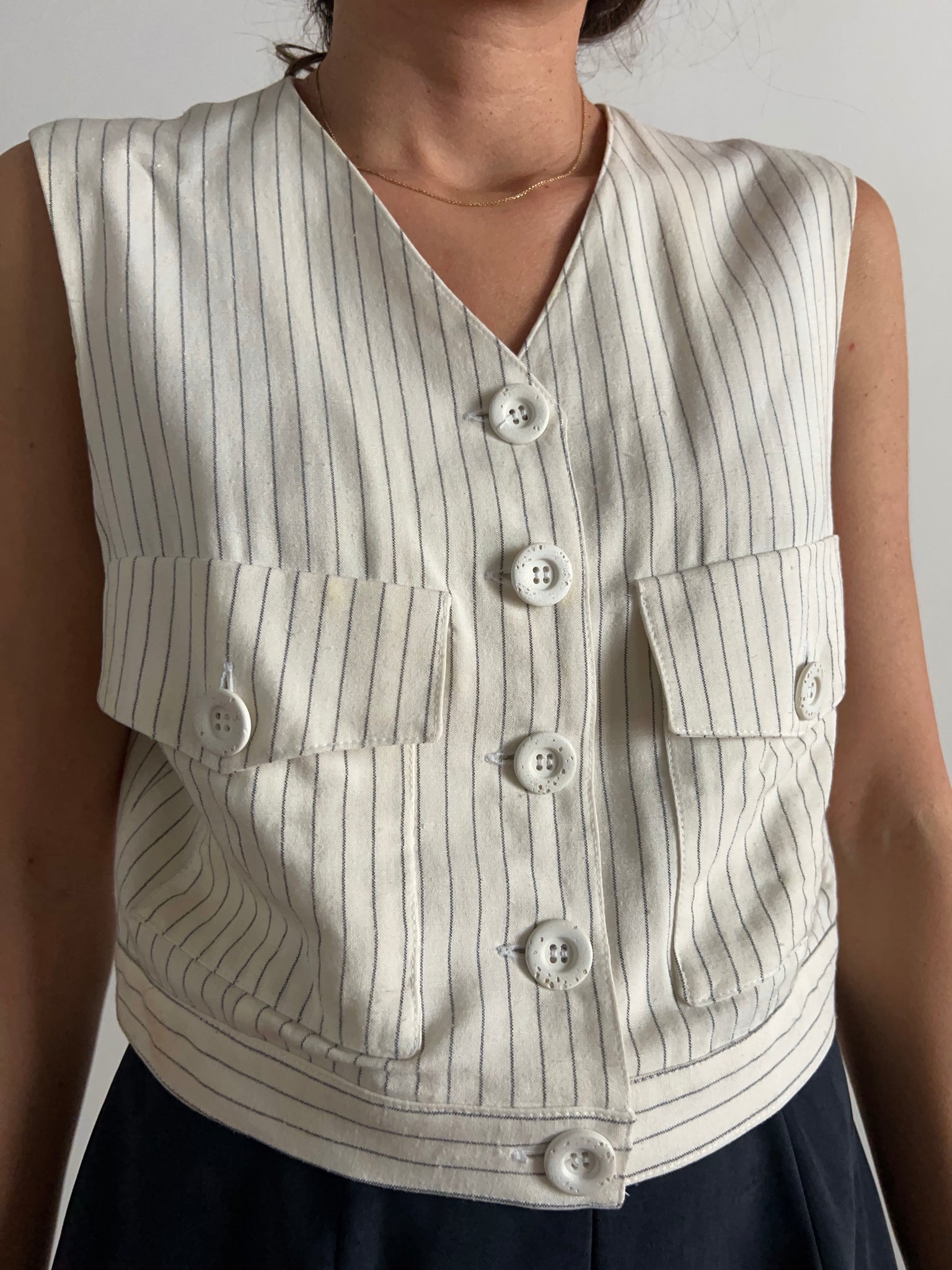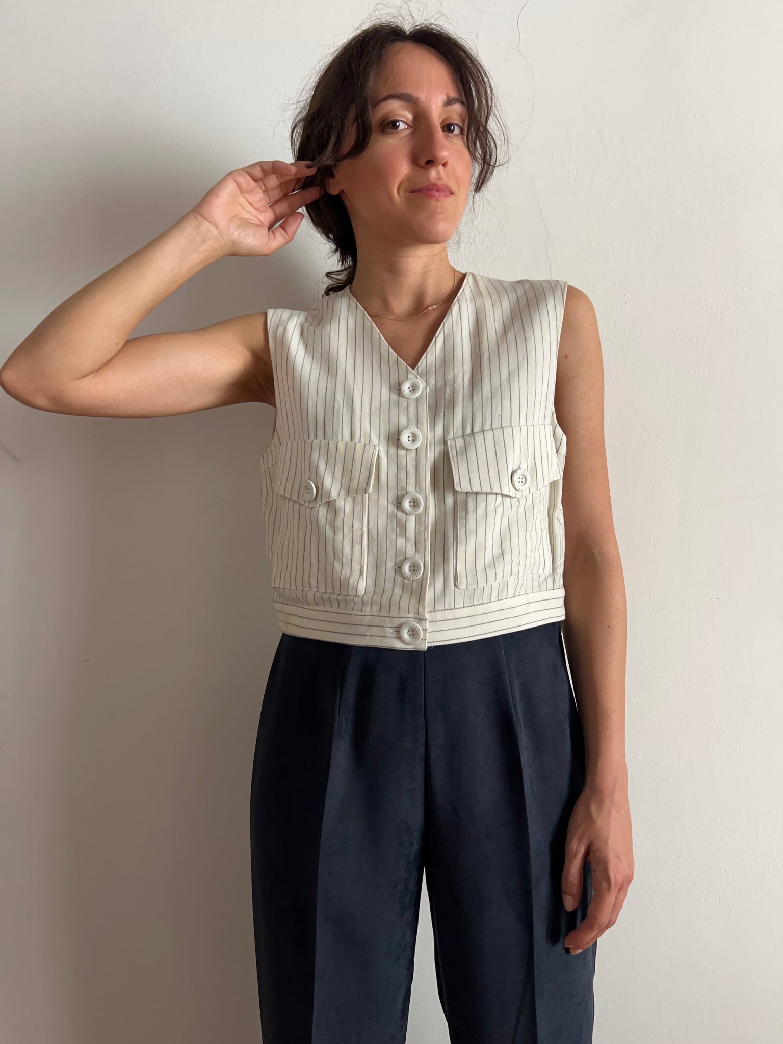 Può essere portato come top o anche come gilet, è vintage, in lino e viscosa, con bottoni e tasche frontali.