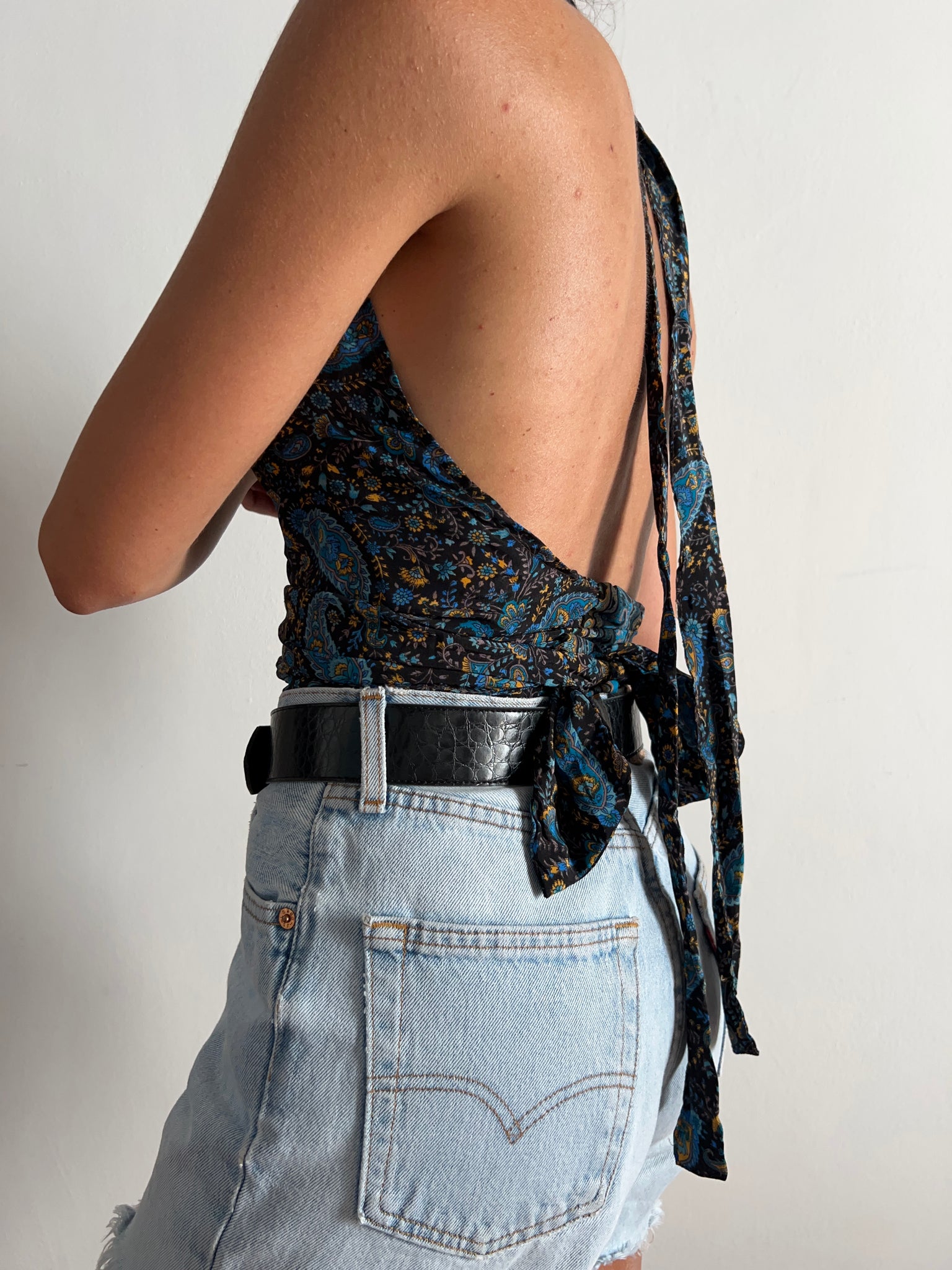 Si lega dietro il collo e sul punto vita, sulle più magre su può fare anche un doppio giro.