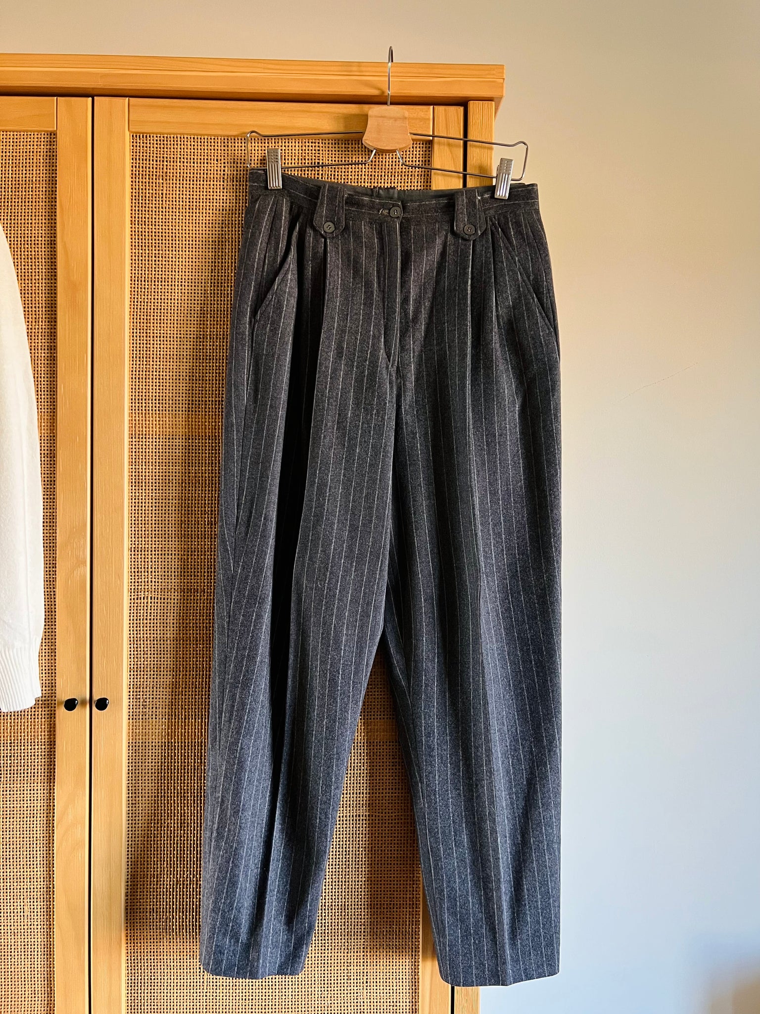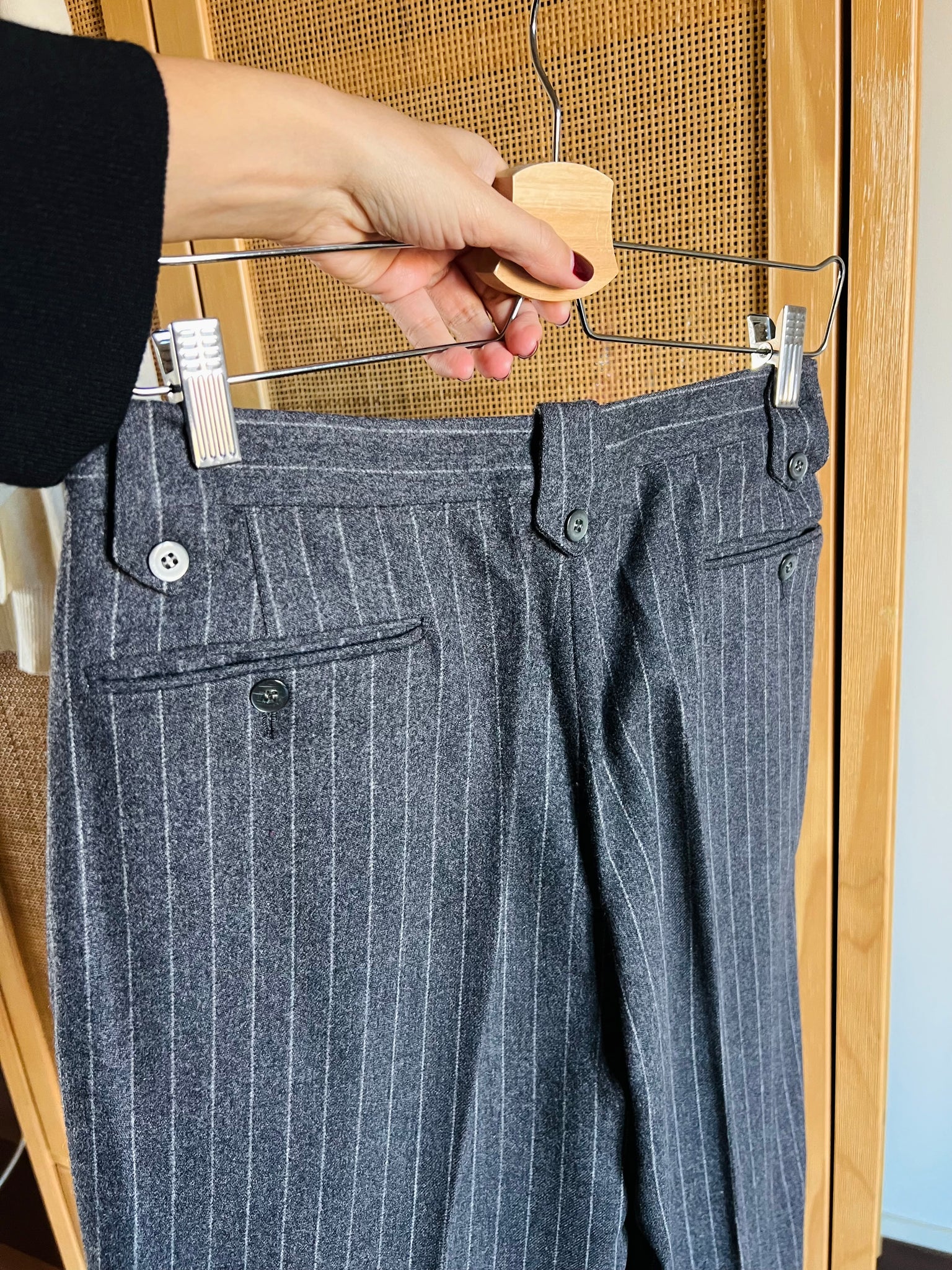 Pantalone a vita alte con pince, passanti e tasche. Girovita 74cm, fianchi 108cm, lunghezza gamba esterna 100cm.