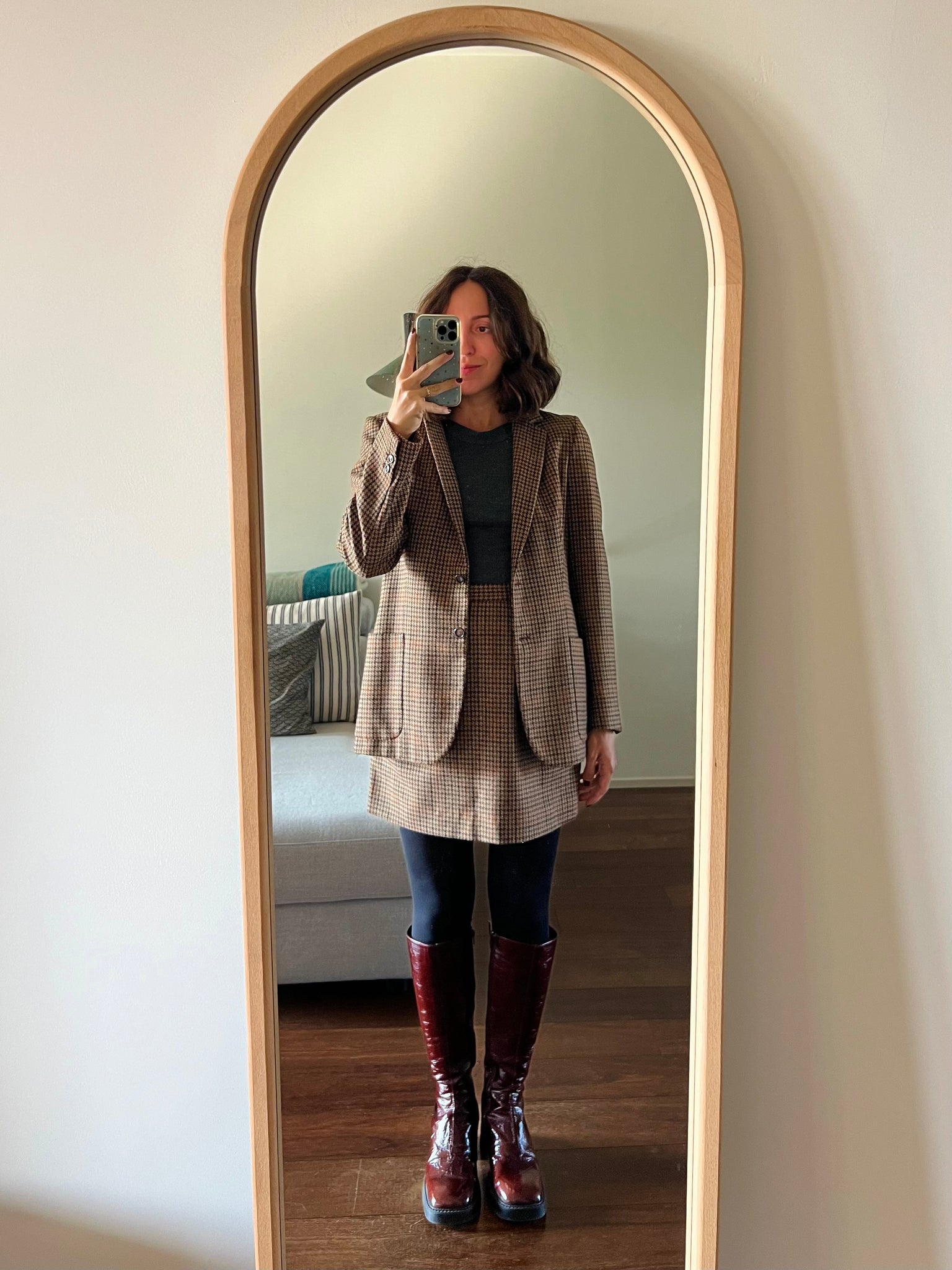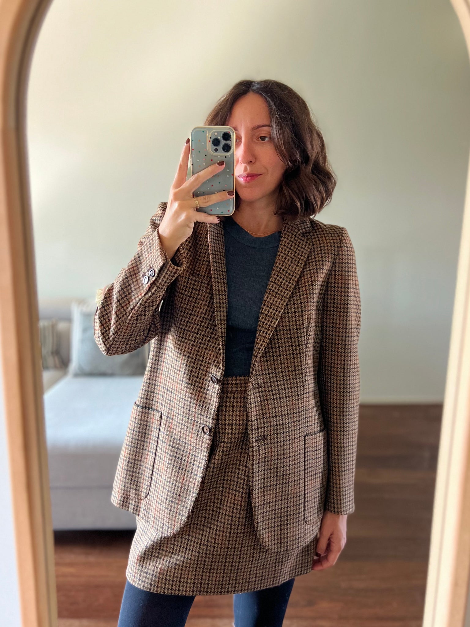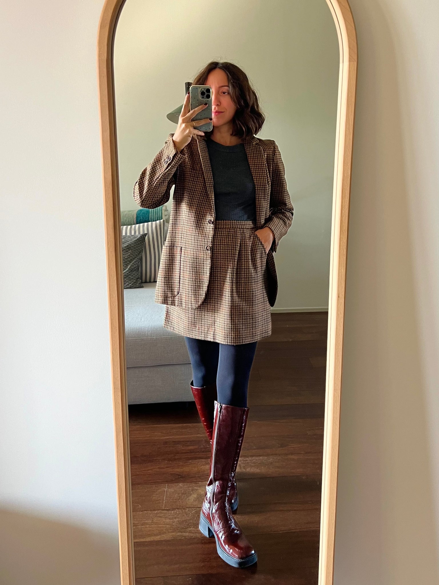 Gonna corta con pince e tasche. Girovita 74cm, fianchi 102cm, lunghezza 42cm.