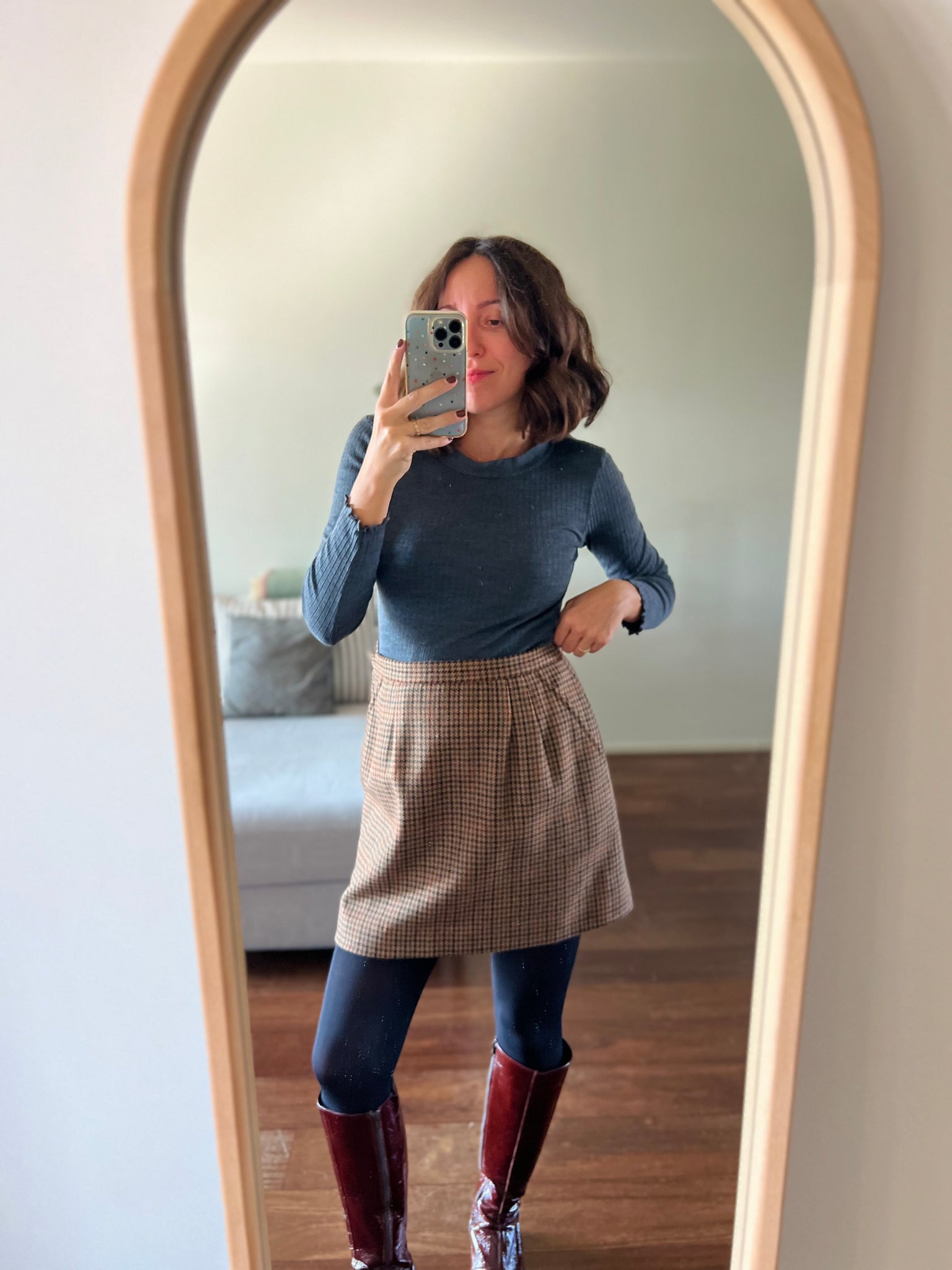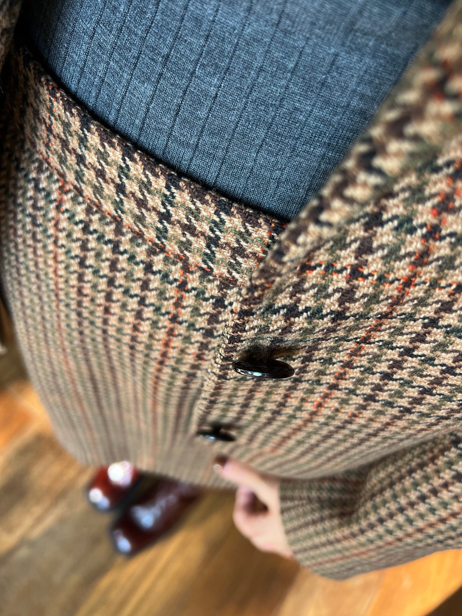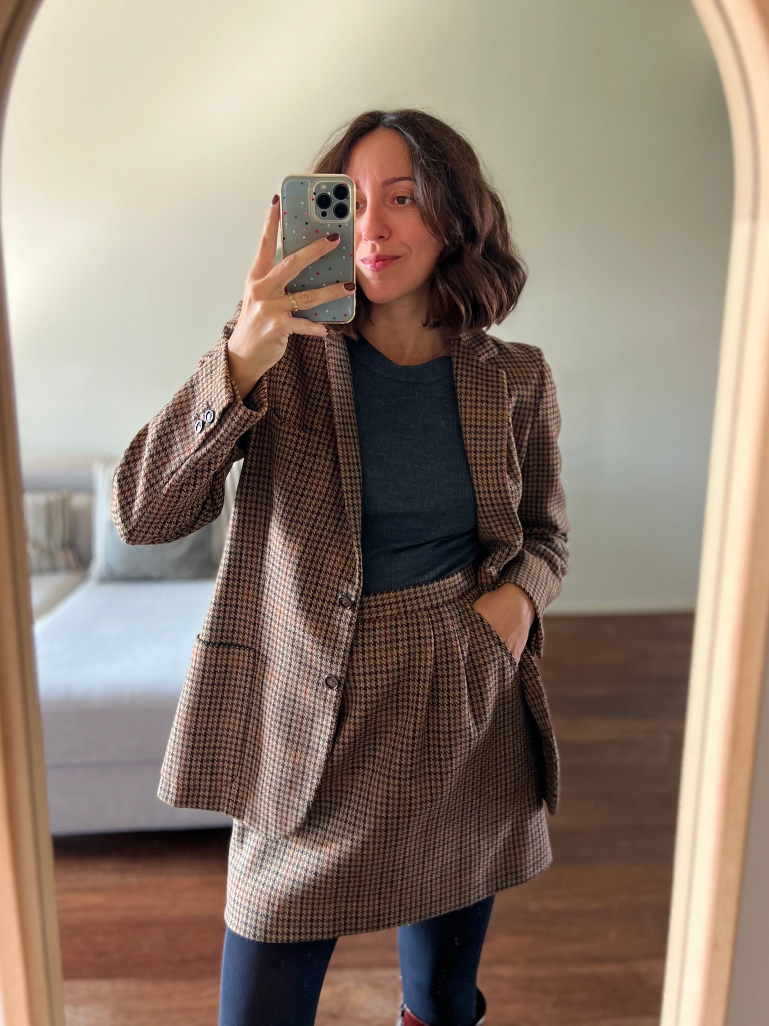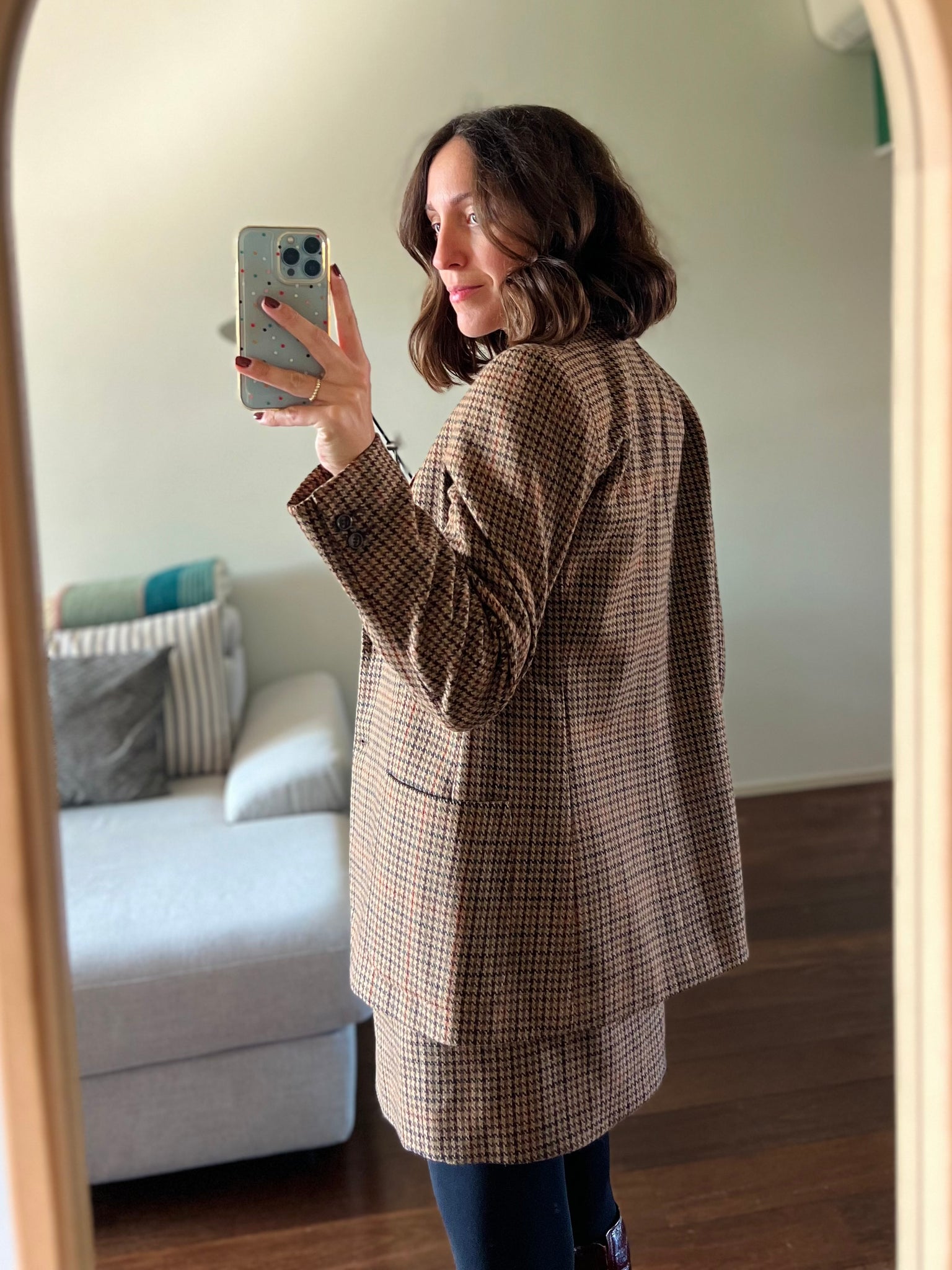 Gonna corta con pince e tasche. Girovita 74cm, fianchi 102cm, lunghezza 42cm.