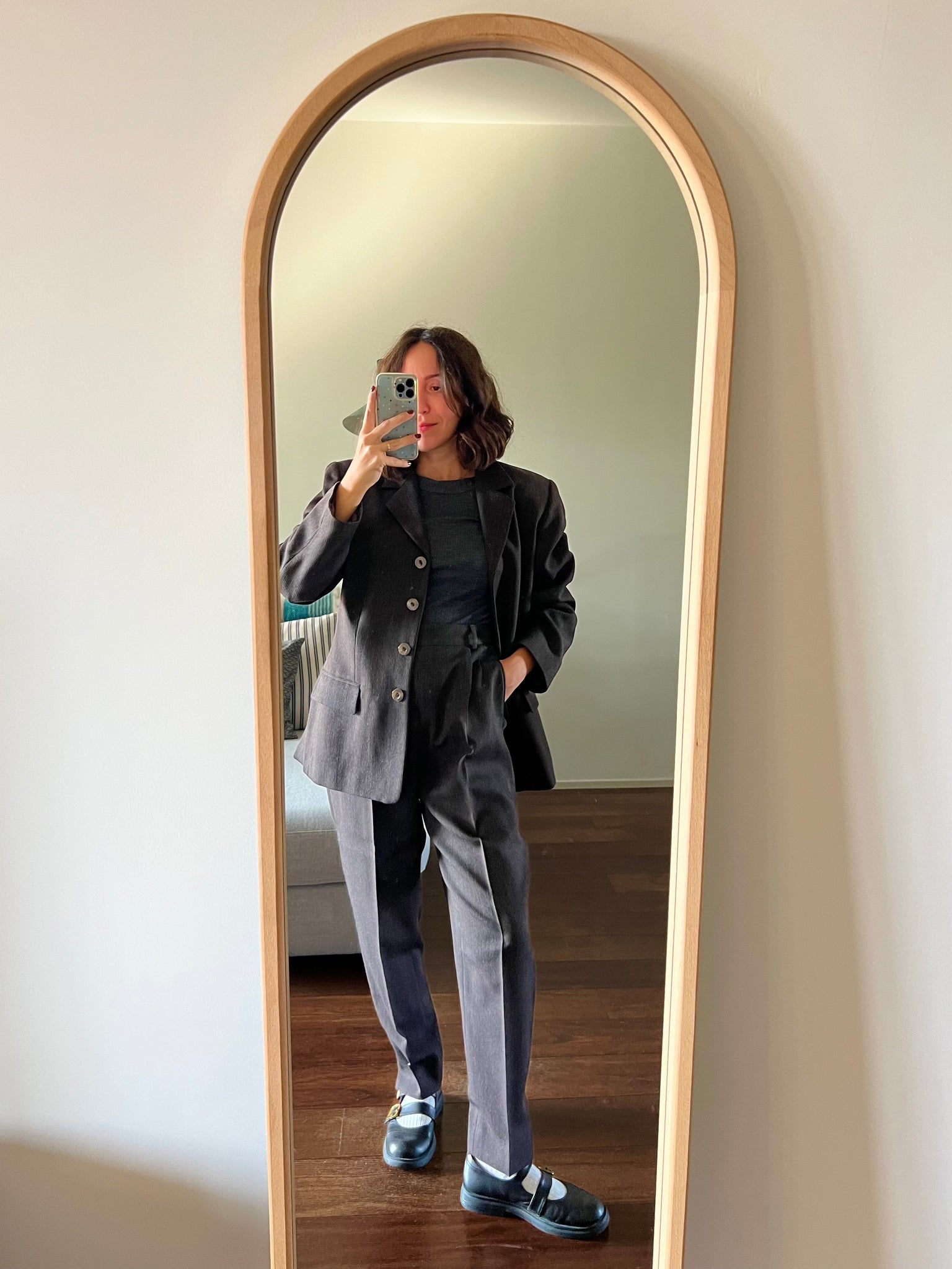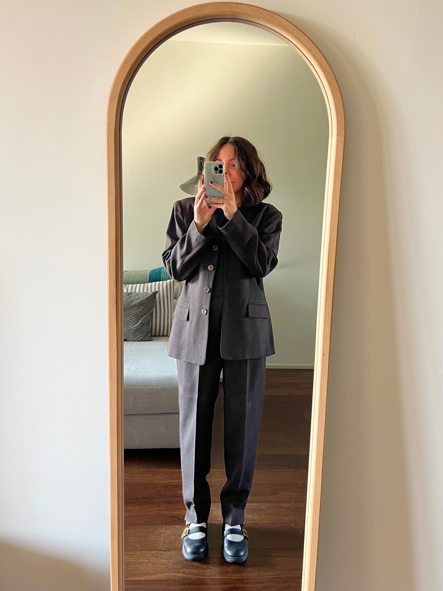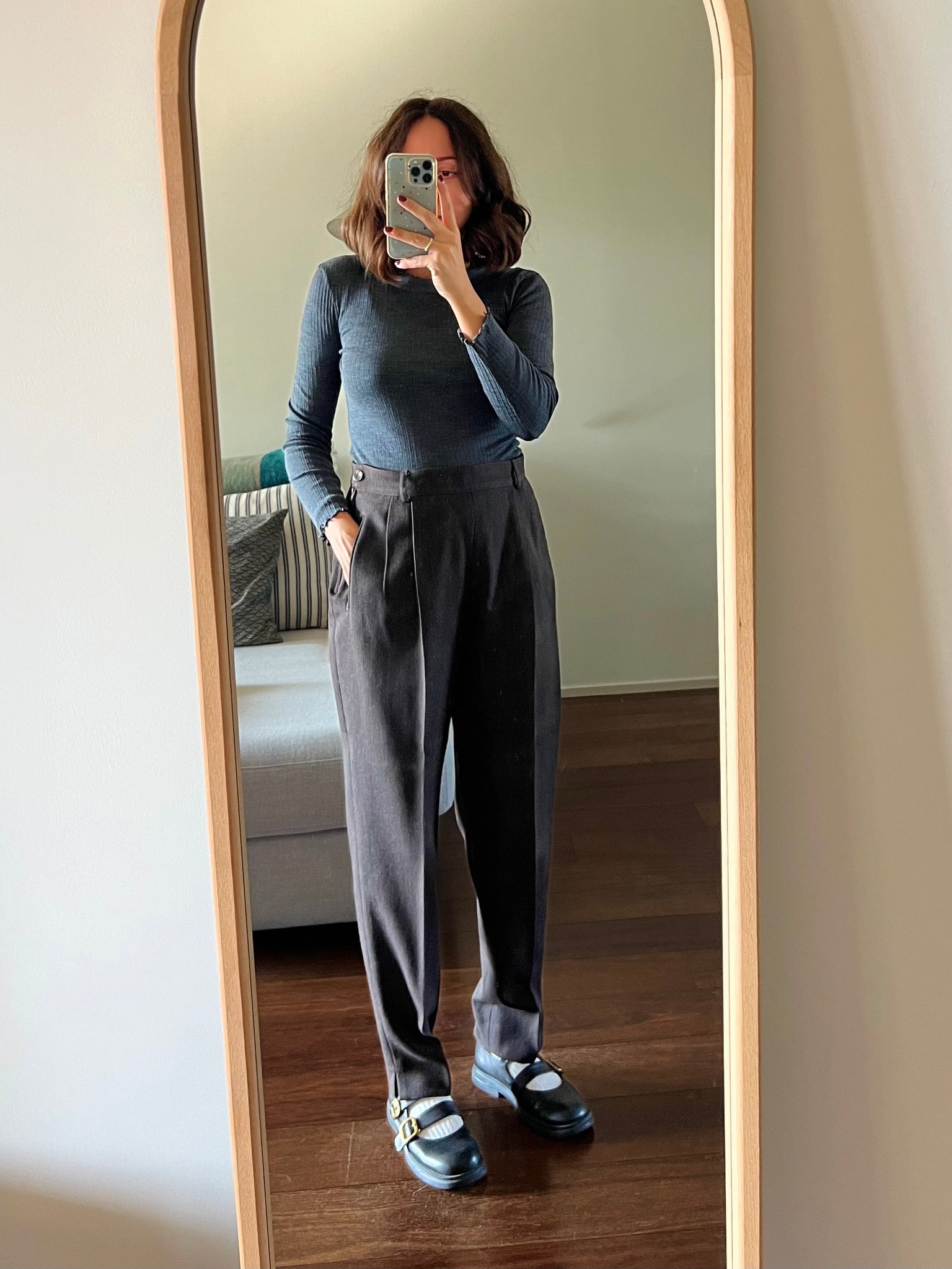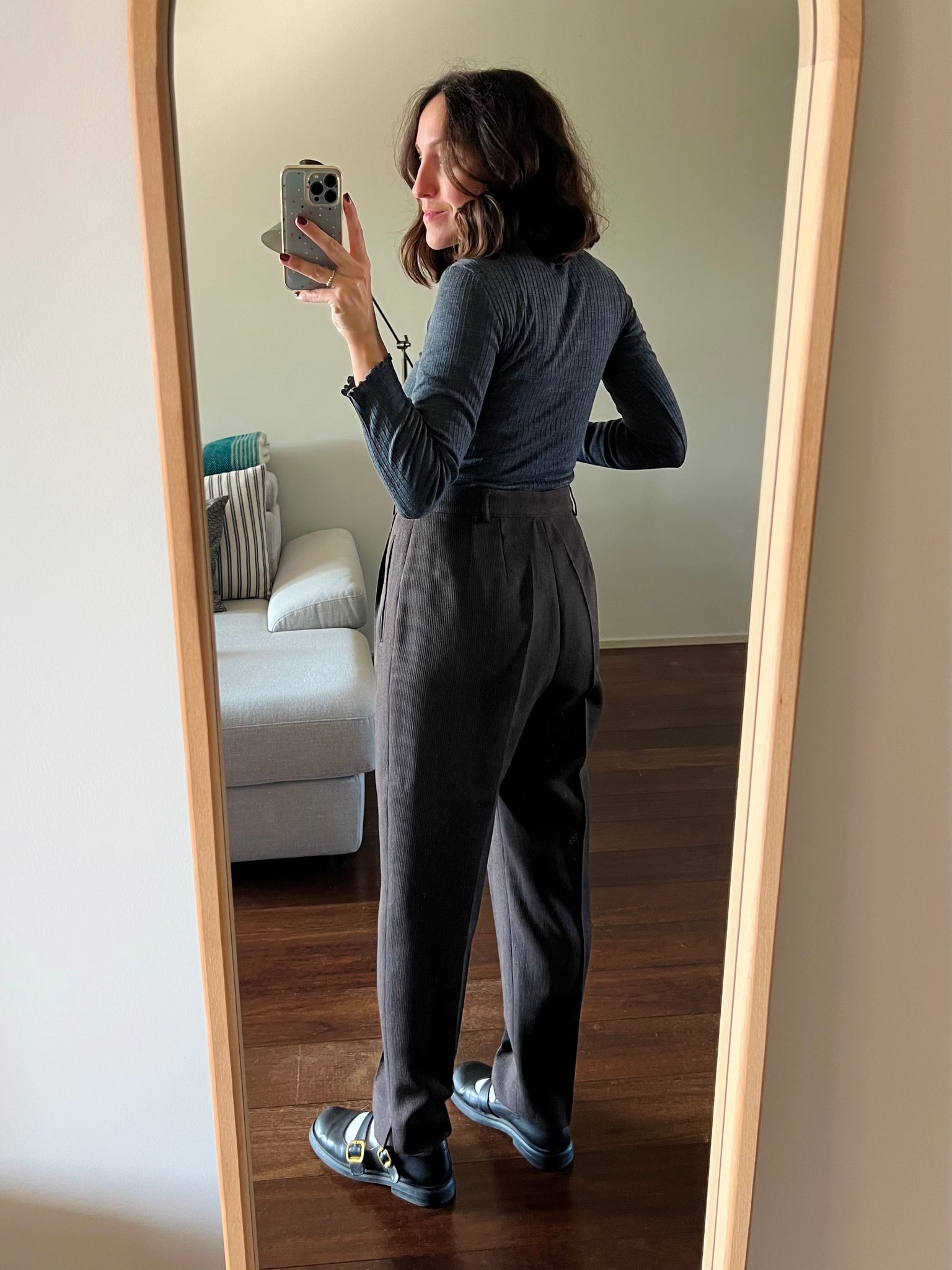 Pantalone a vita alta con pince, passanti e tasche. Girovita 80cm, fianchi 110cm, lunghezza gamba esterna 102cm.