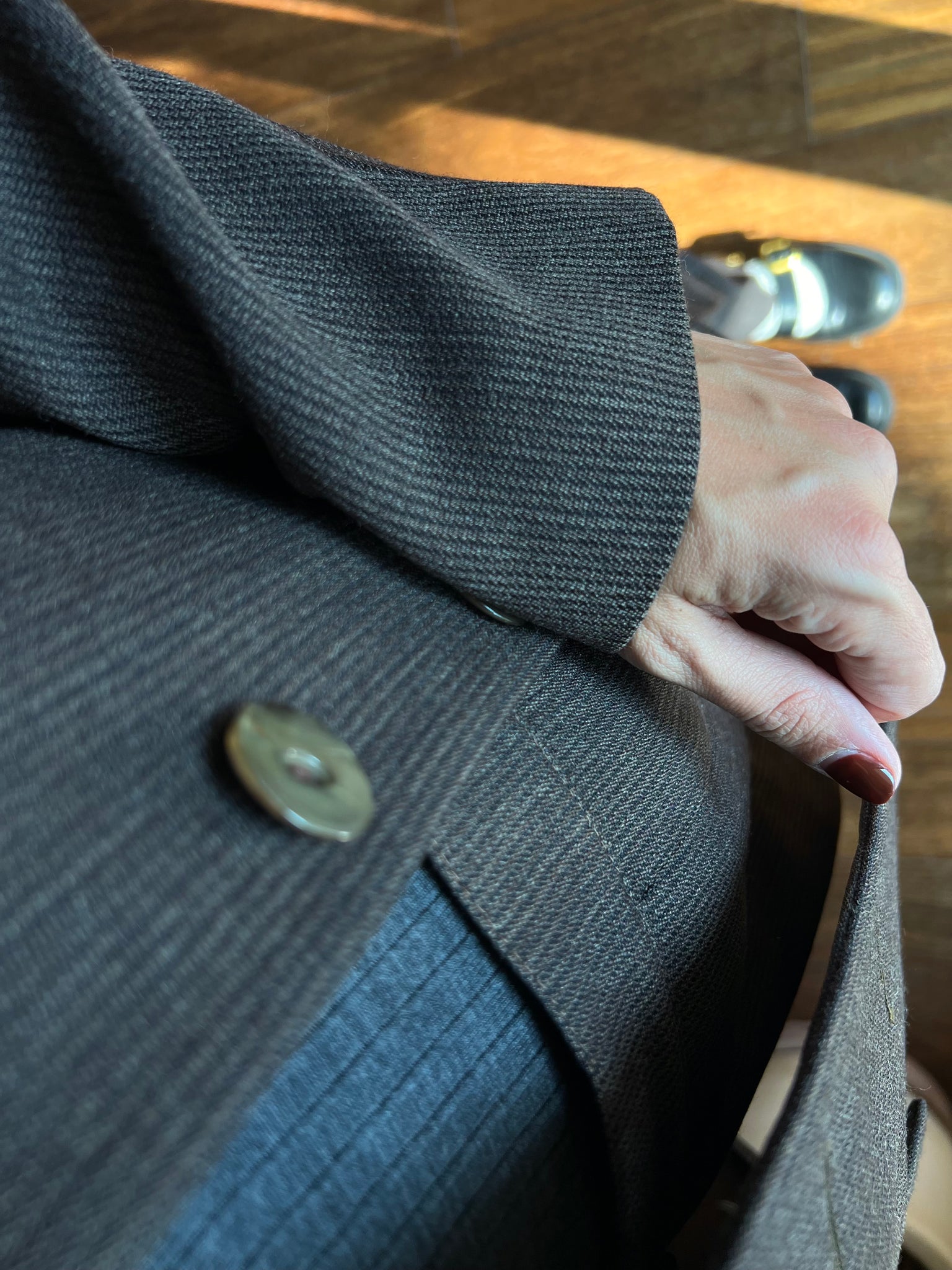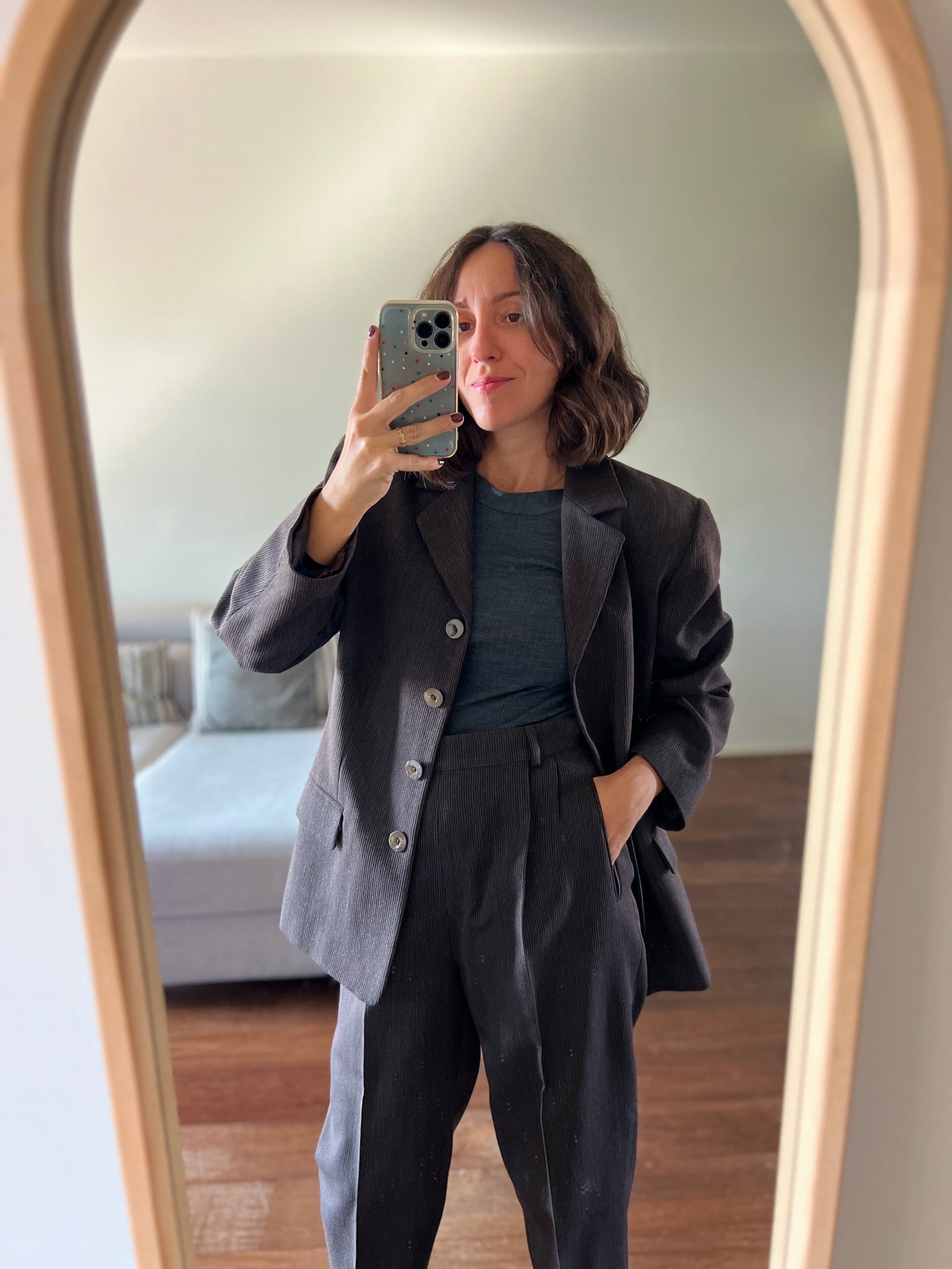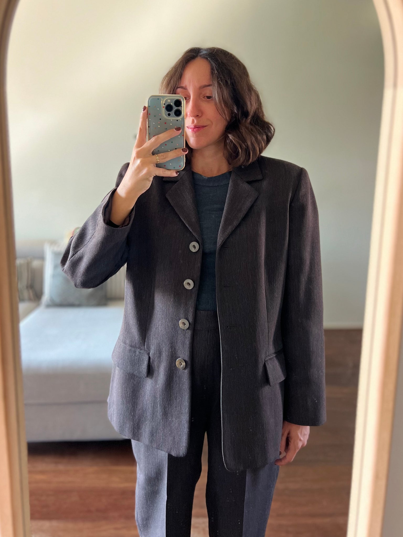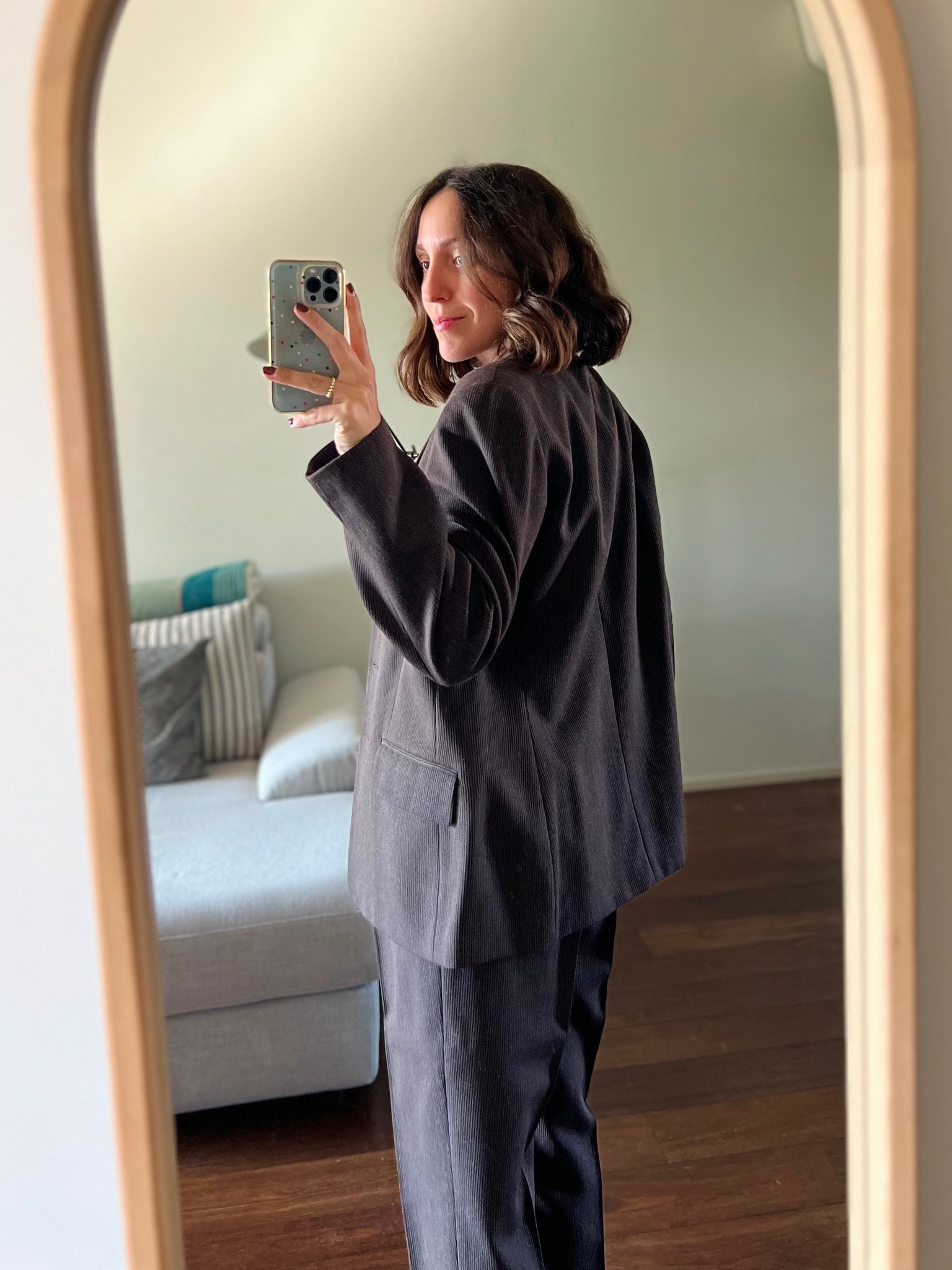 Pantalone a vita alta con pince, passanti e tasche. Girovita 80cm, fianchi 110cm, lunghezza gamba esterna 102cm.