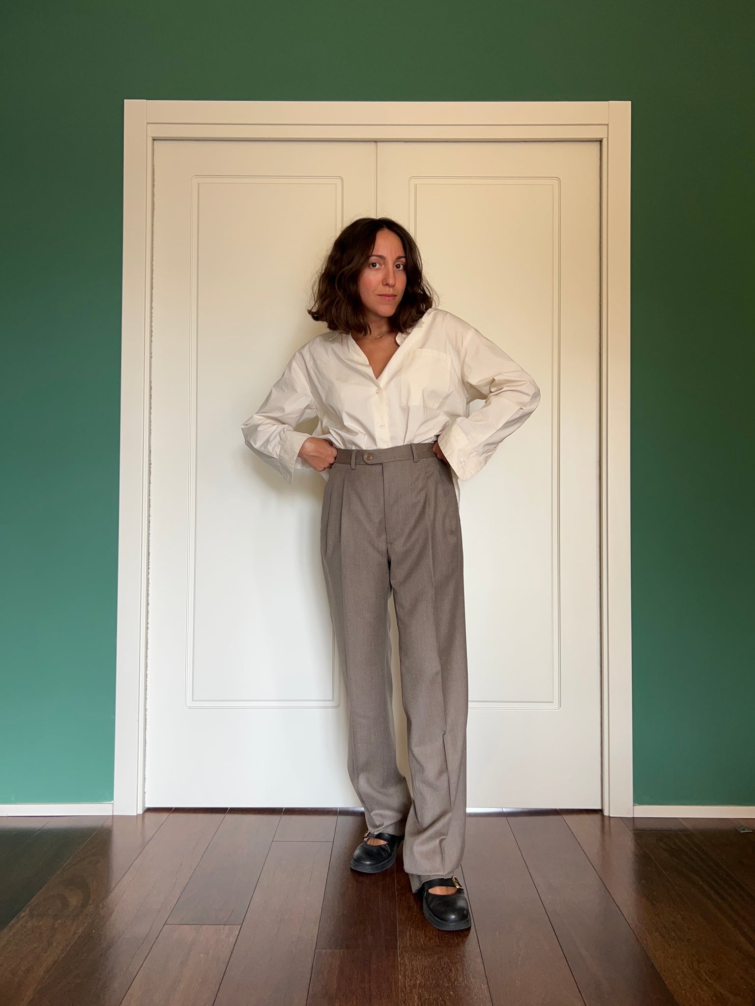 Pantalone con pince, passanti e tasche. Girovita 82cm. Fianchi 108cm. La gamba è lunga, l’orlo è da fare su misura come per tutti i pantaloni sartoriali.