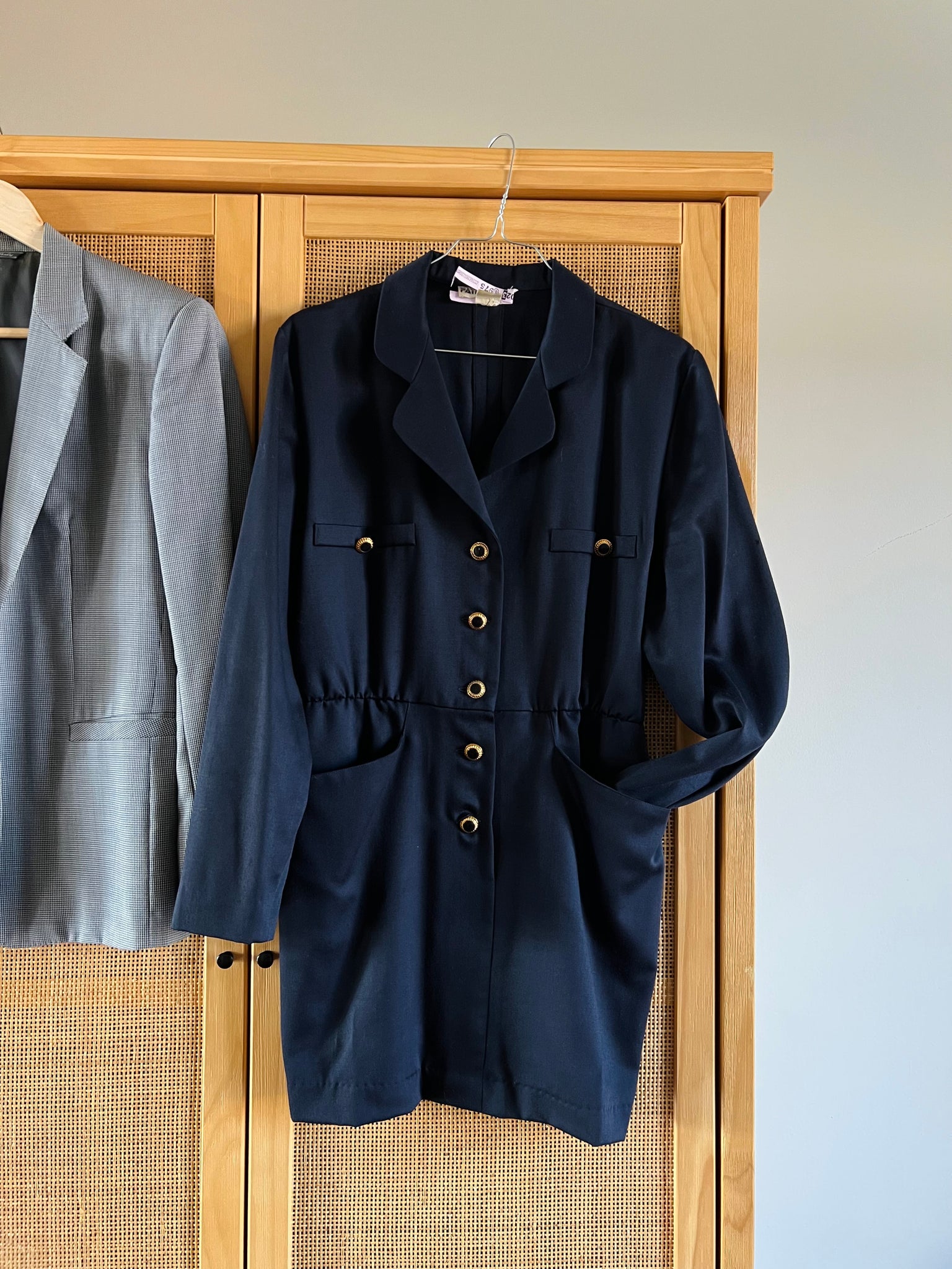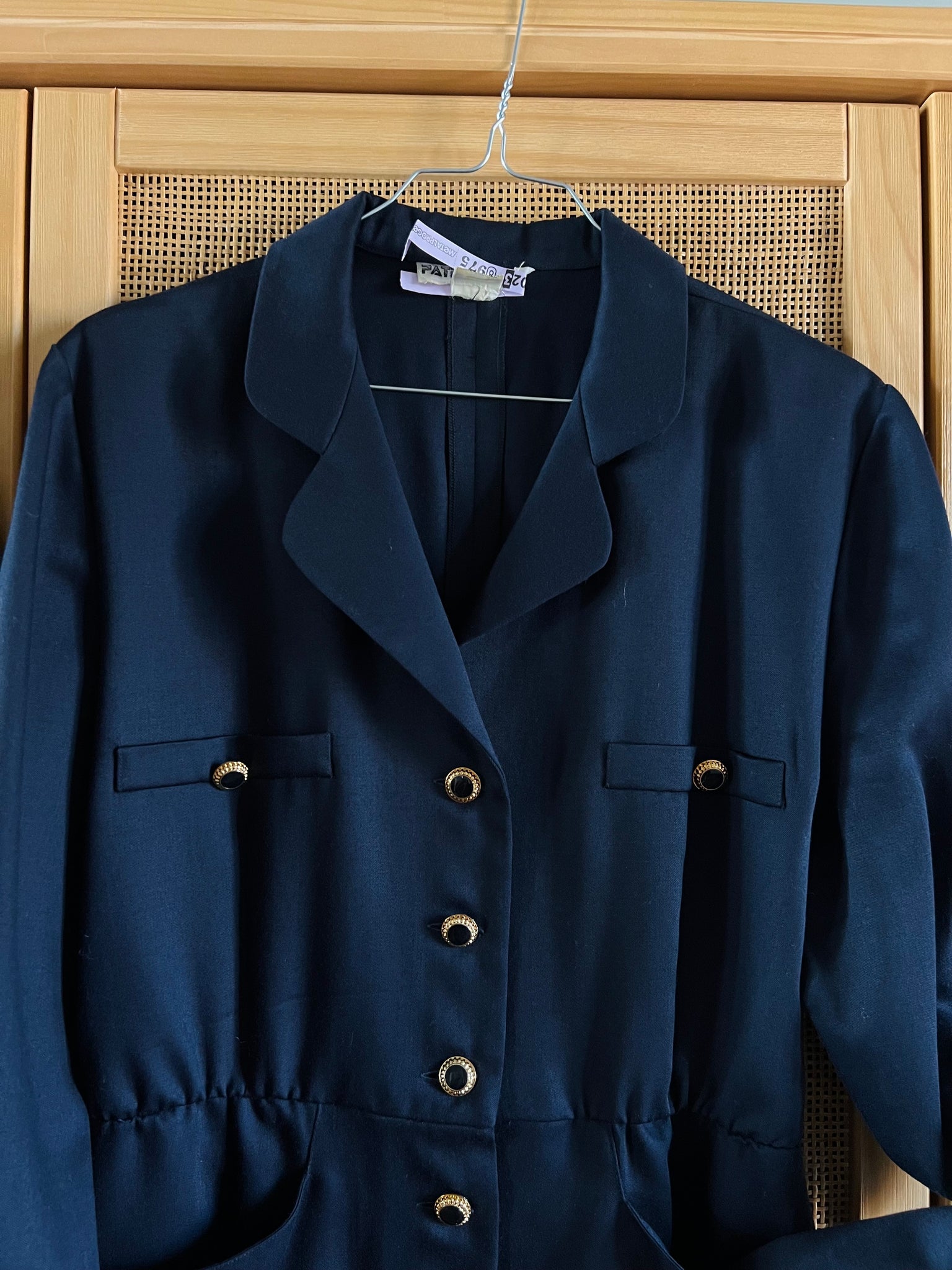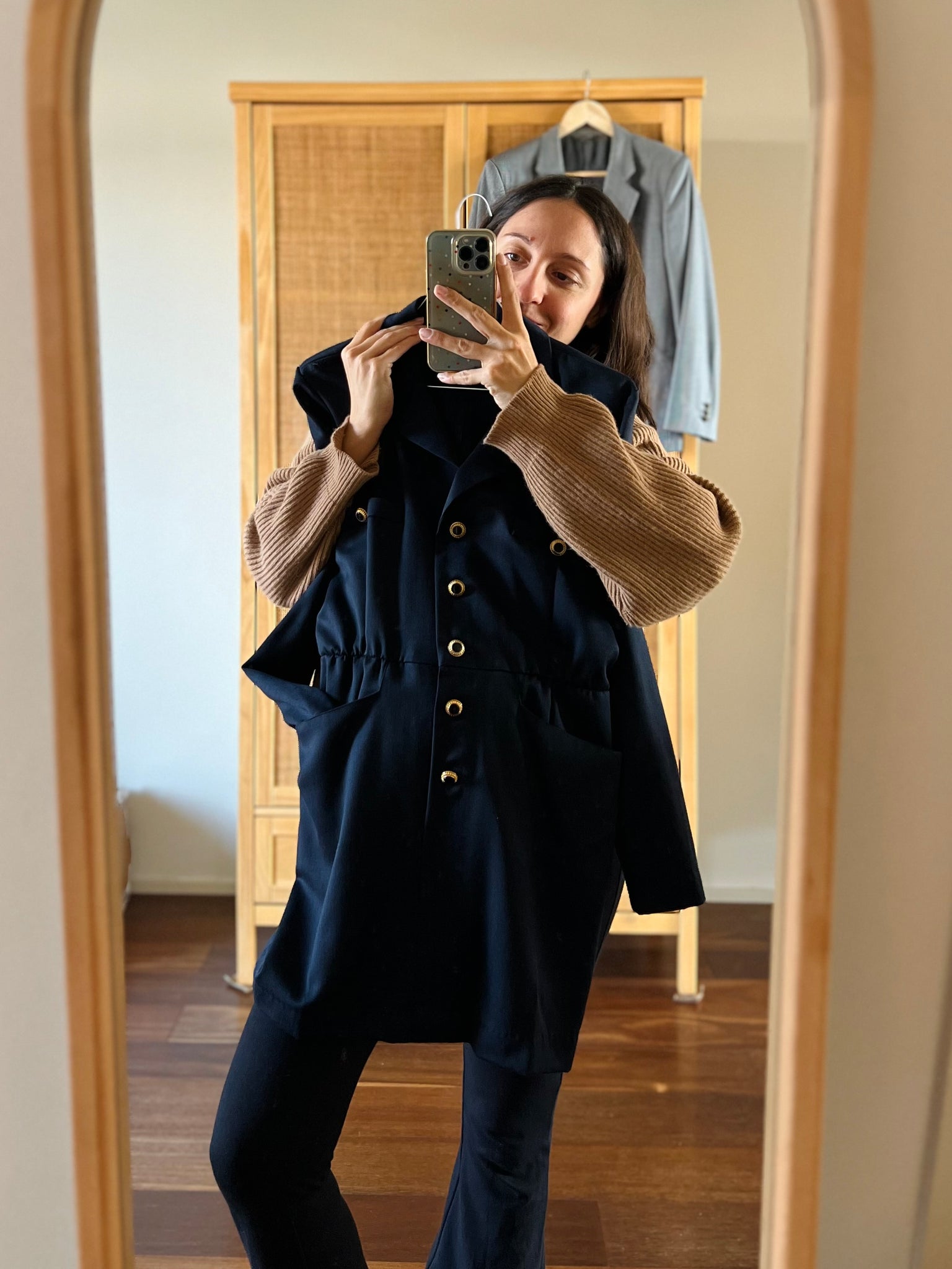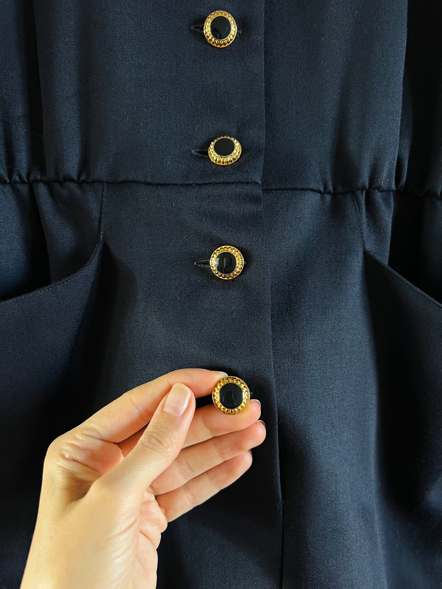 Grandi tasche frontali, bottoni dorati.