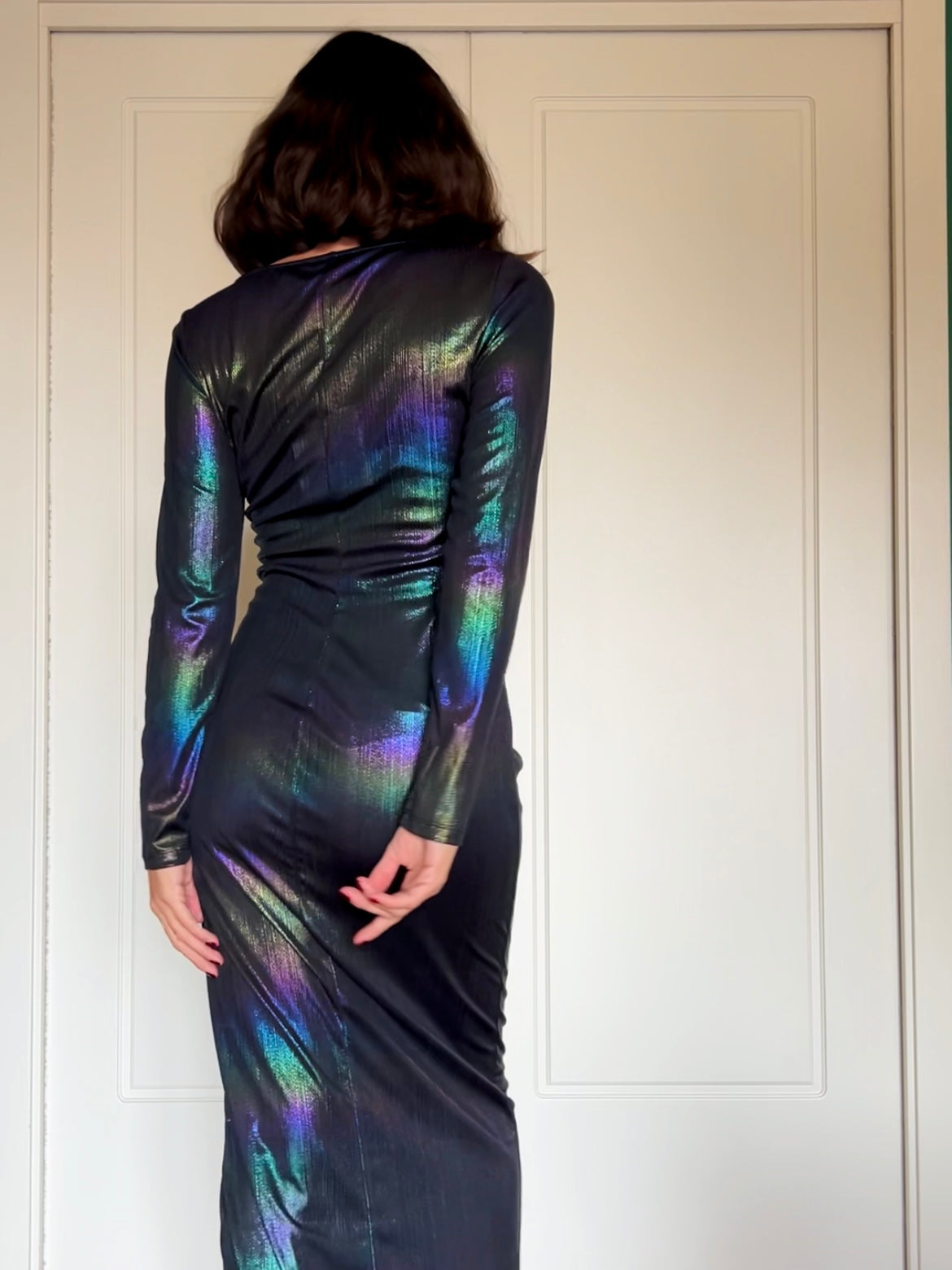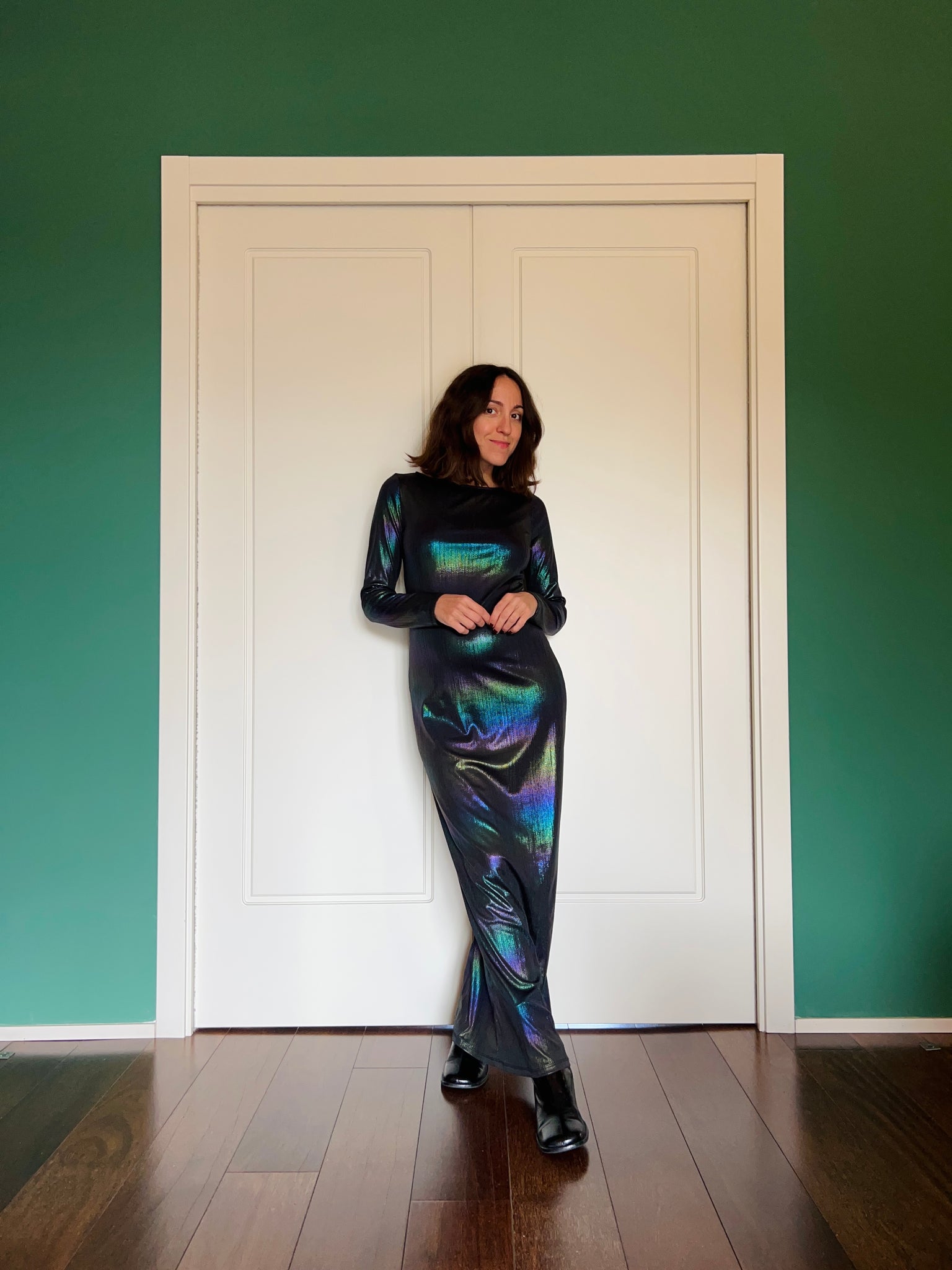 Abito sartoriale by Chiara Luppi, nuovo modello stretto a manica lunga, in tessuto elasticizzato cangiante in poliestere e viscosa.