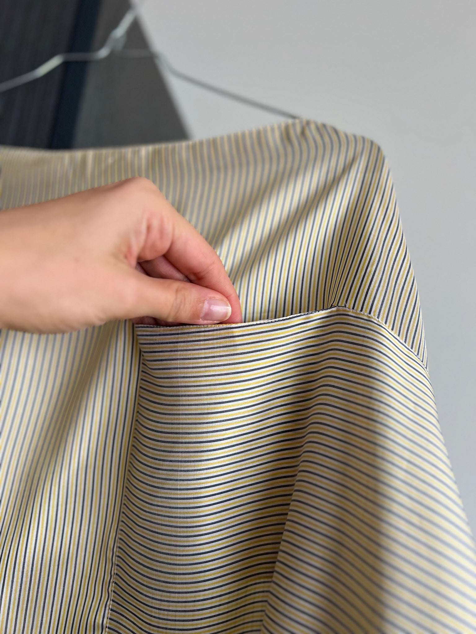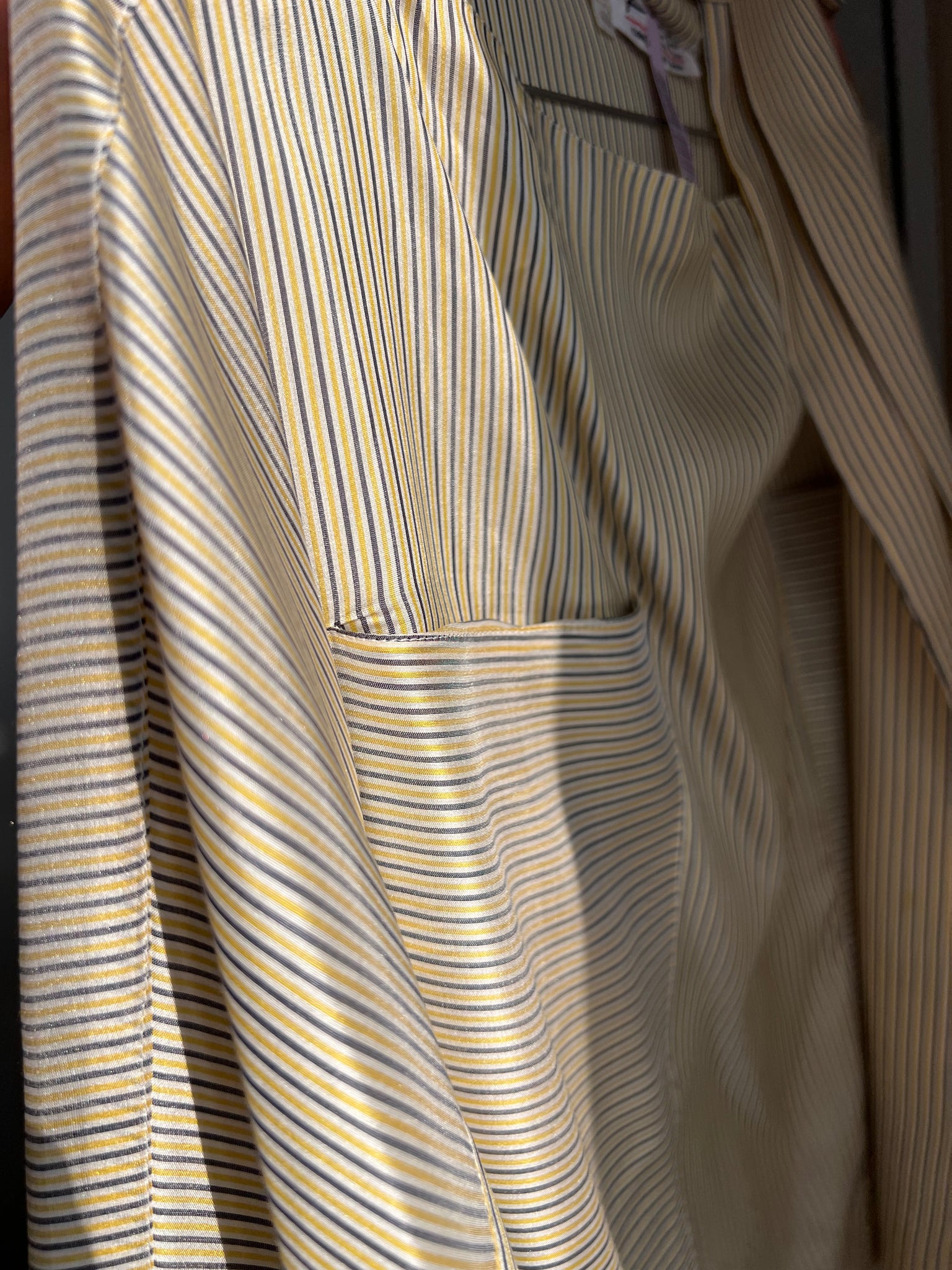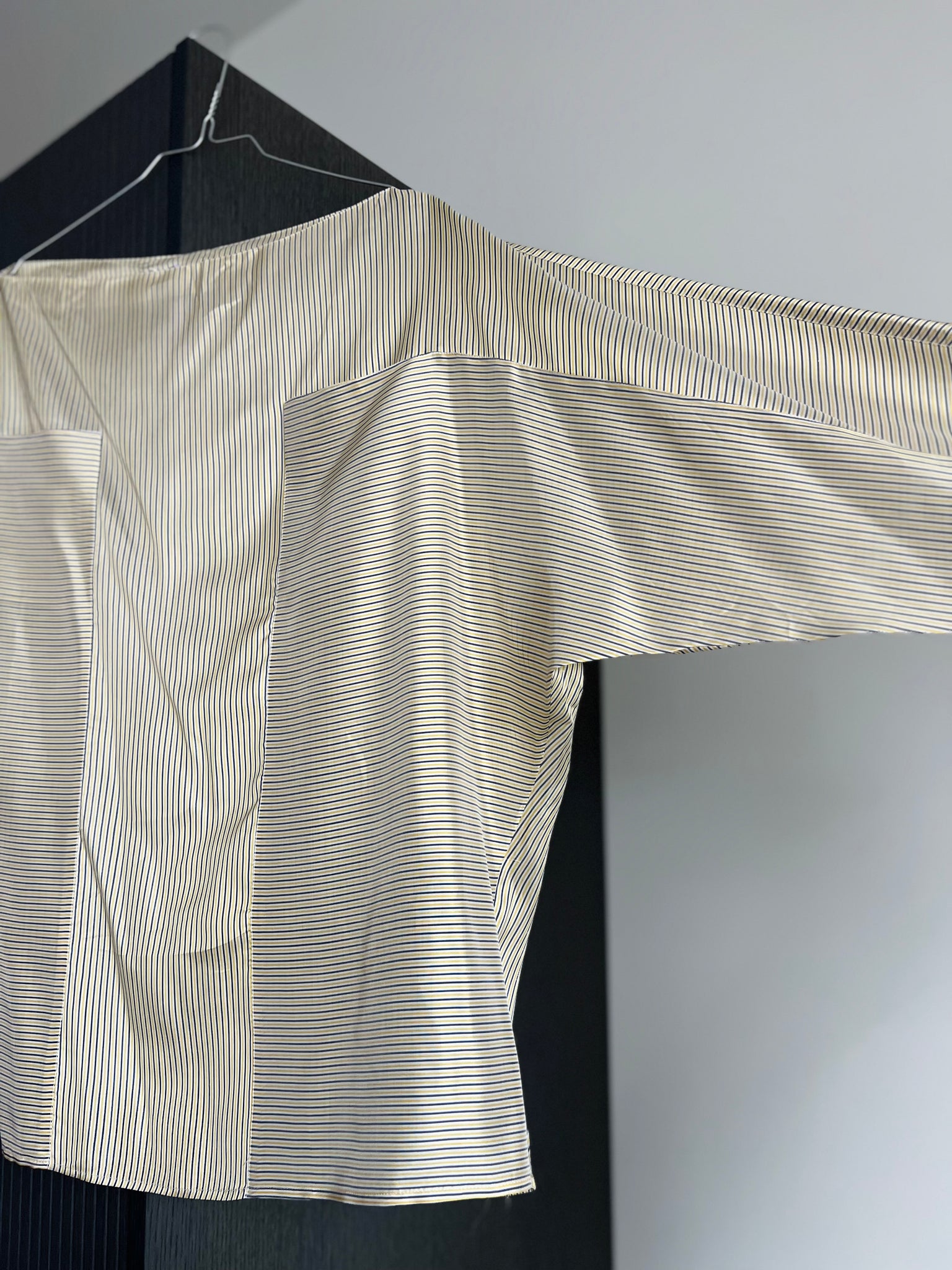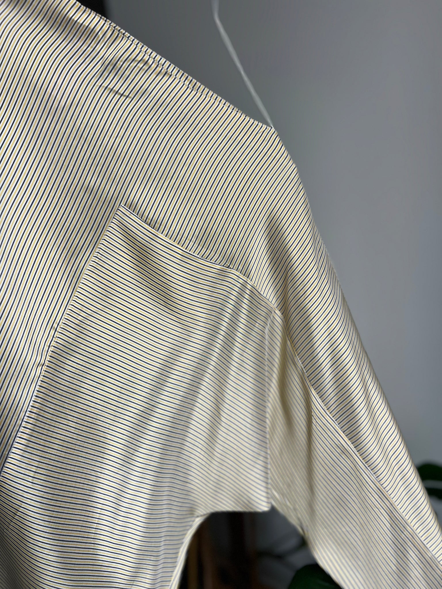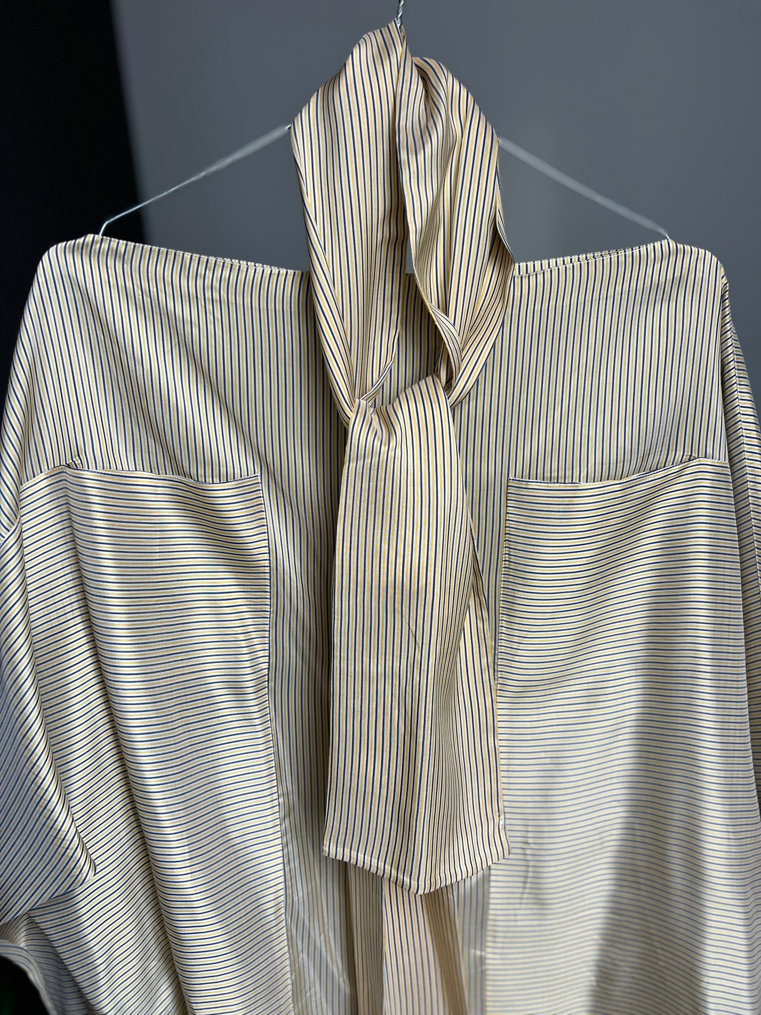 Modello ampio con scollo a barca, manica a kimono, tasche frontali, e nastro da legare al collo o in vita.