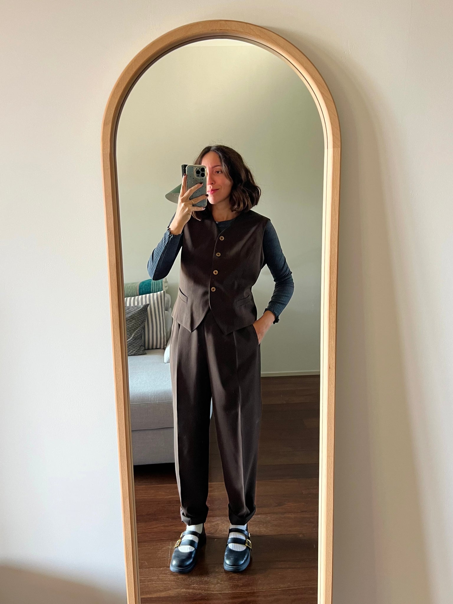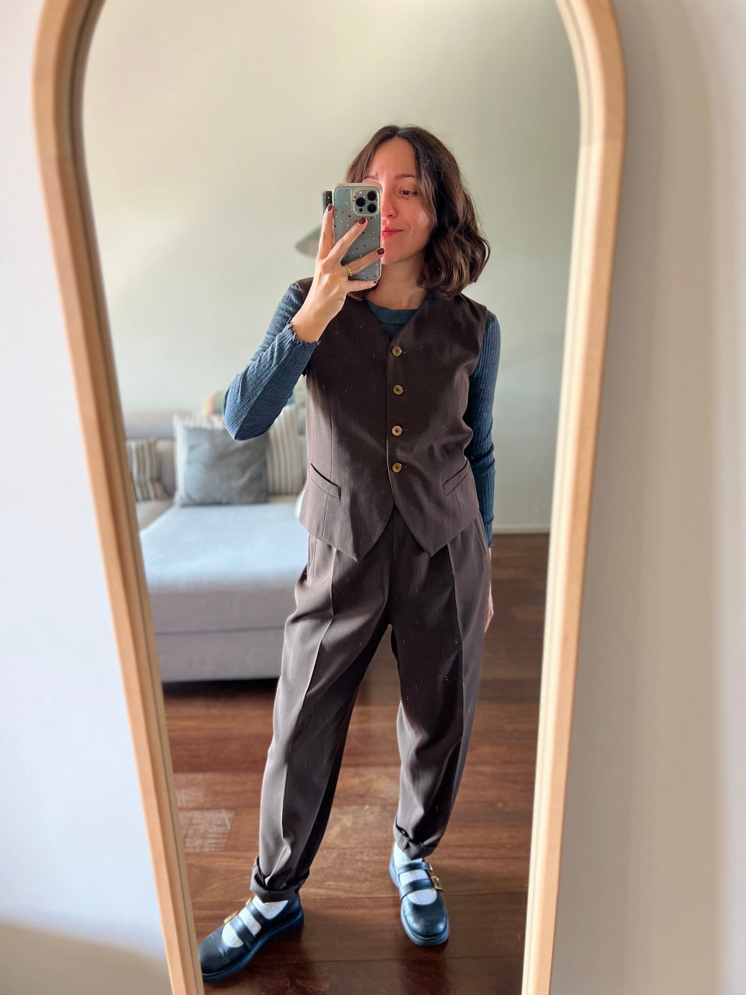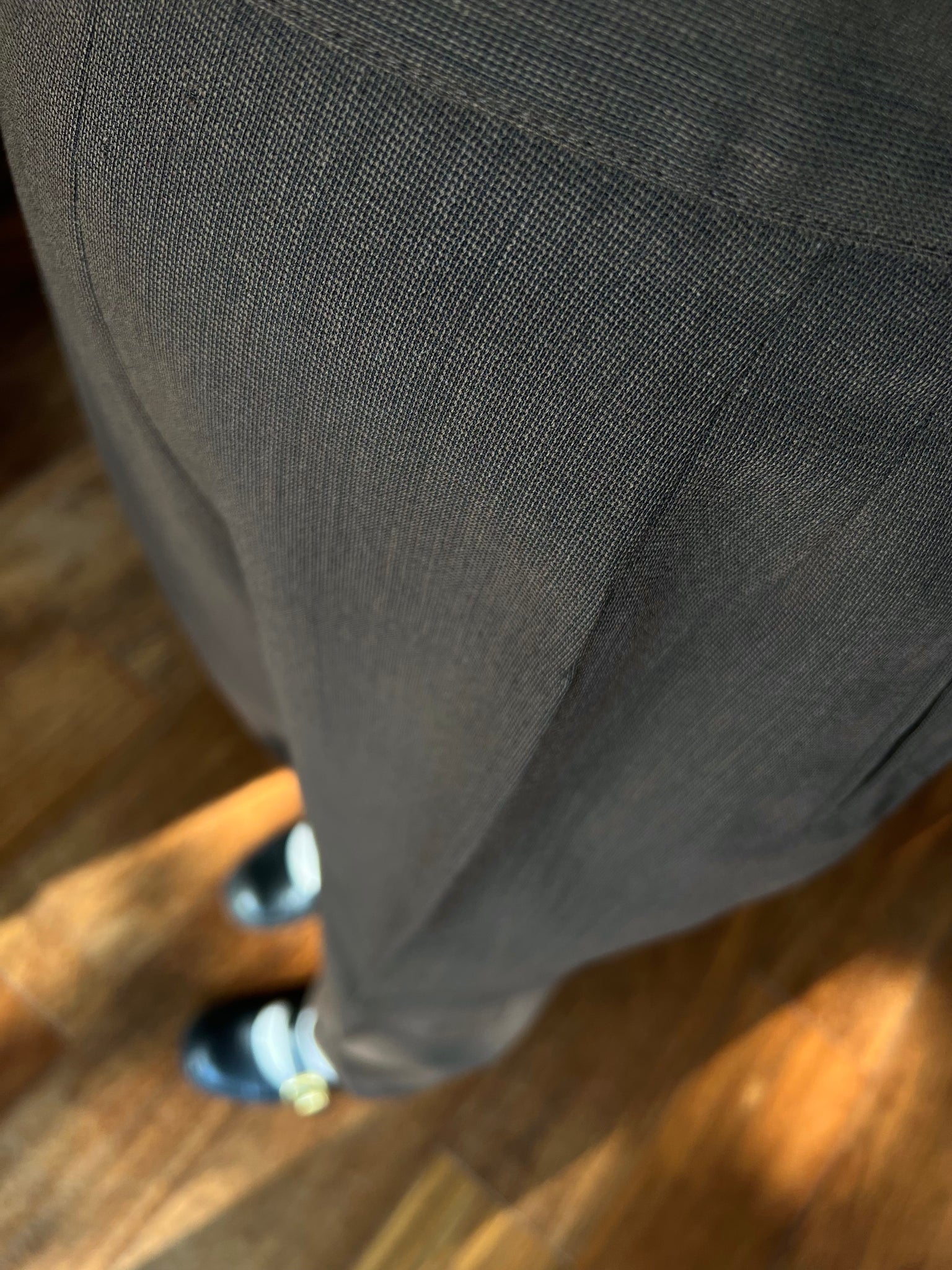 Pantalone a vita alta con tasche e piega. Girovita 81cm, fianchi 108cm, lunghezza gamba esterna 106cm.