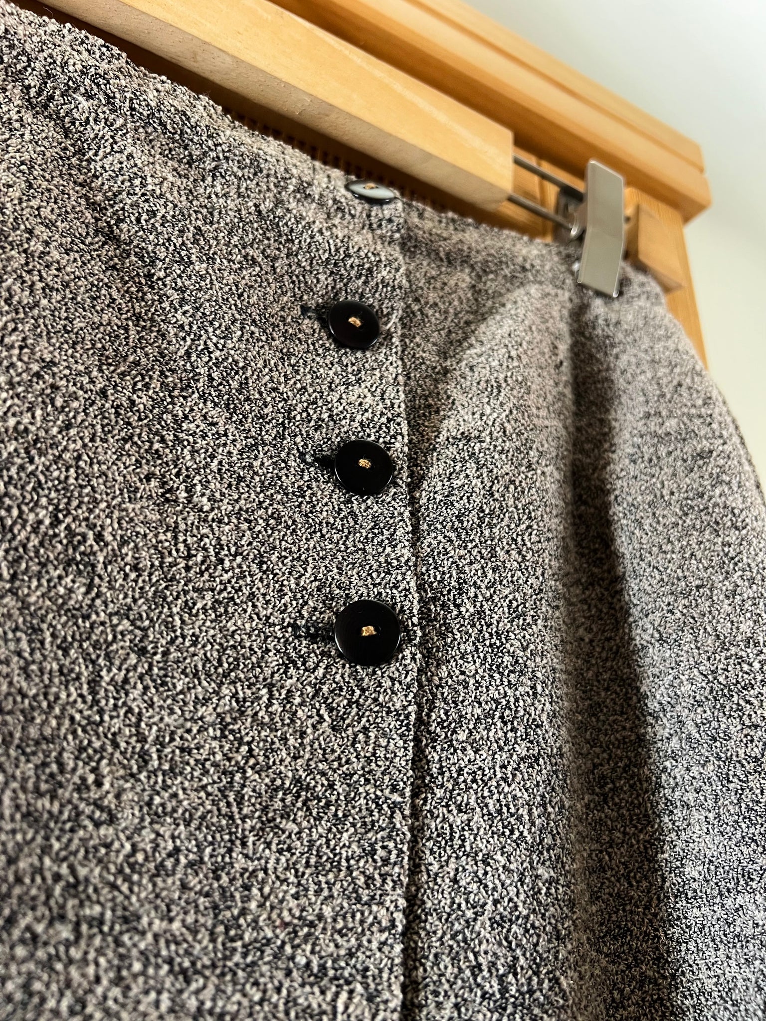 Gonna vintage di Cacharel di lana, foderata, con chiusura a portafoglio e 4 bottoncini.