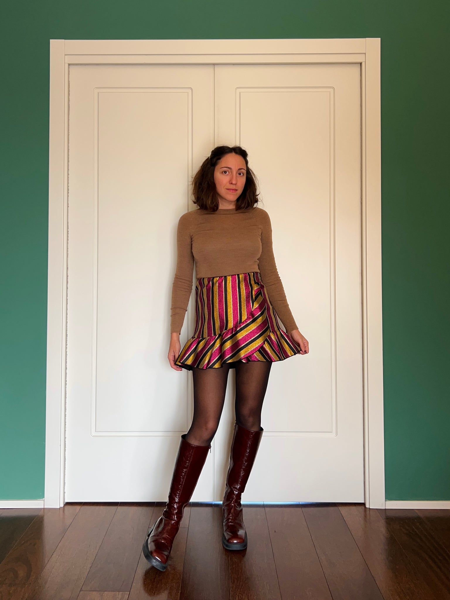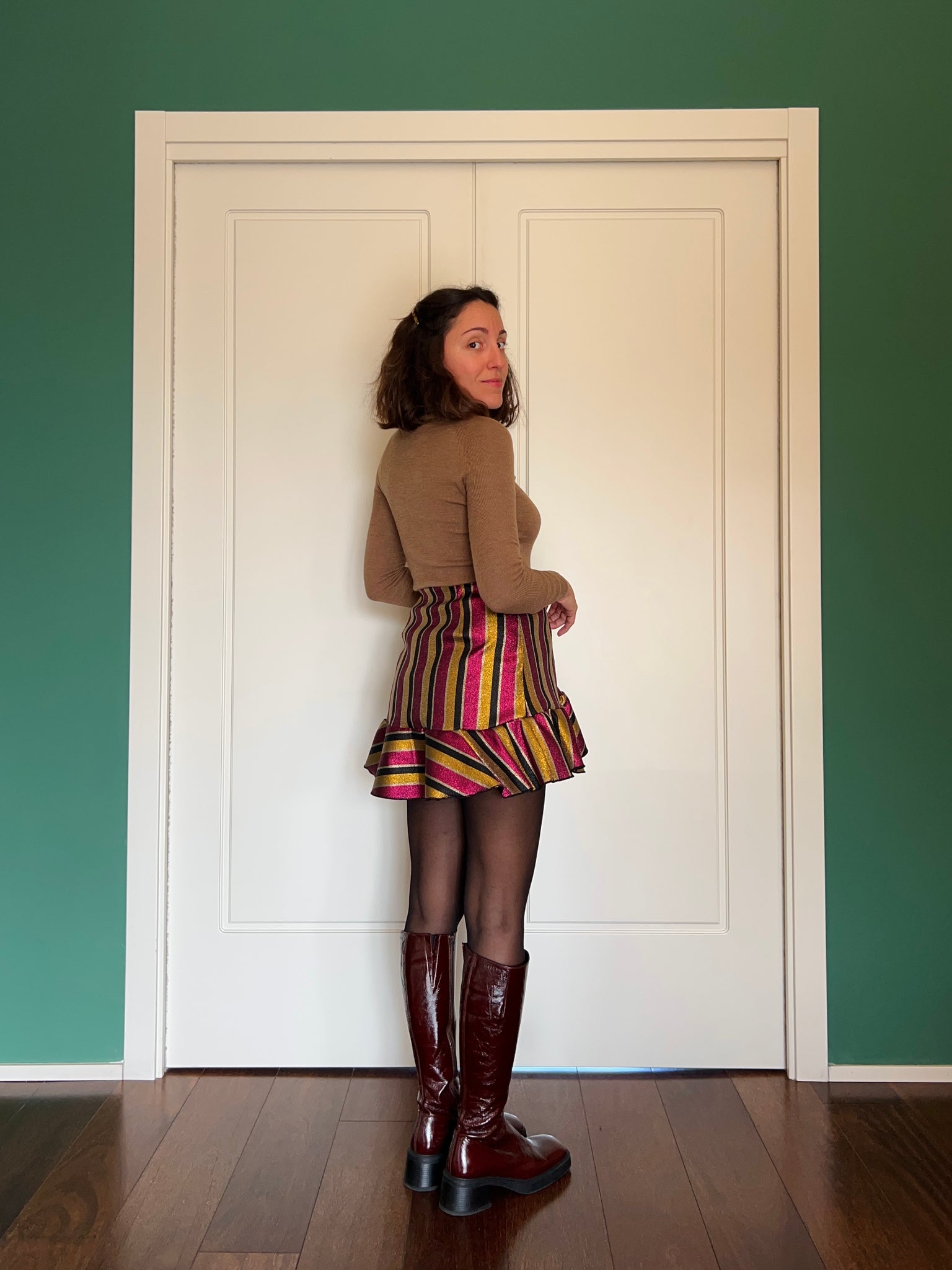 Gonna sartoriale by Chiara Luppi, modello corto con balza, elastico invisibile in vita e cerniera laterale.