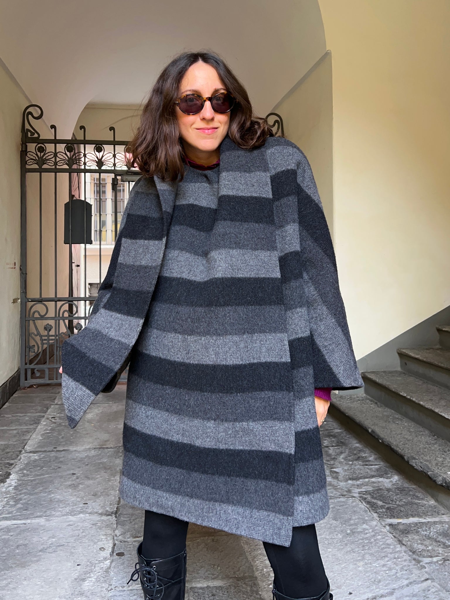 Cappotto a righe con sciarpa
