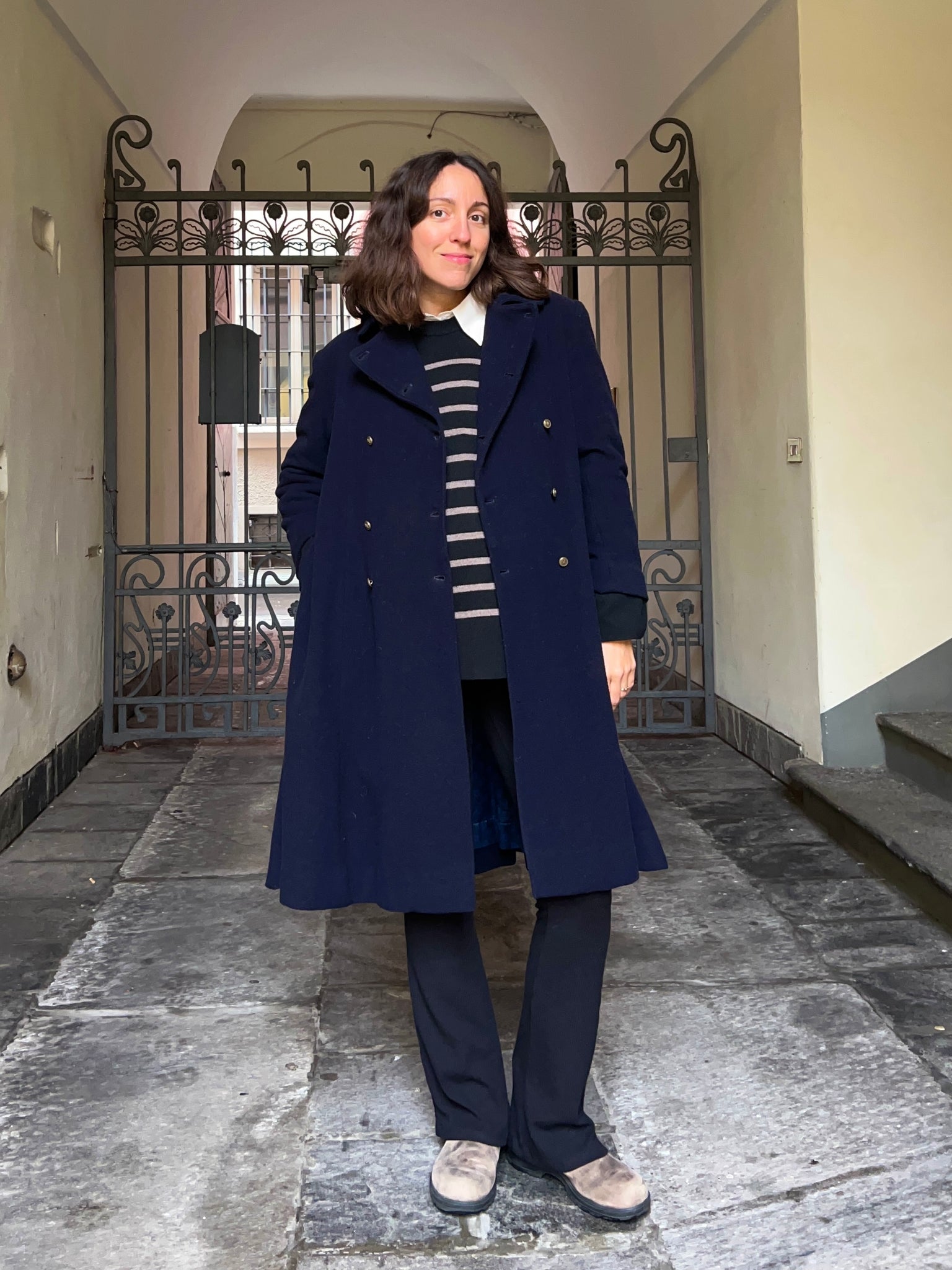 Splendido cappotto vintage in lana pesante, doppio petto, con colletto in velluto.