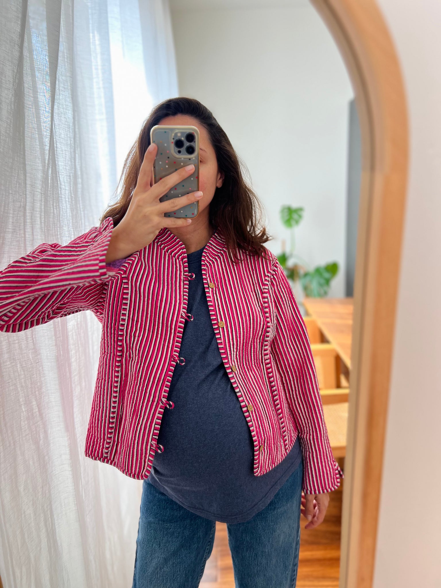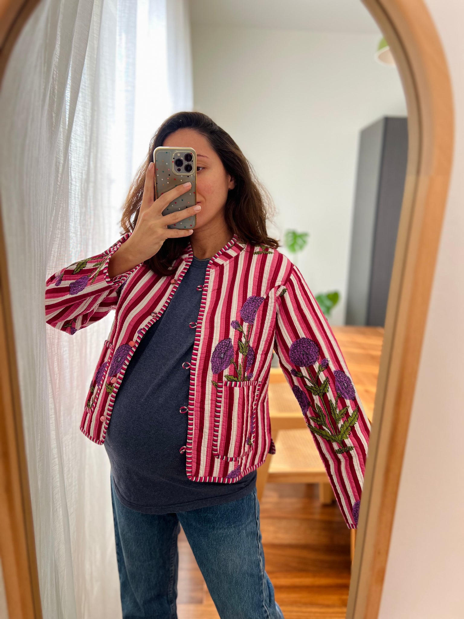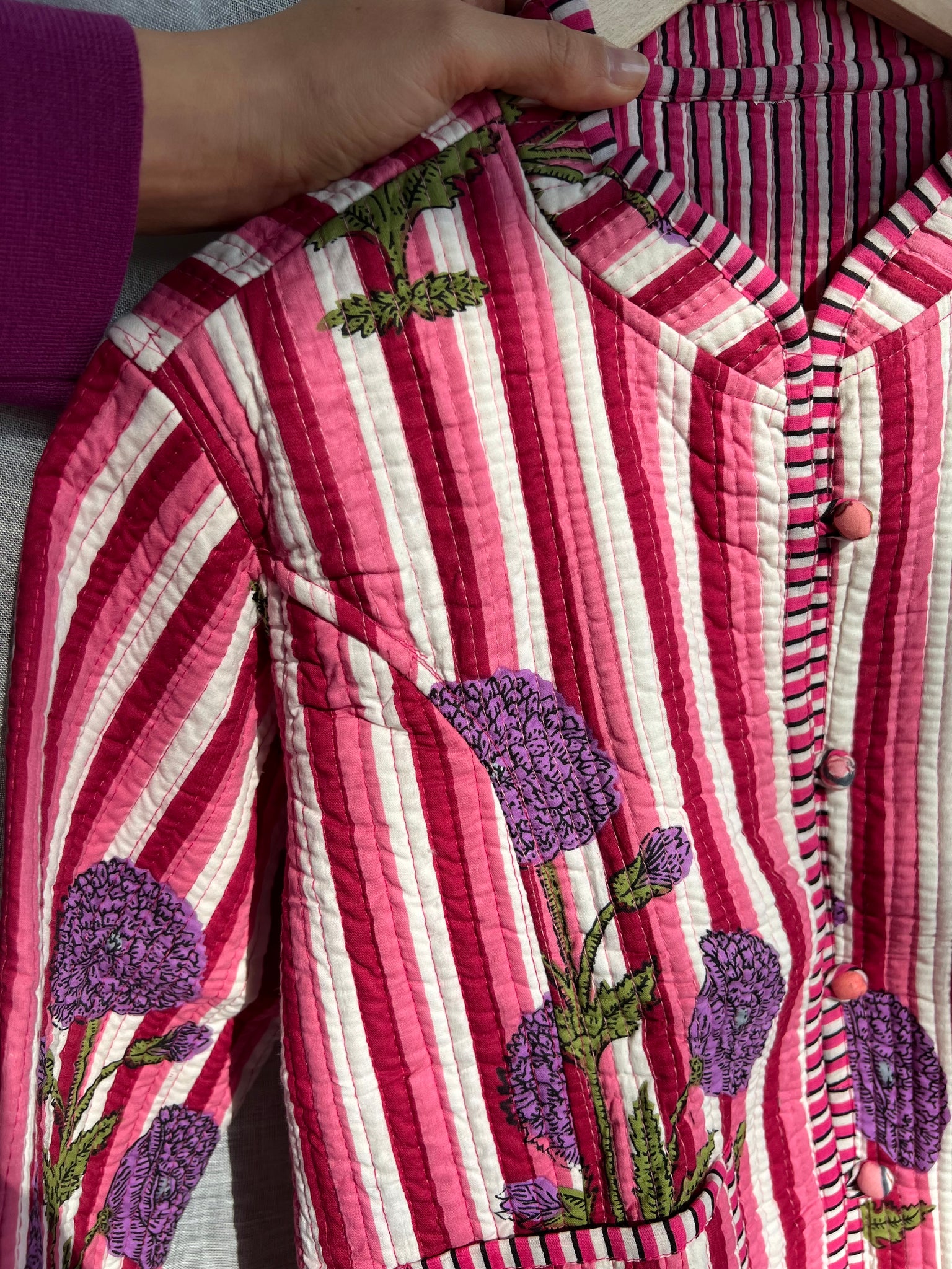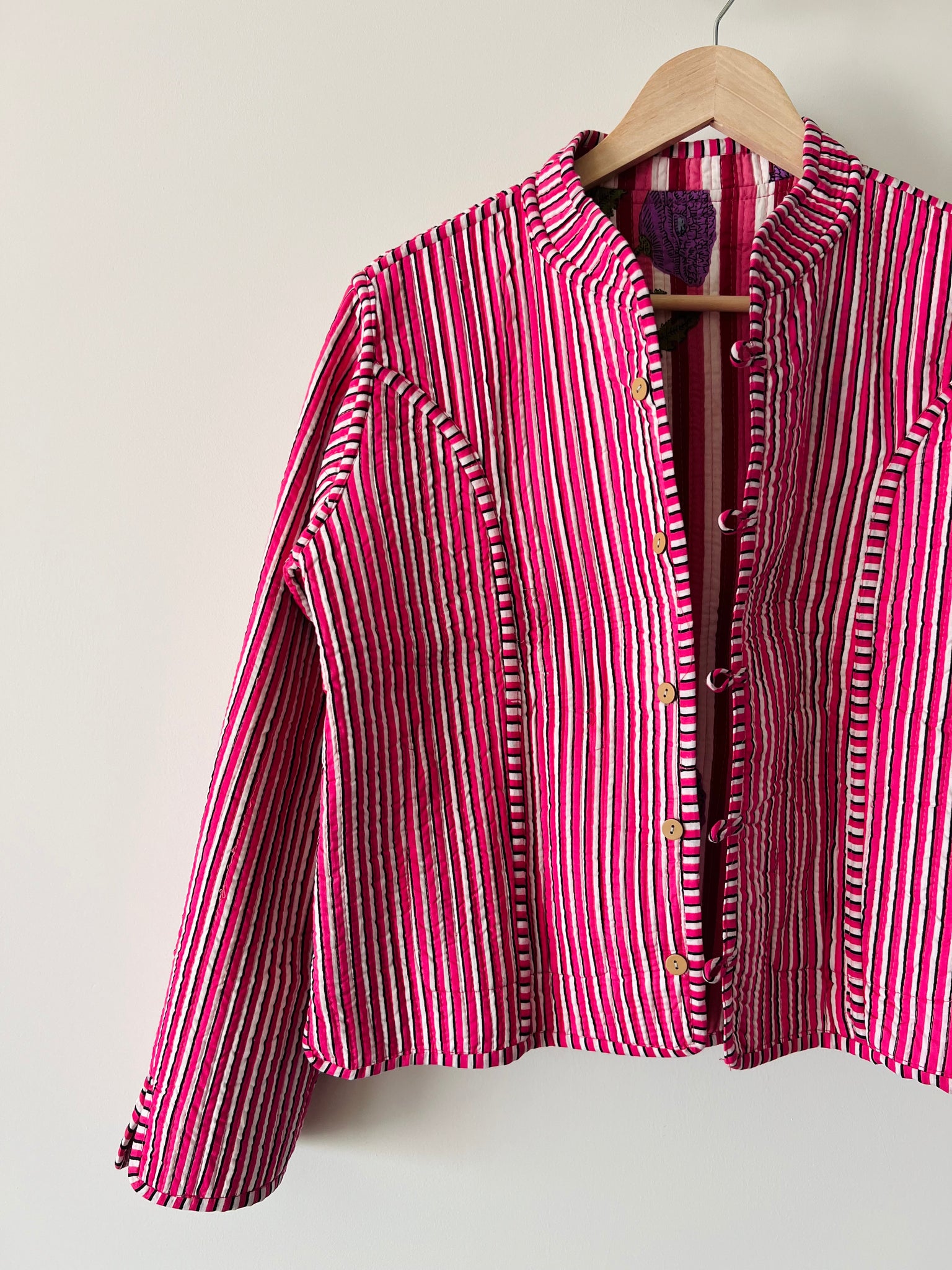 Giacca trapuntata double-face • modello con collo alla coreana • righe e fiori viola
