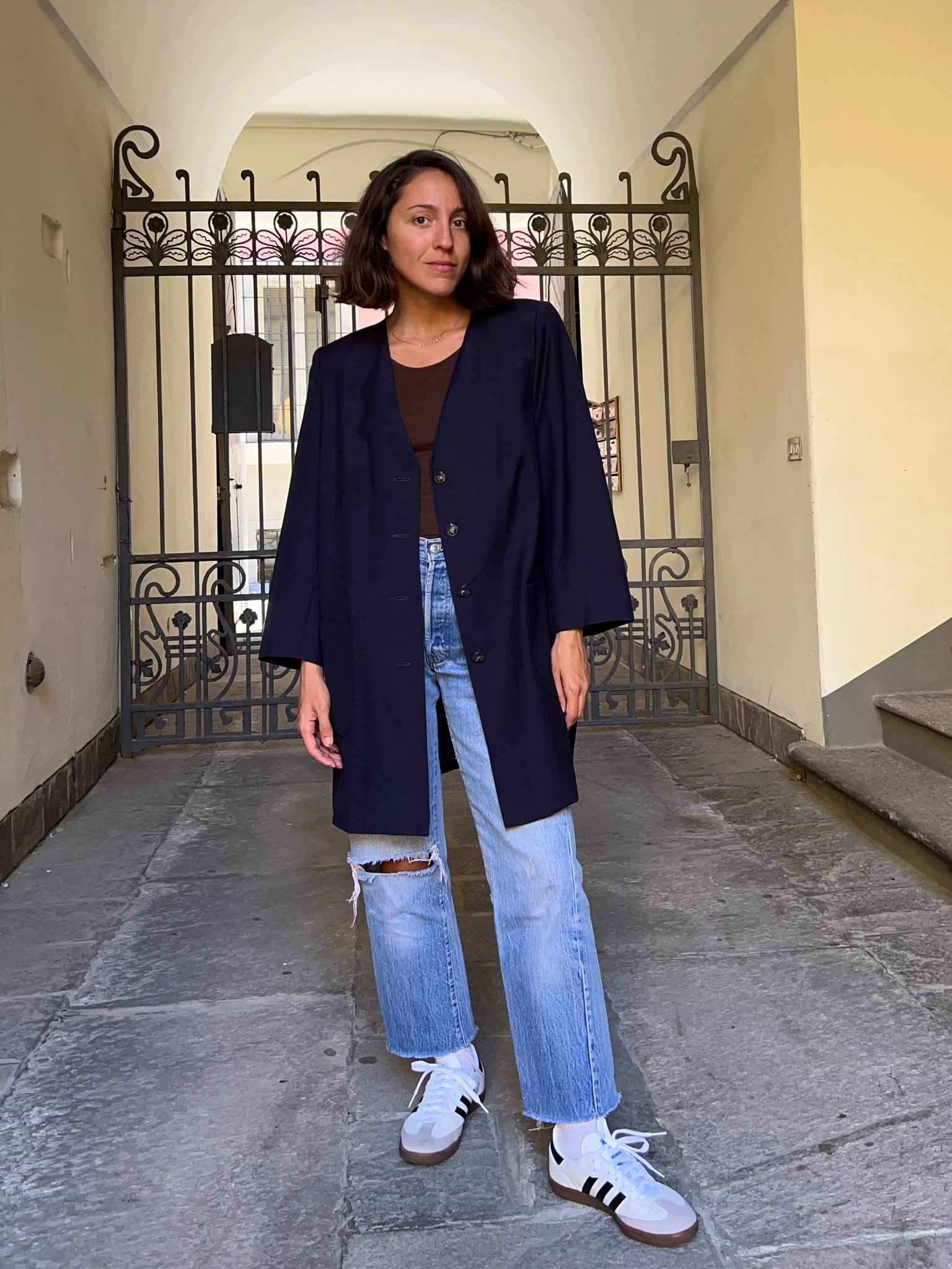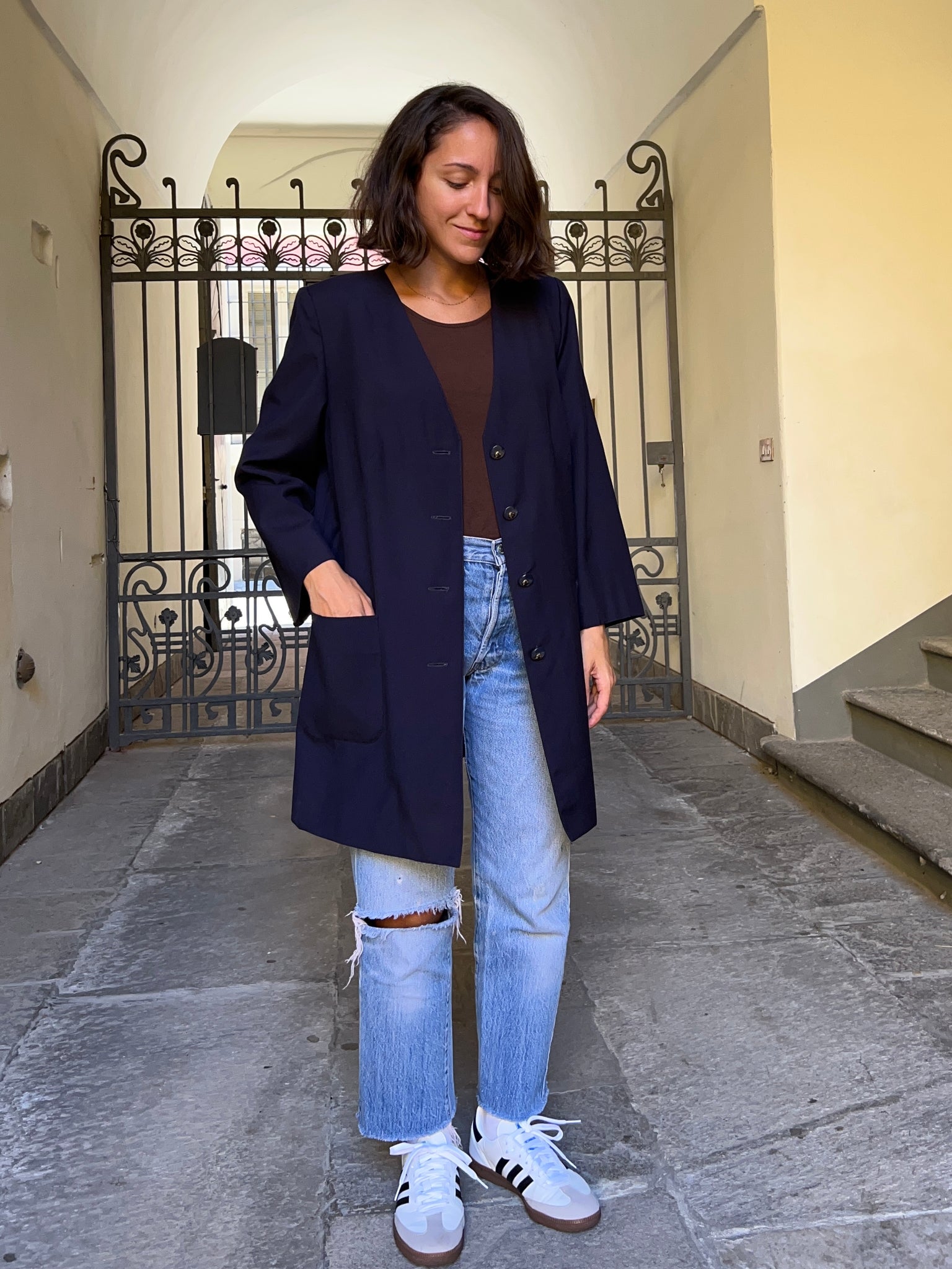 Giacca vintage sartoriale, modello via di mezzo tra un soprabito e un blazer lungo.