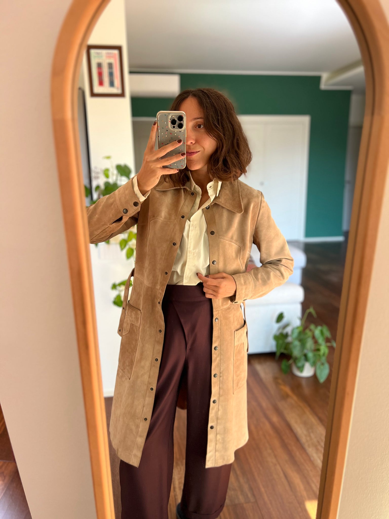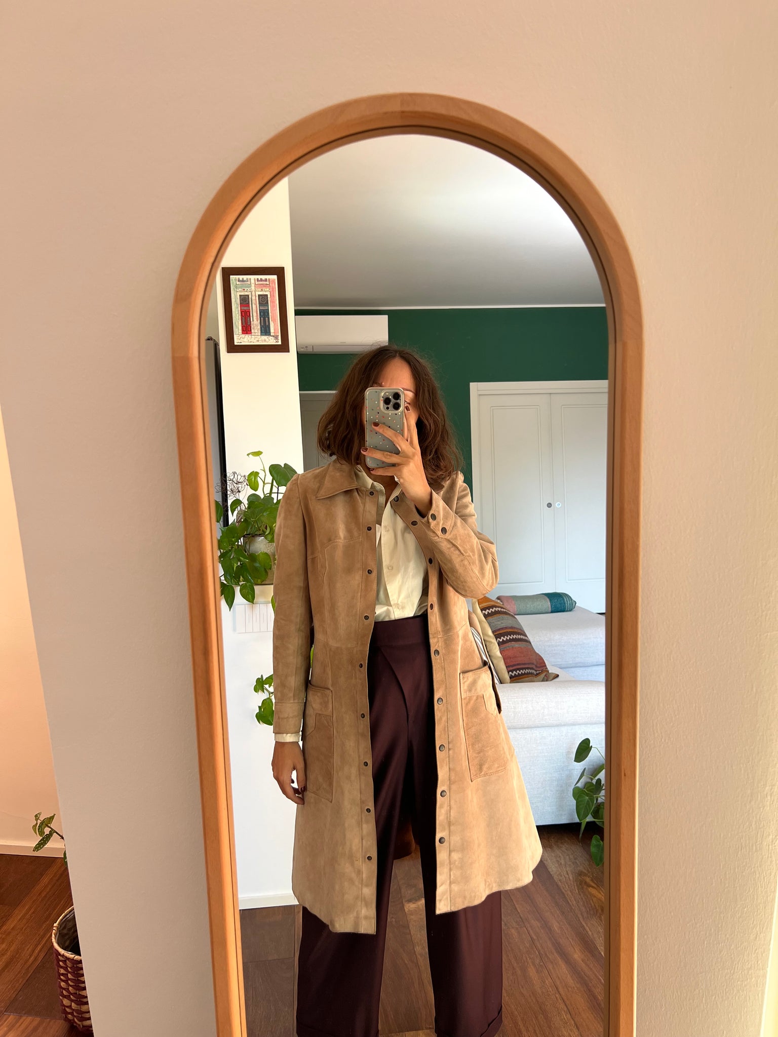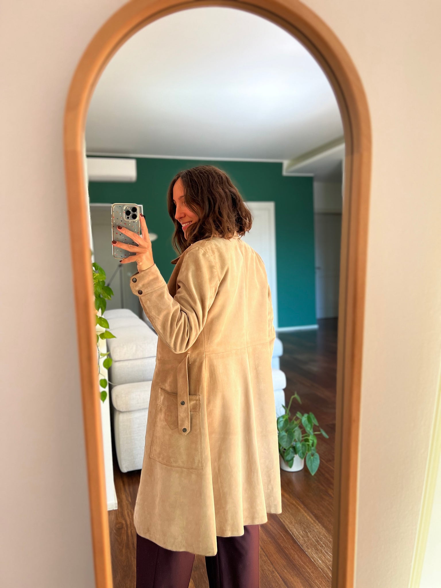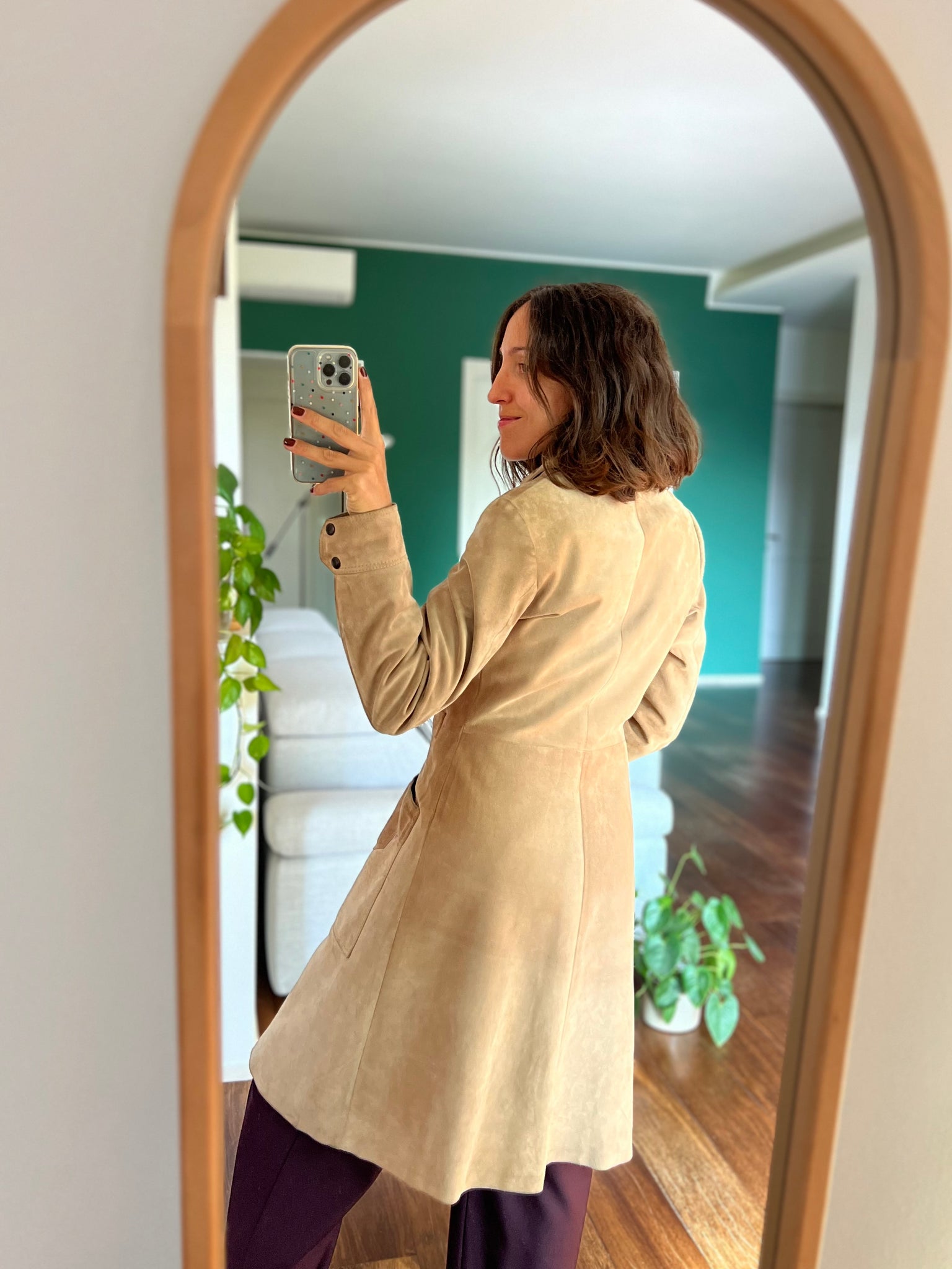 Splendido spolverino in vera pelle, artigianale, con una forma un po’ sagomata che valorizza molto la figura.