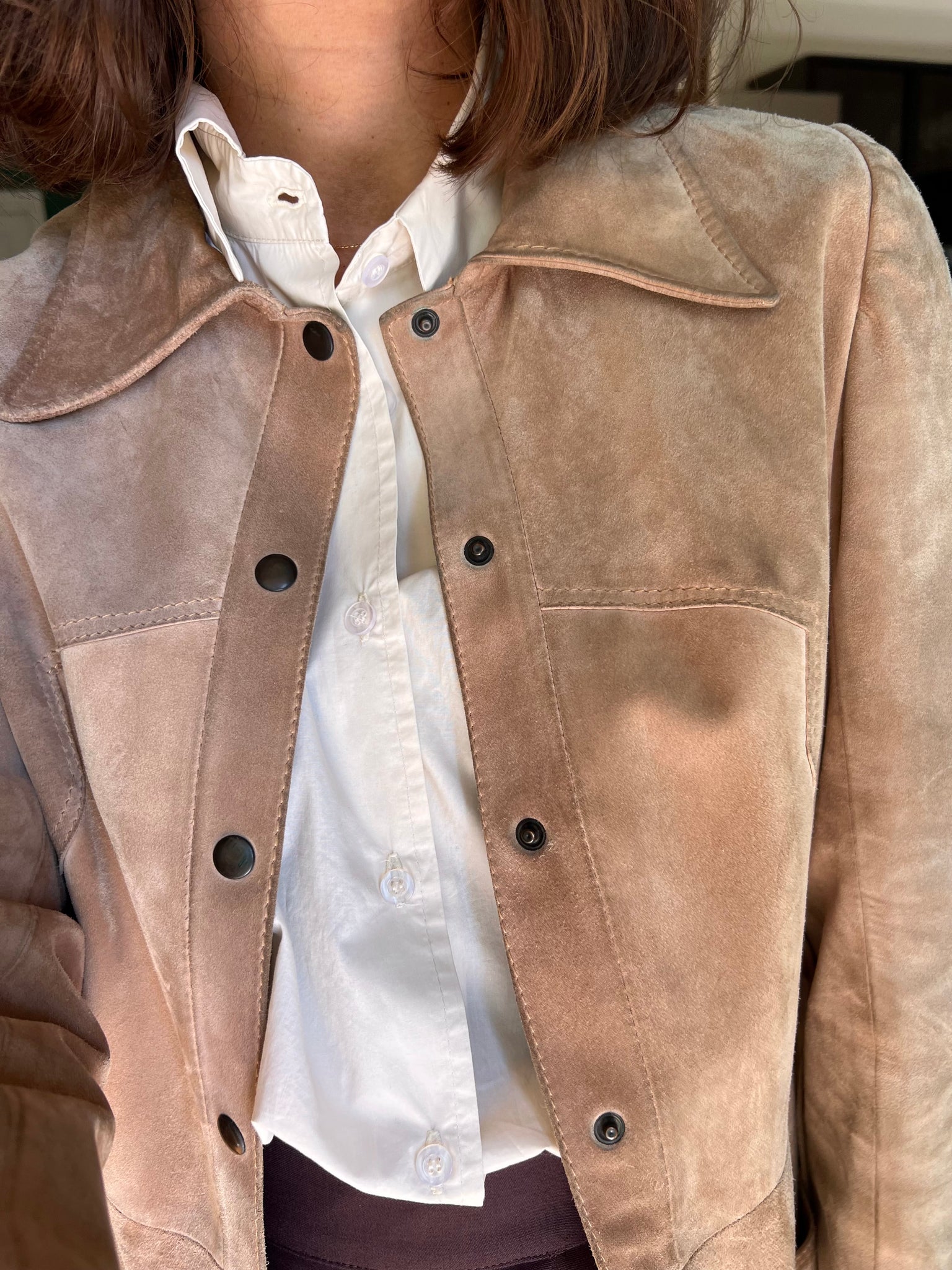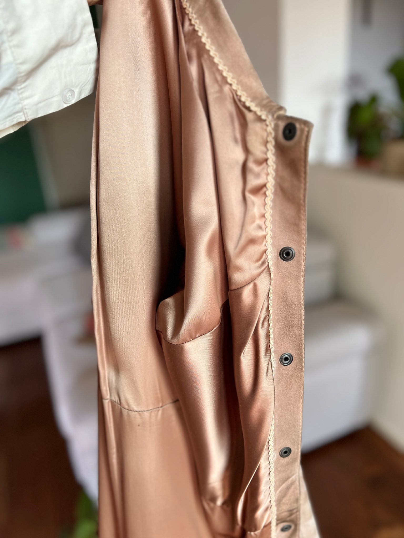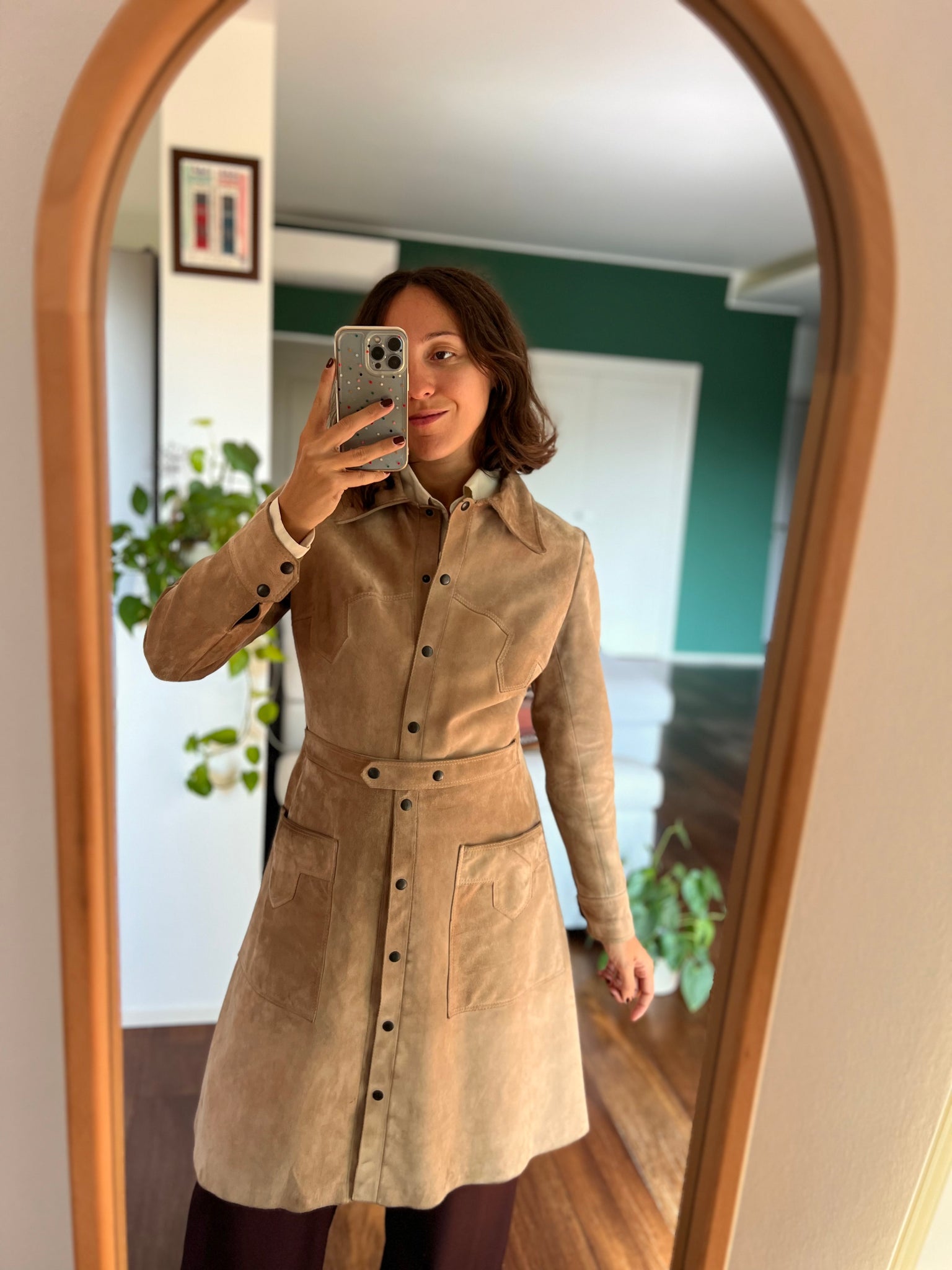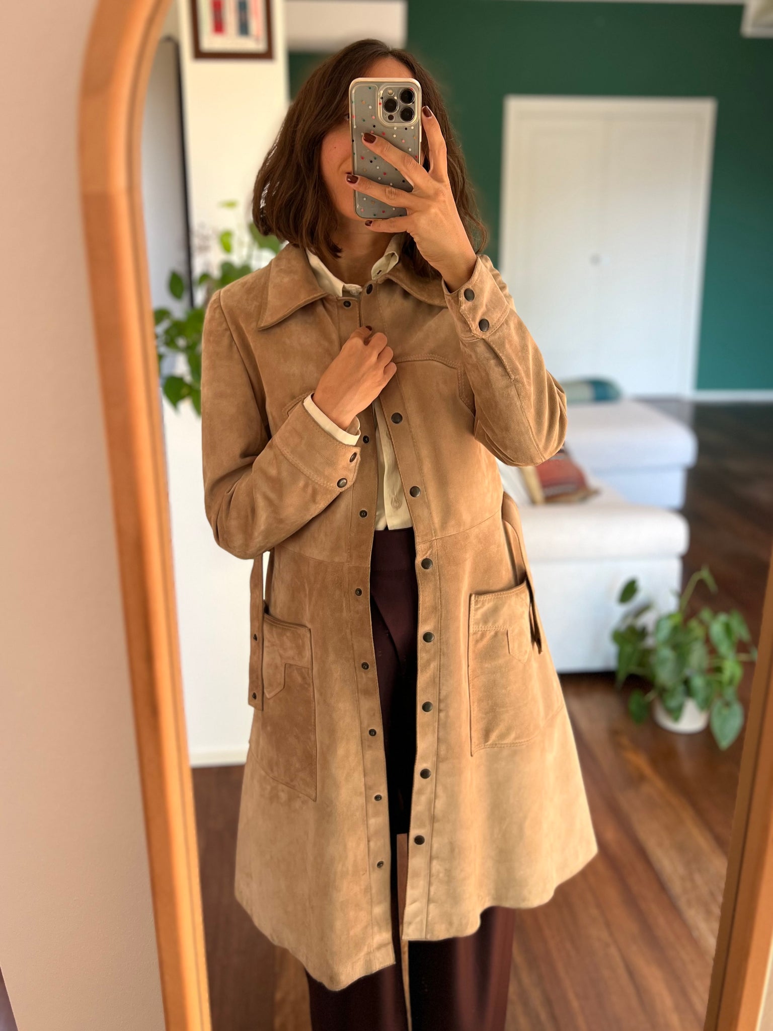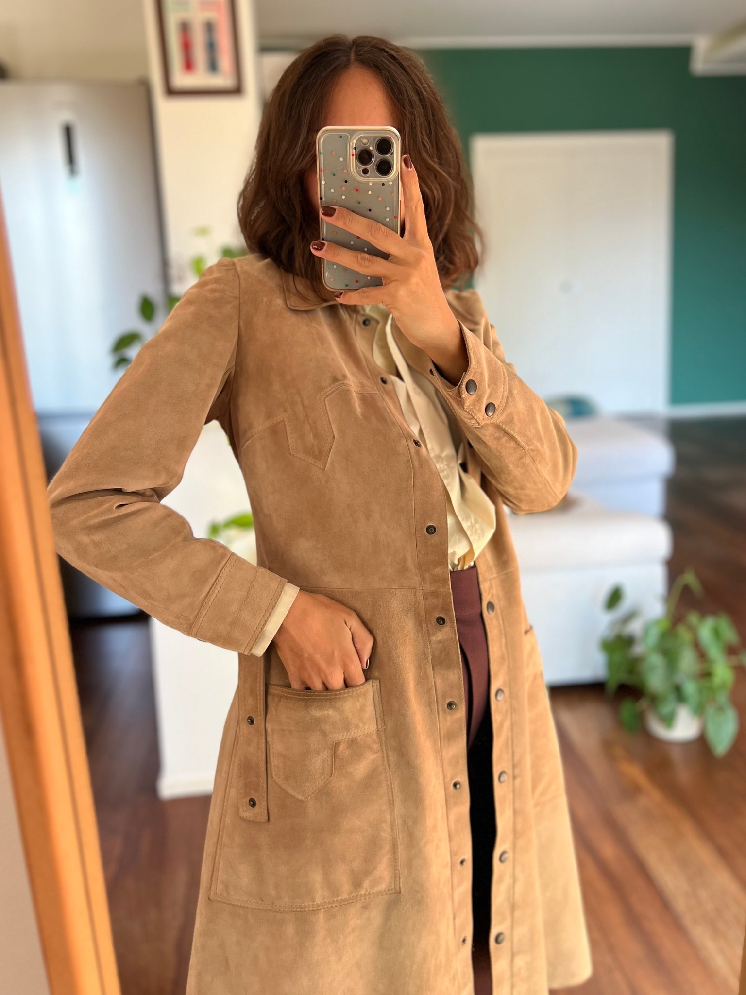 Splendido spolverino in vera pelle, artigianale, con una forma un po’ sagomata che valorizza molto la figura.