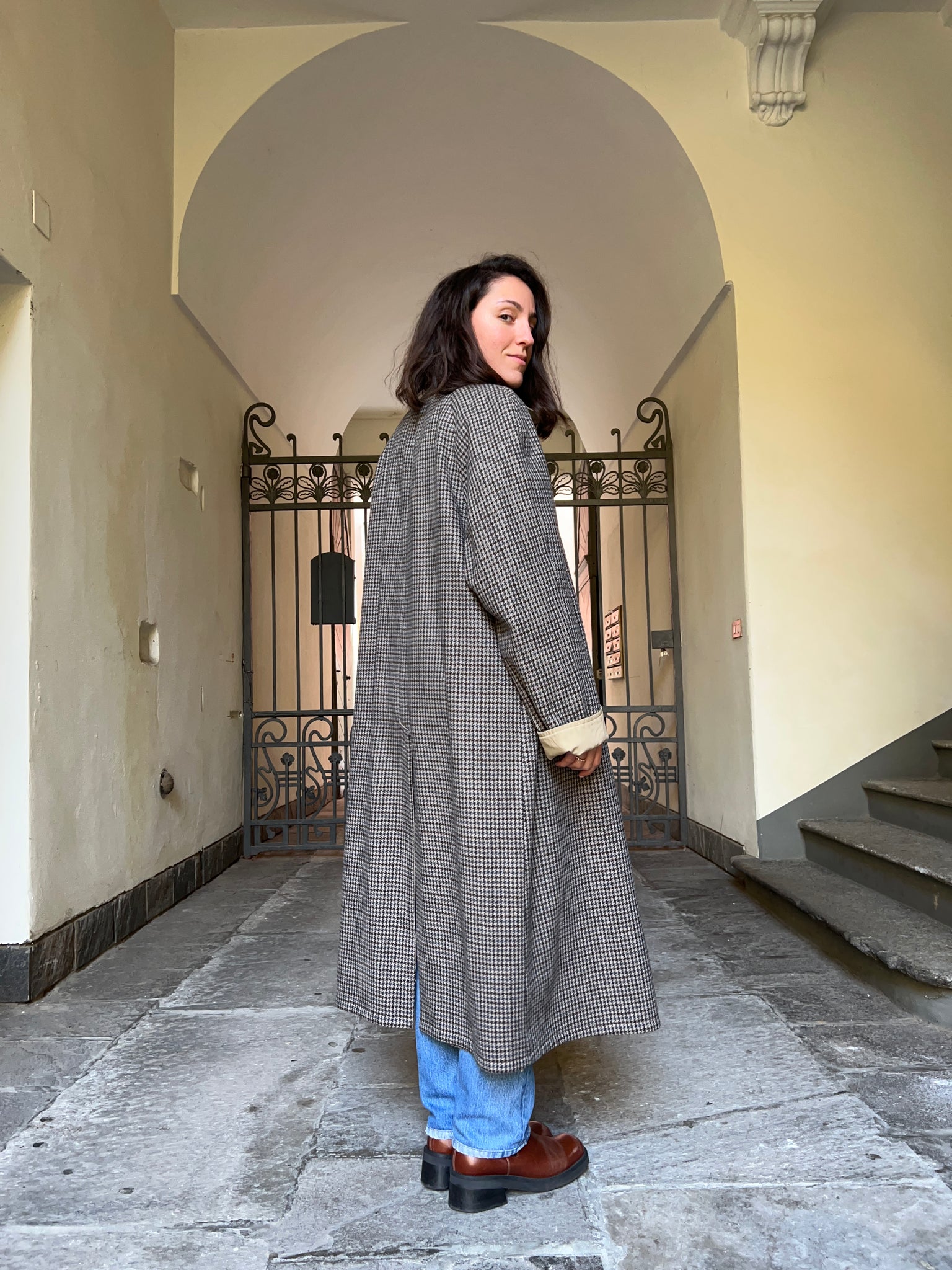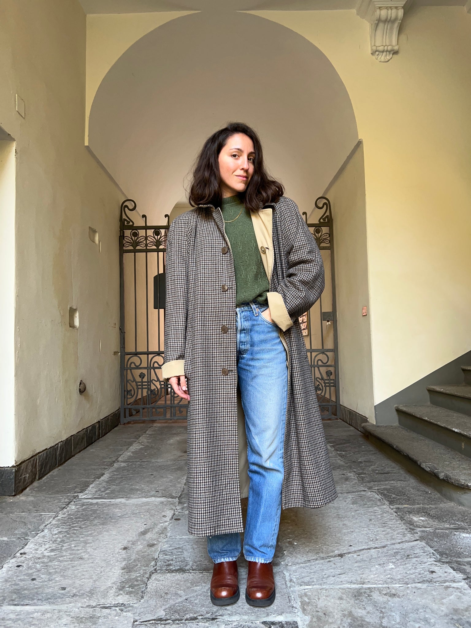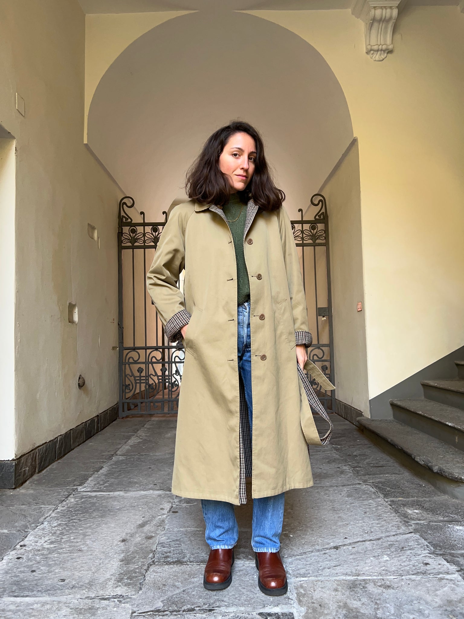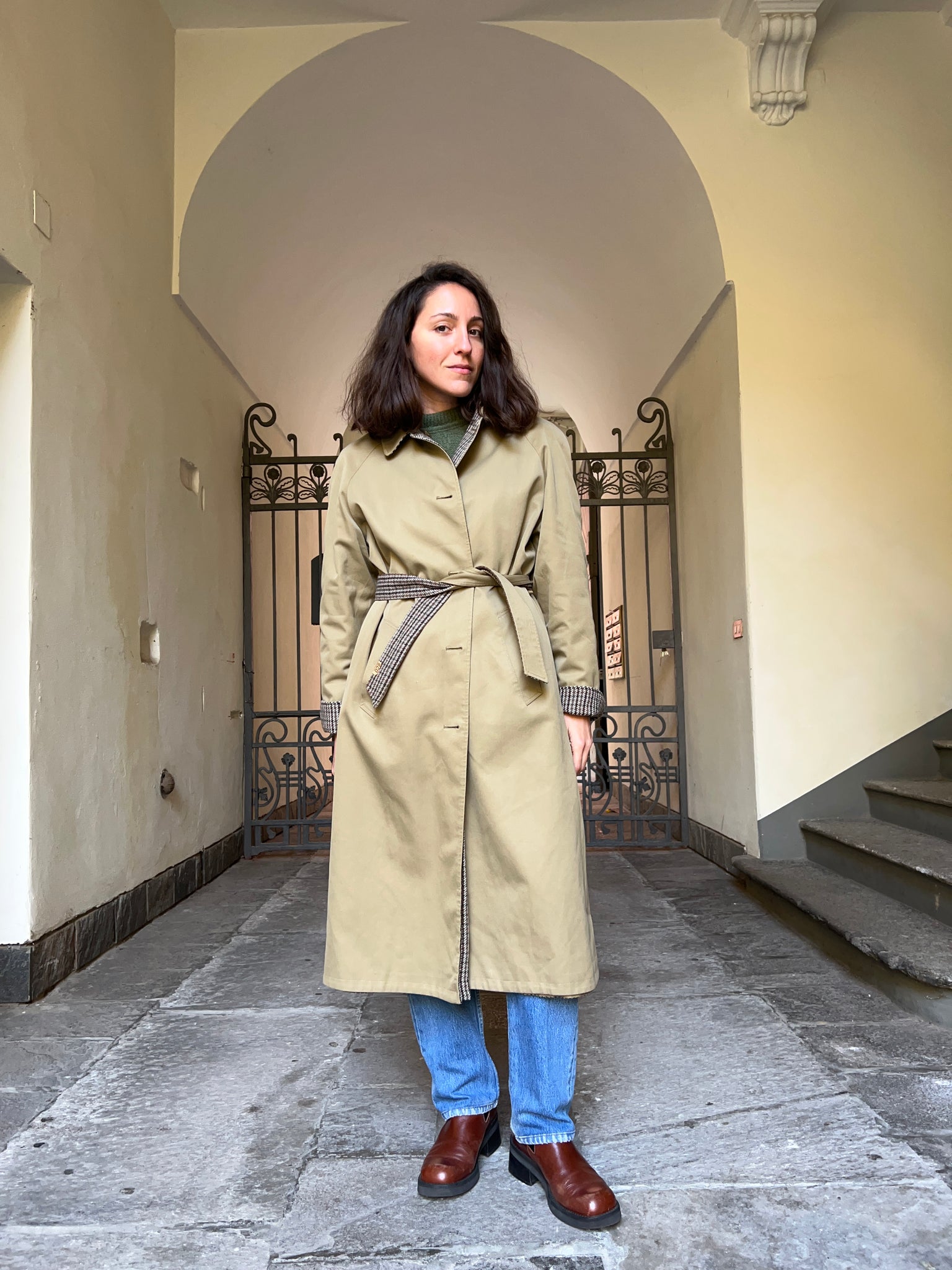 Trench vintage indossabile da entrambi i lati, di cui uno di lana.