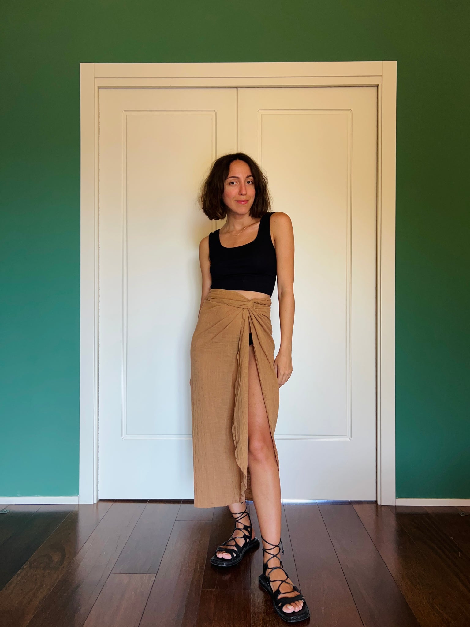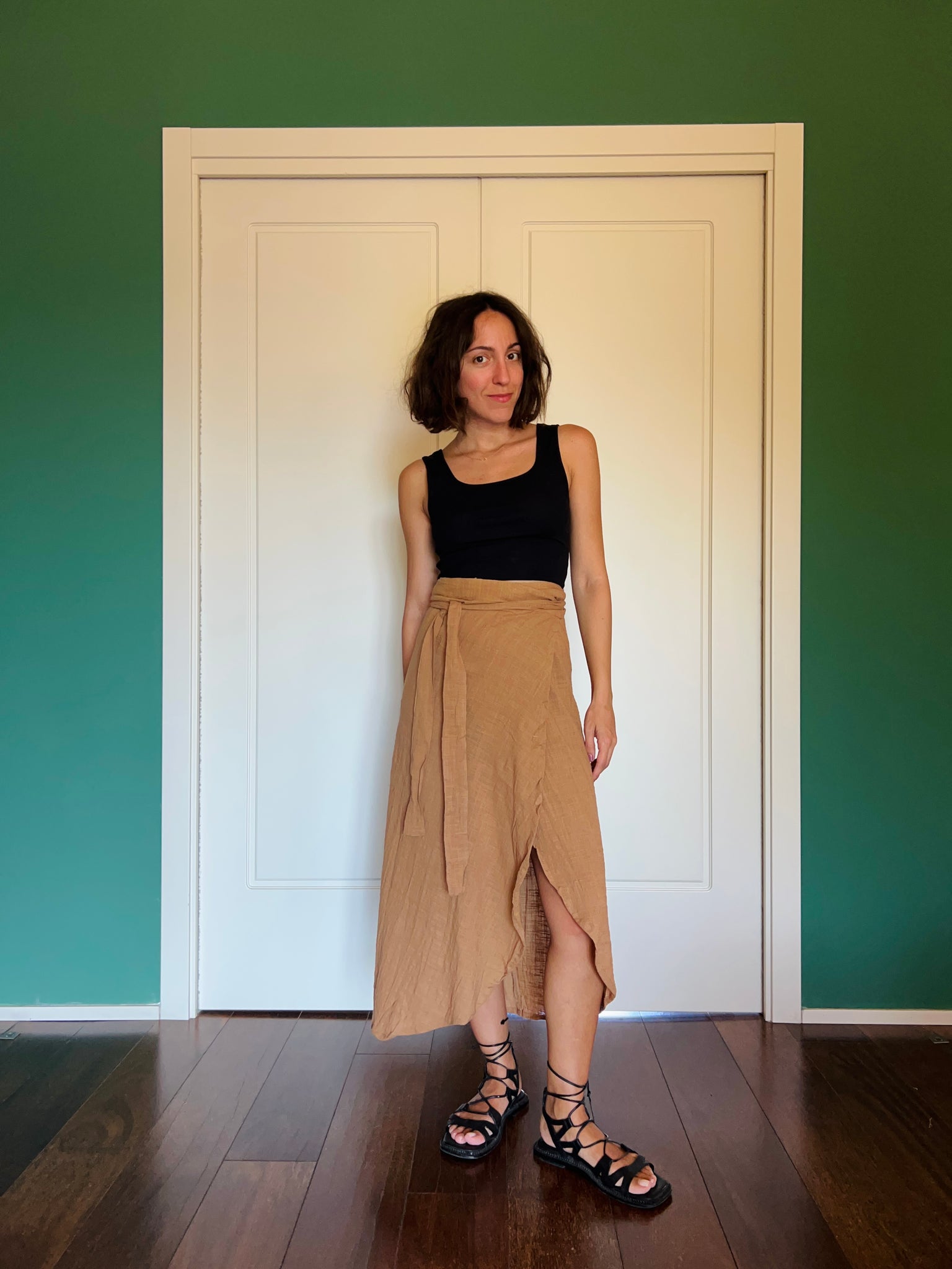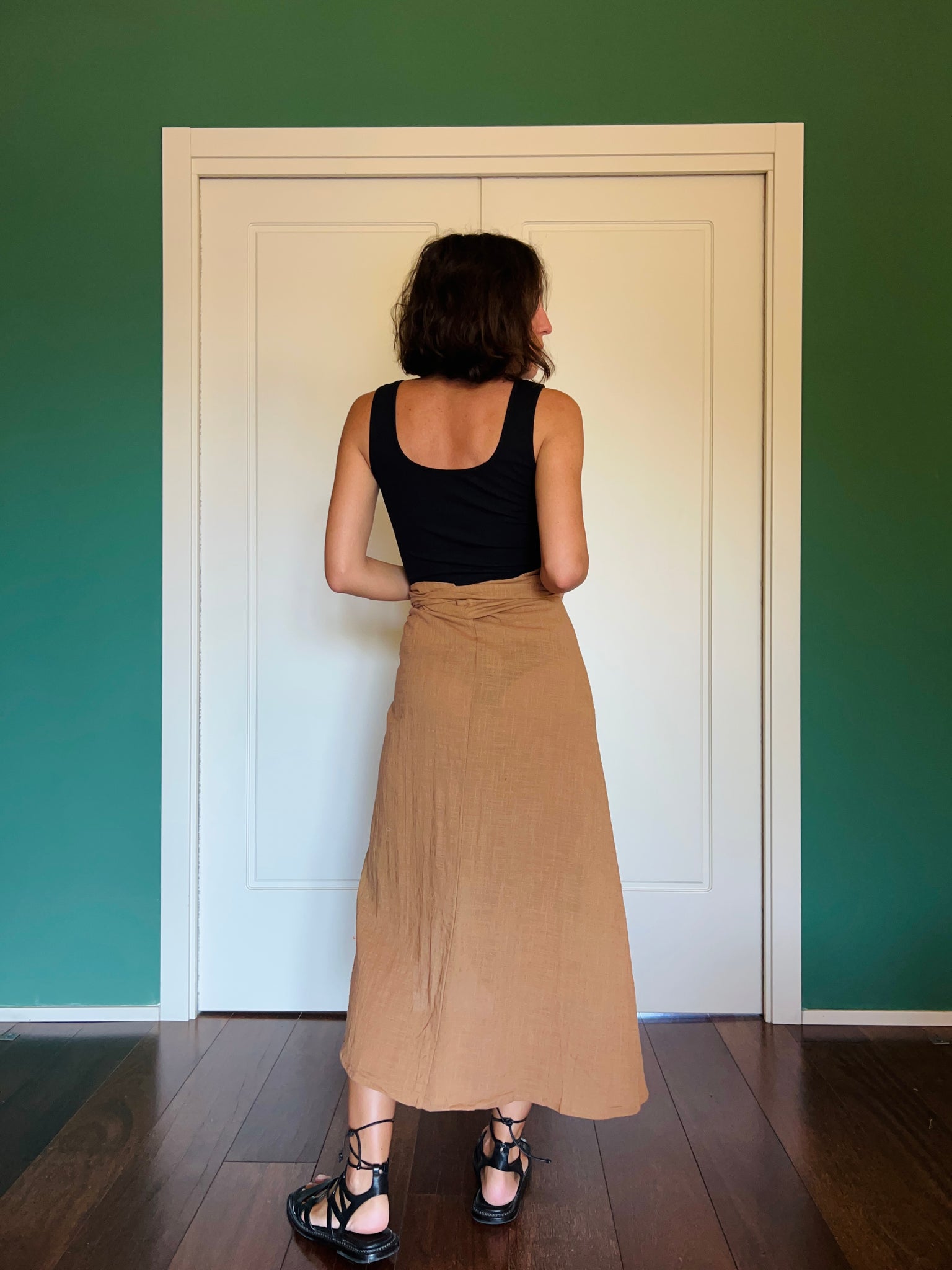Si chiude incrociandola in vita, oppure facendo il doppio giro del nastro come nella prima foto.