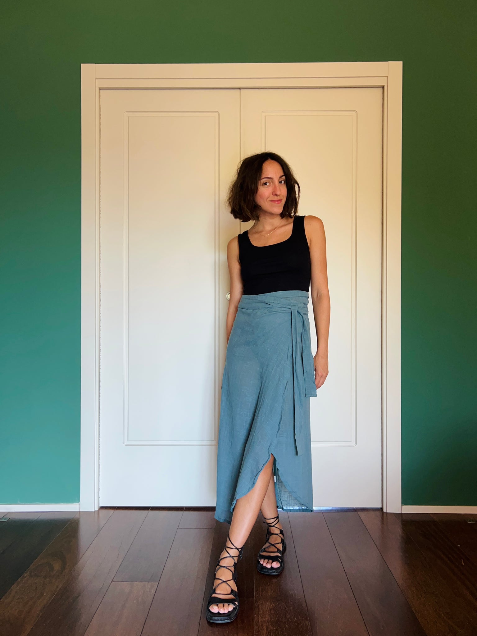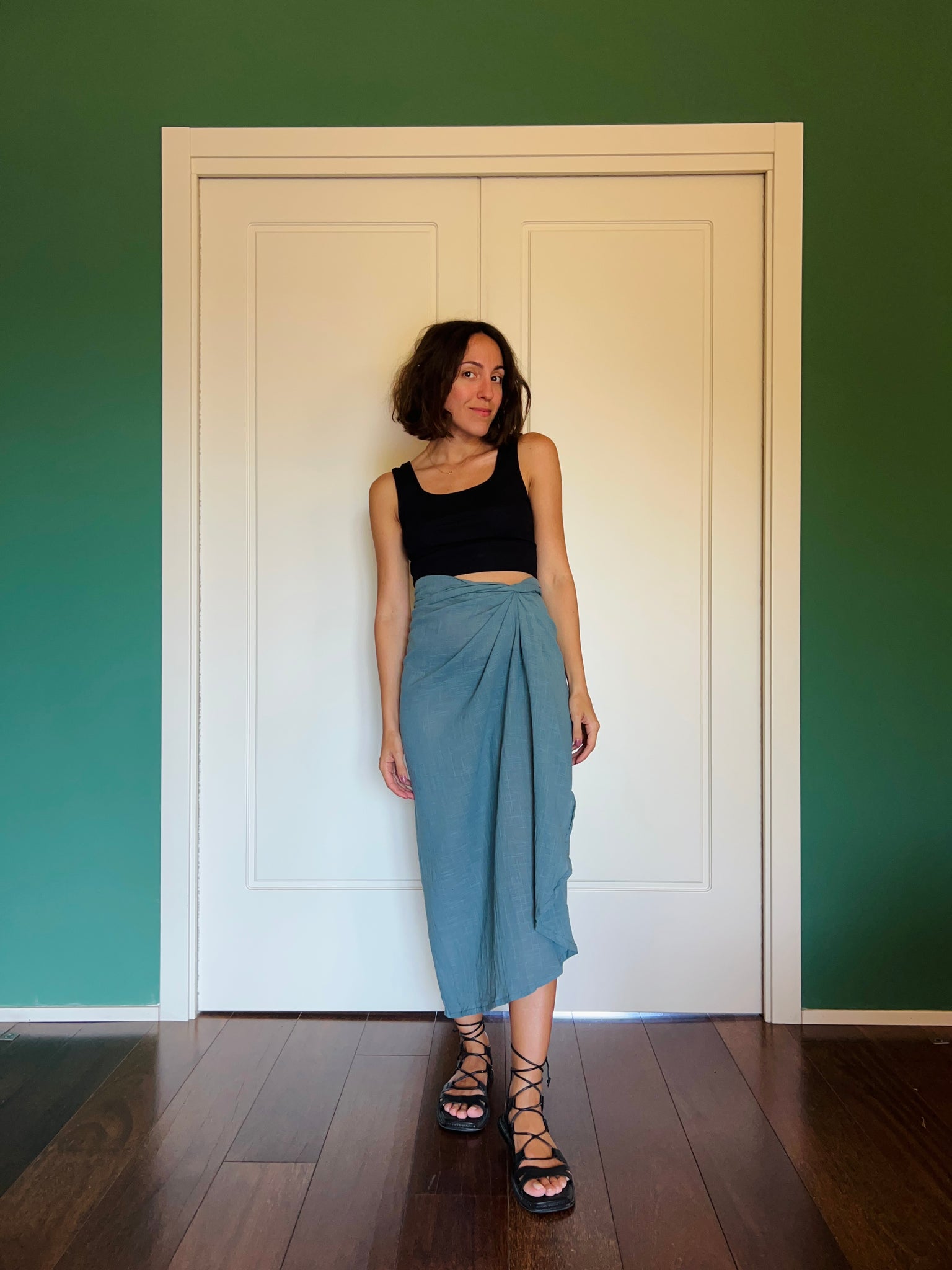 Si chiude incrociandola in vita, oppure facendo il doppio giro del nastro come nella prima foto.