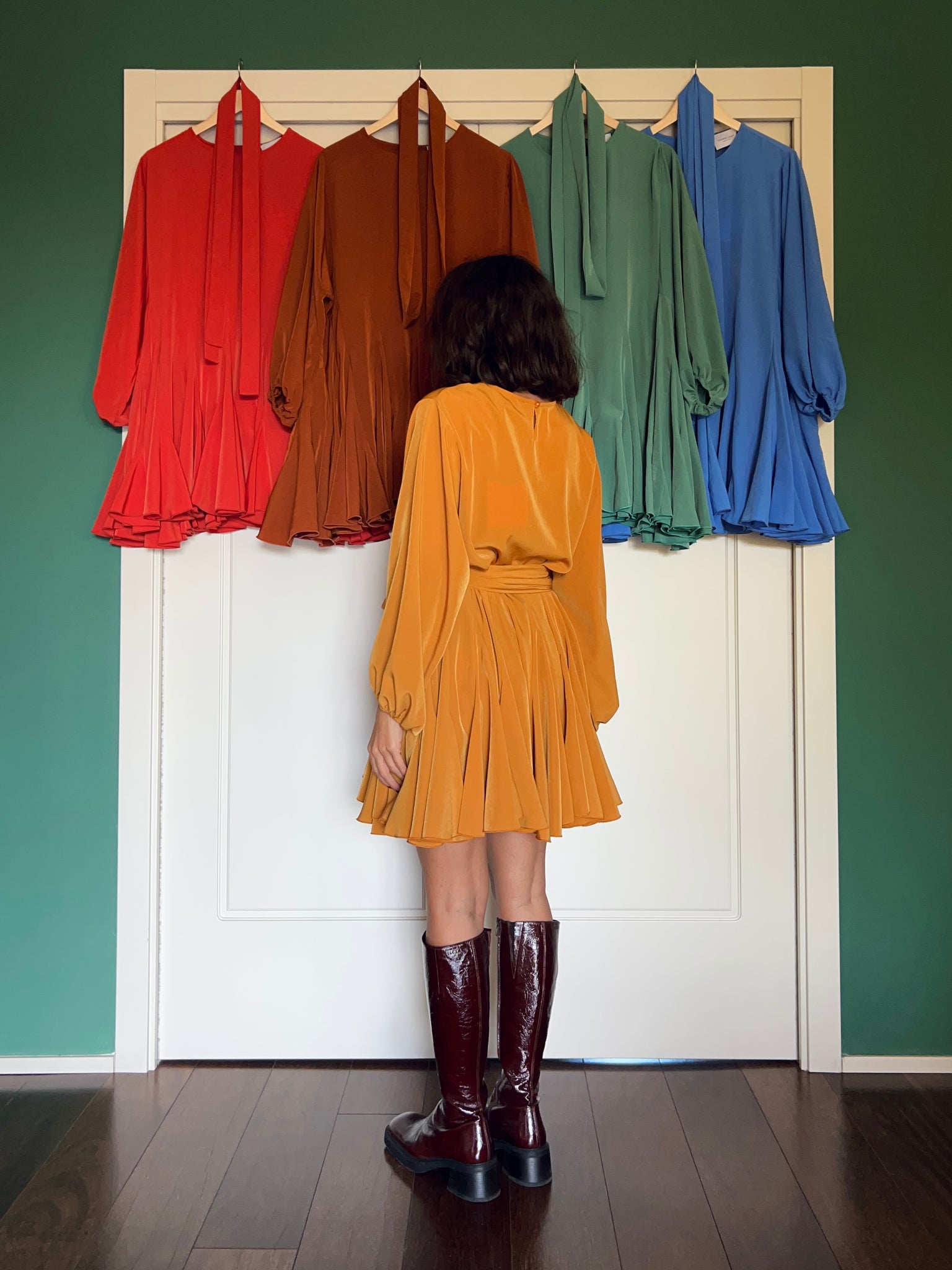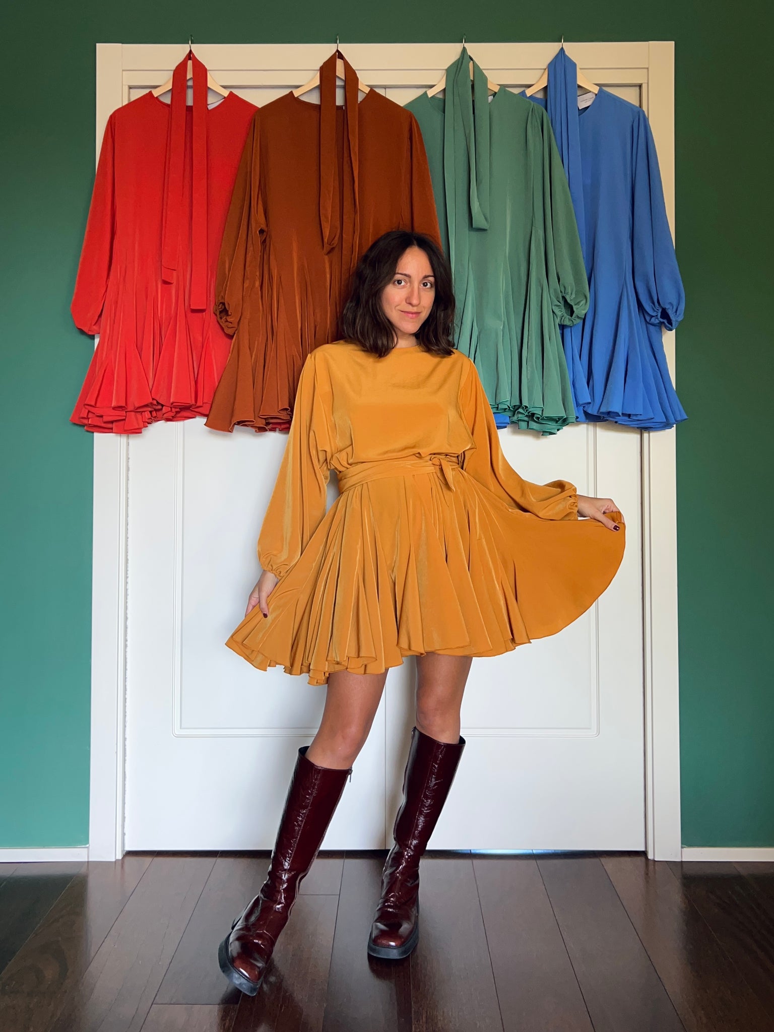 Abito sartoriale by Chiara Luppi realizzato con tanti metri di tessuto, con tanti spicchi nella gonna che creano movimento, e nastro lungo da legare in vita.