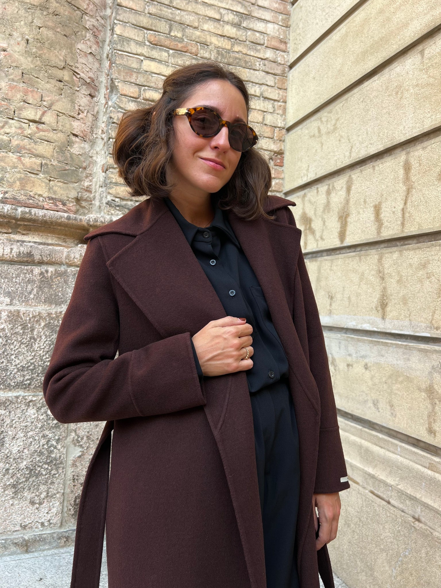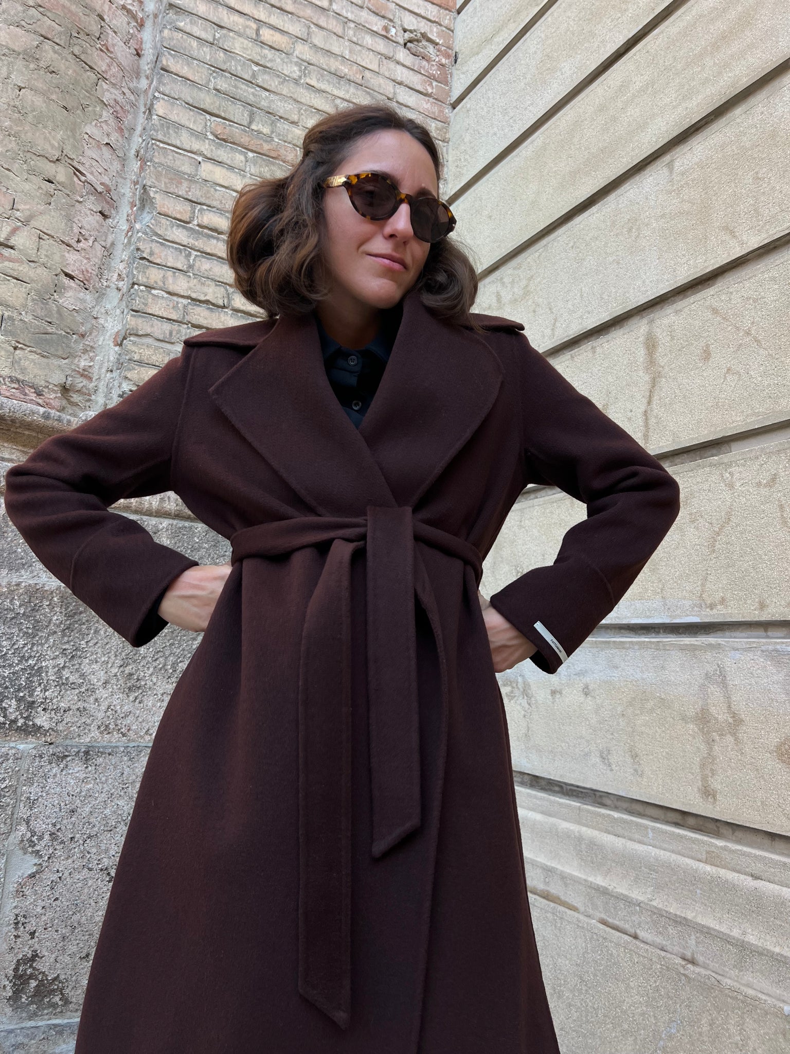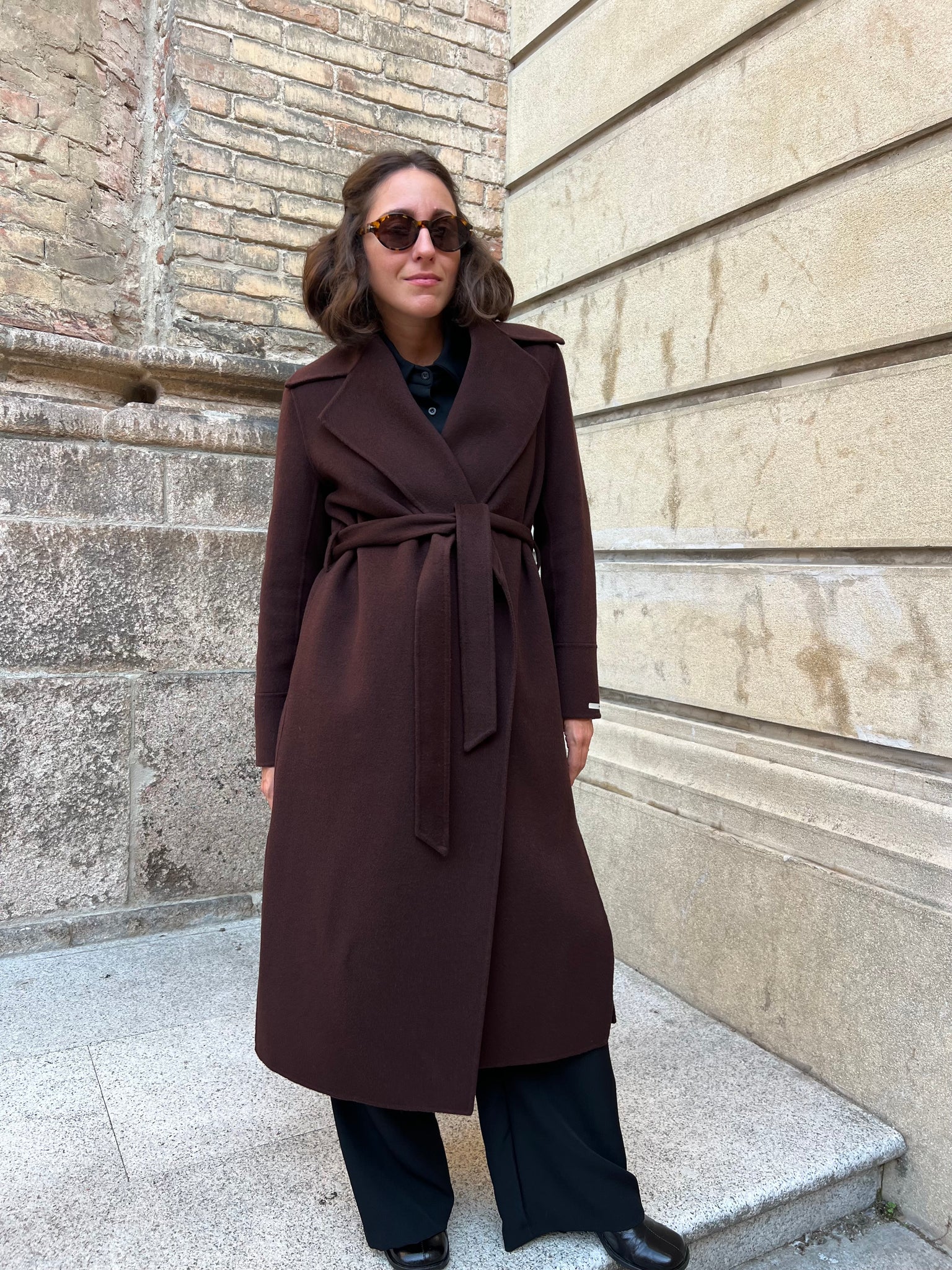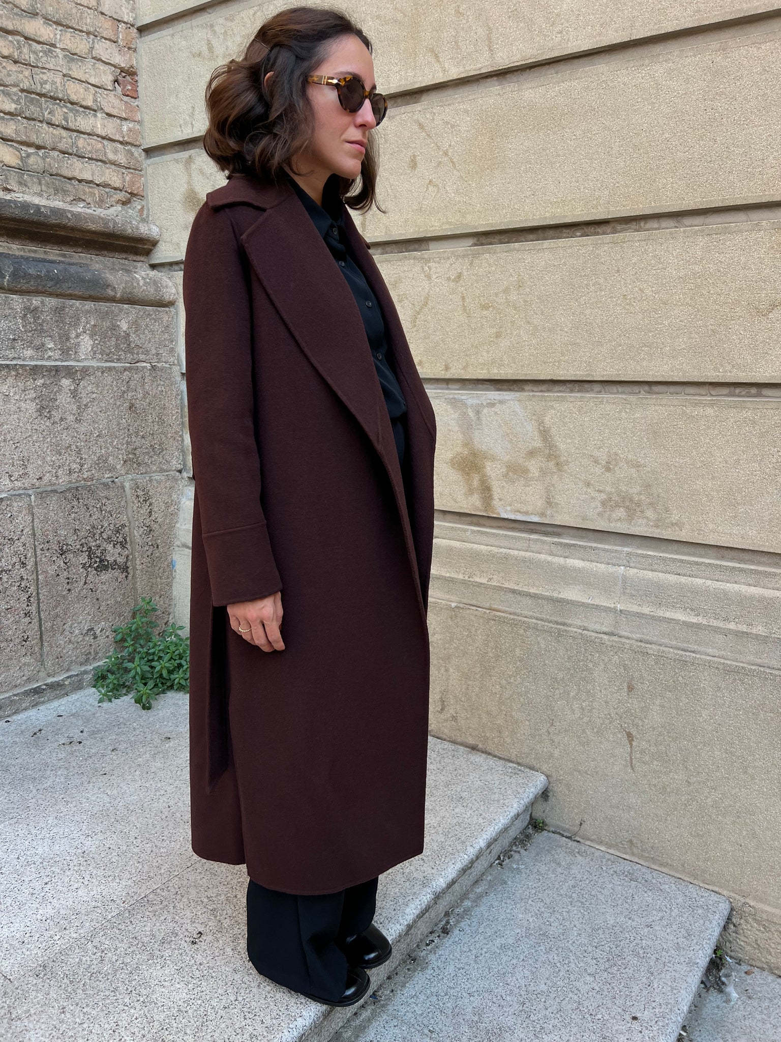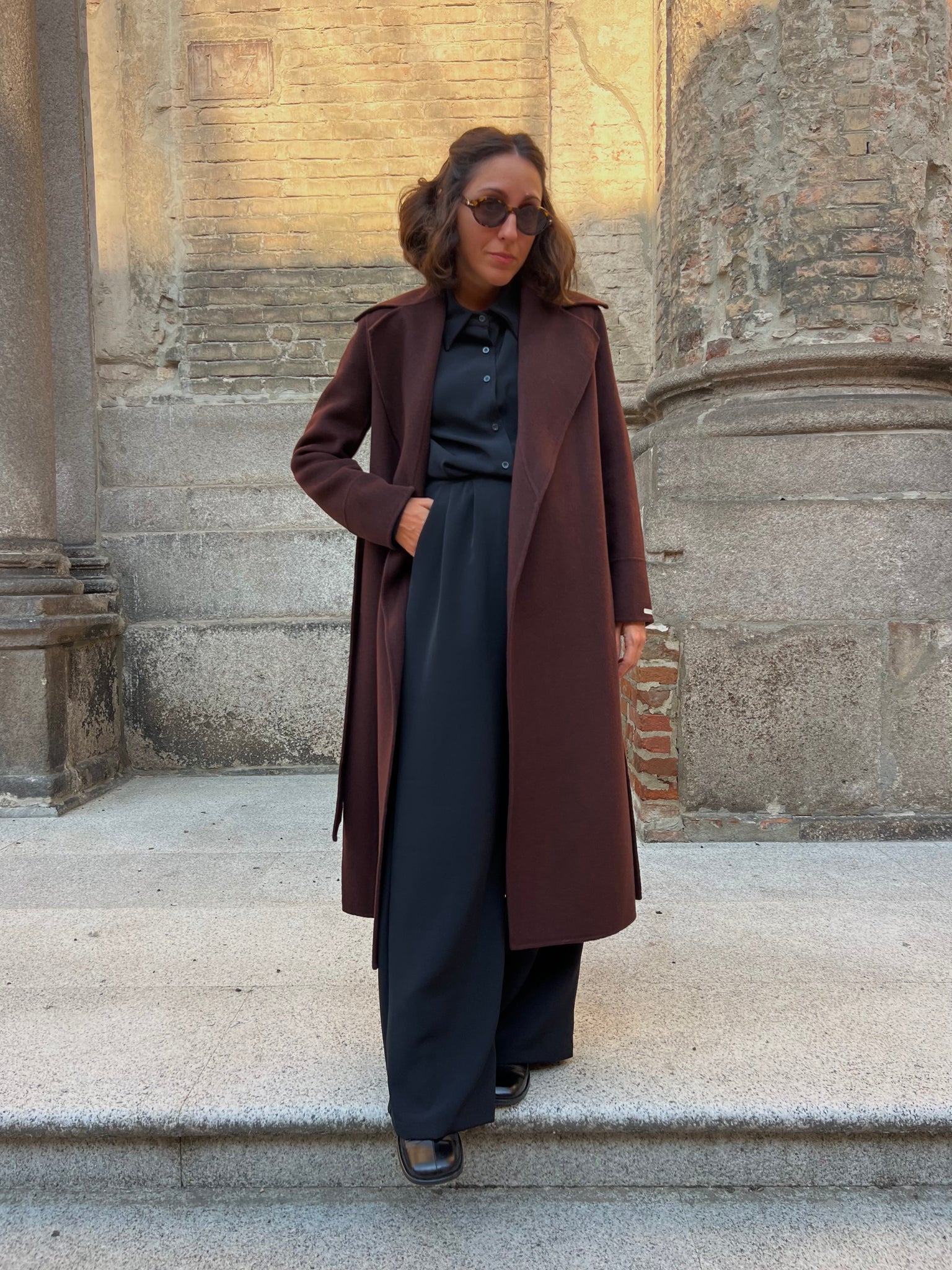 Cappotto sartoriale by Chiara Luppi, modello lungo con rever grande, cintura e tasche.