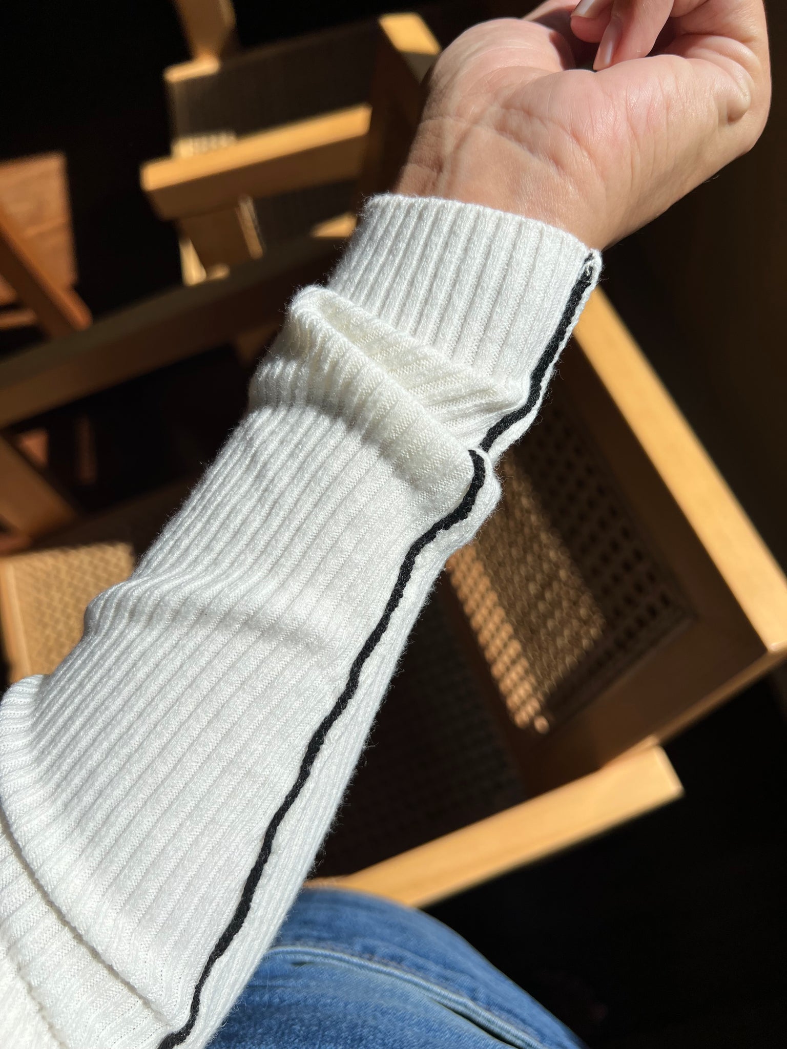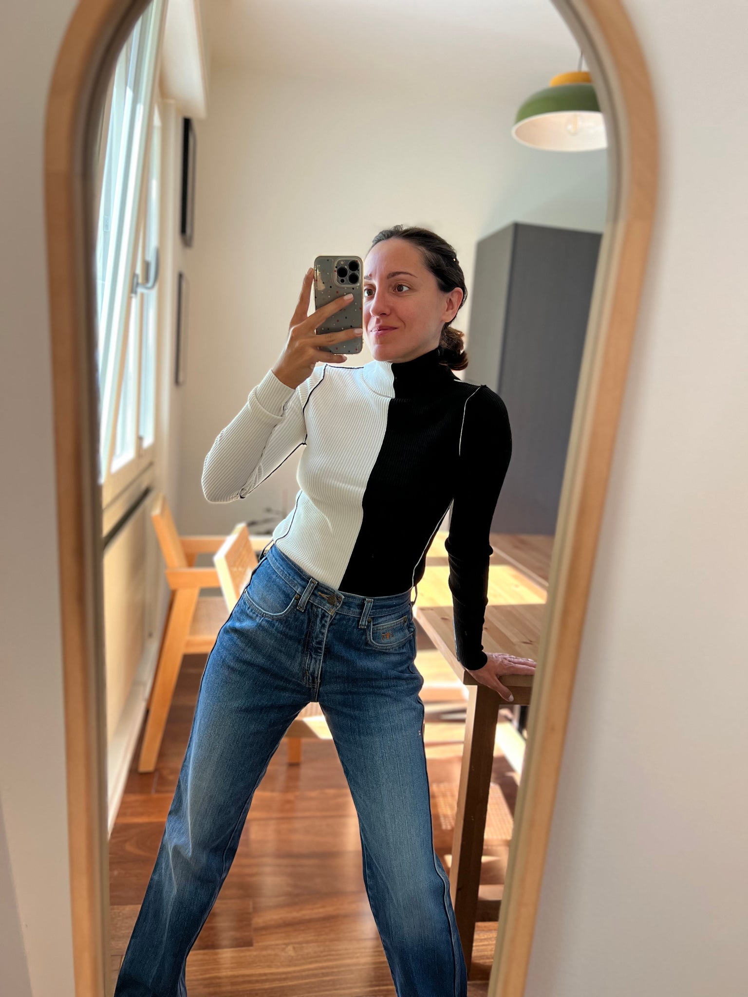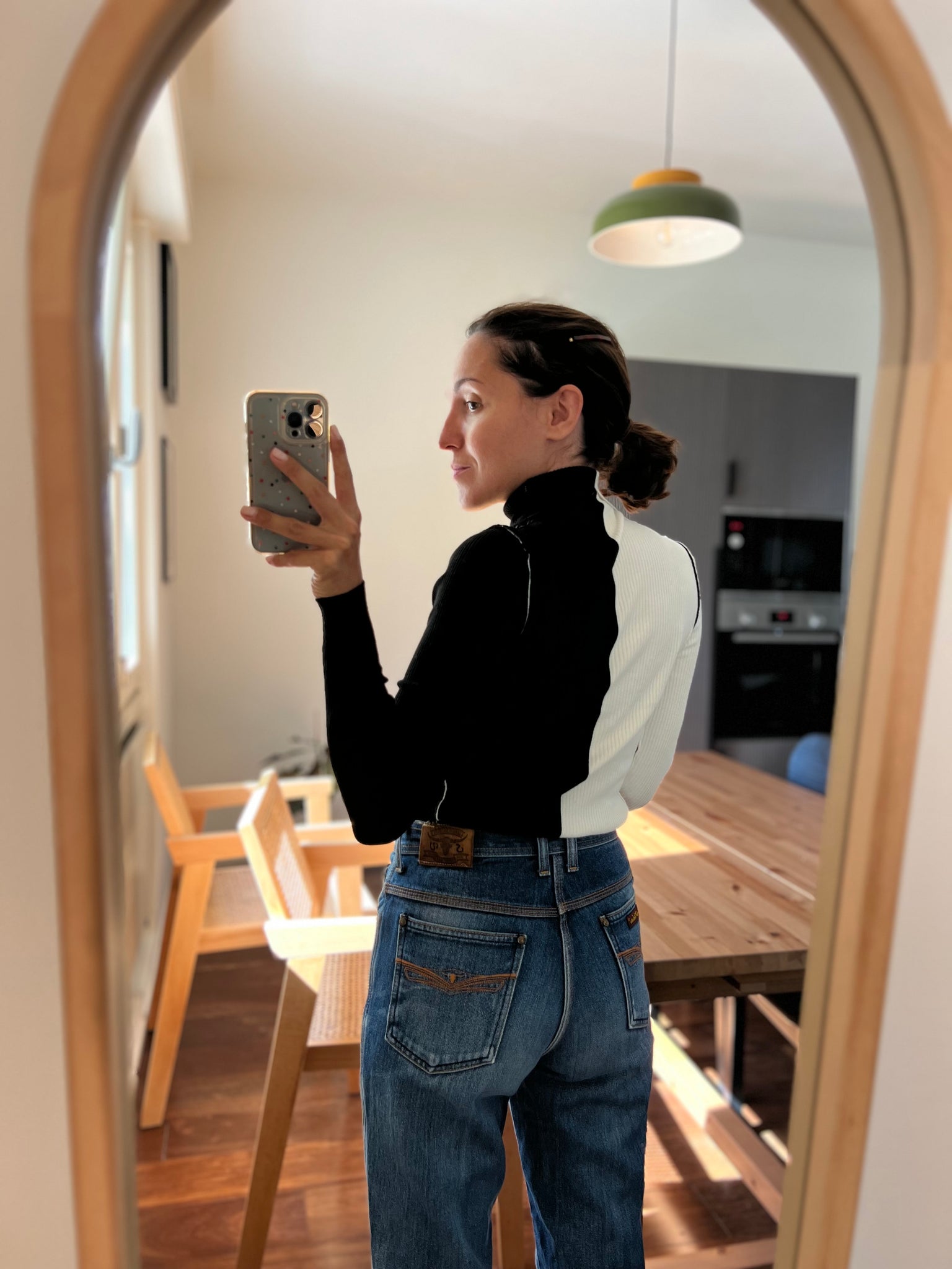 Modello aderente a coste, collo alto da risvoltare con spacchetto dietro.