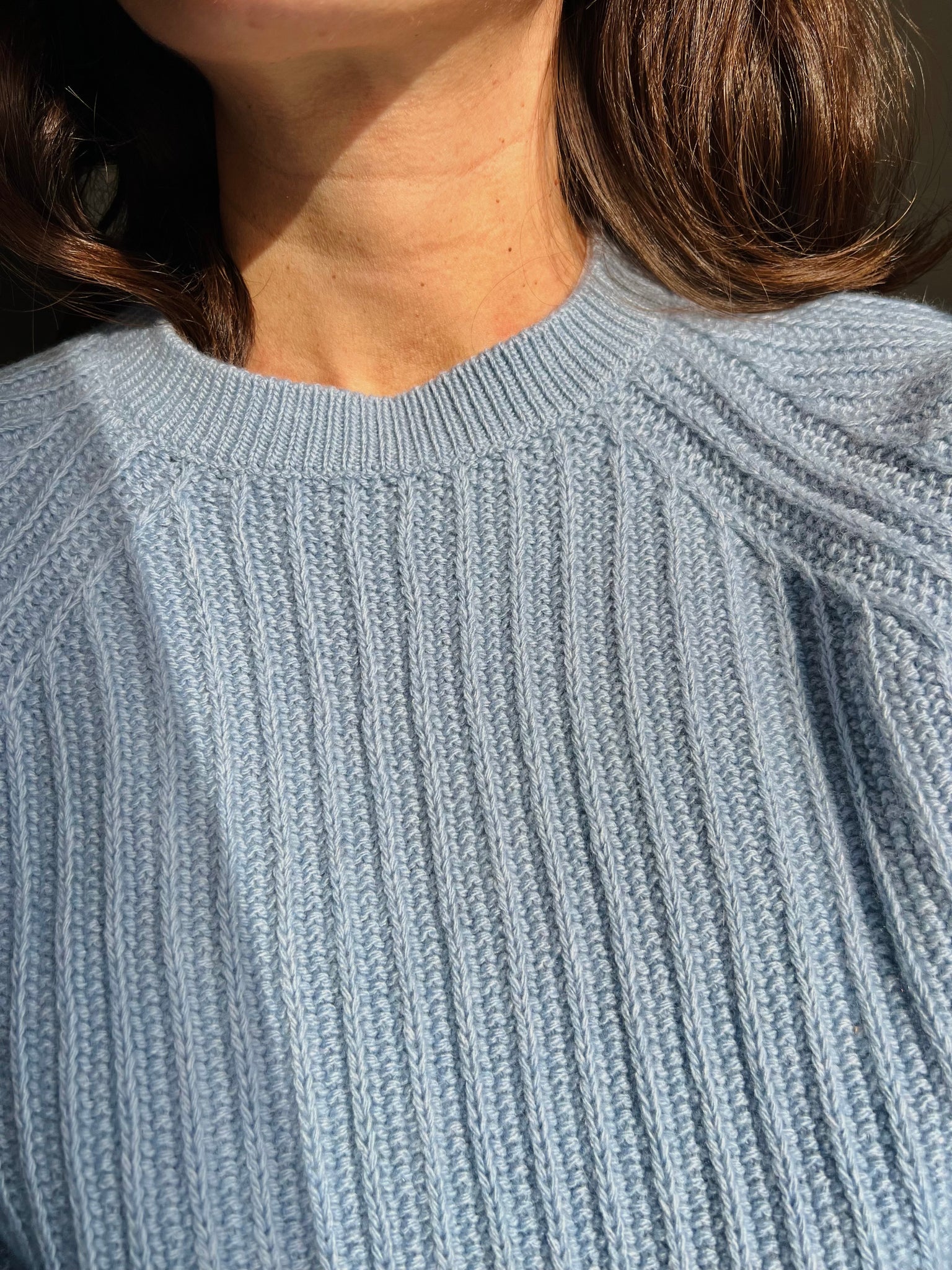 Modello girocollo con spalla raglan, e fondo stretto lavorato su busto e maniche.