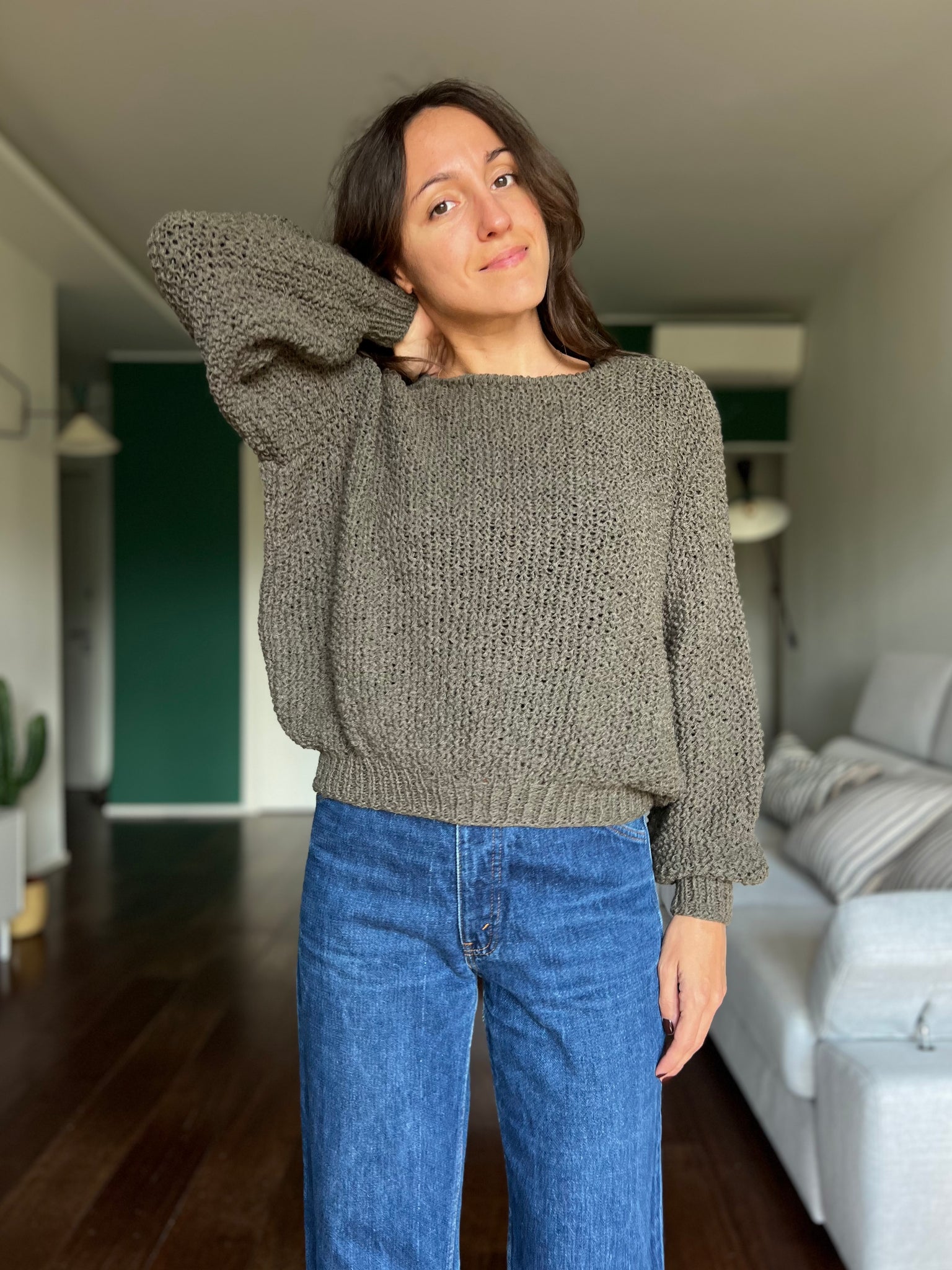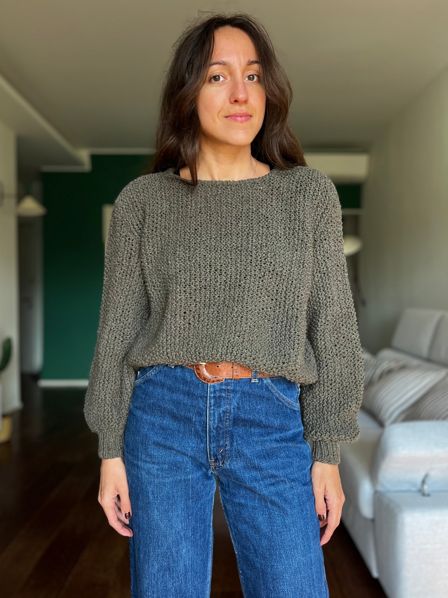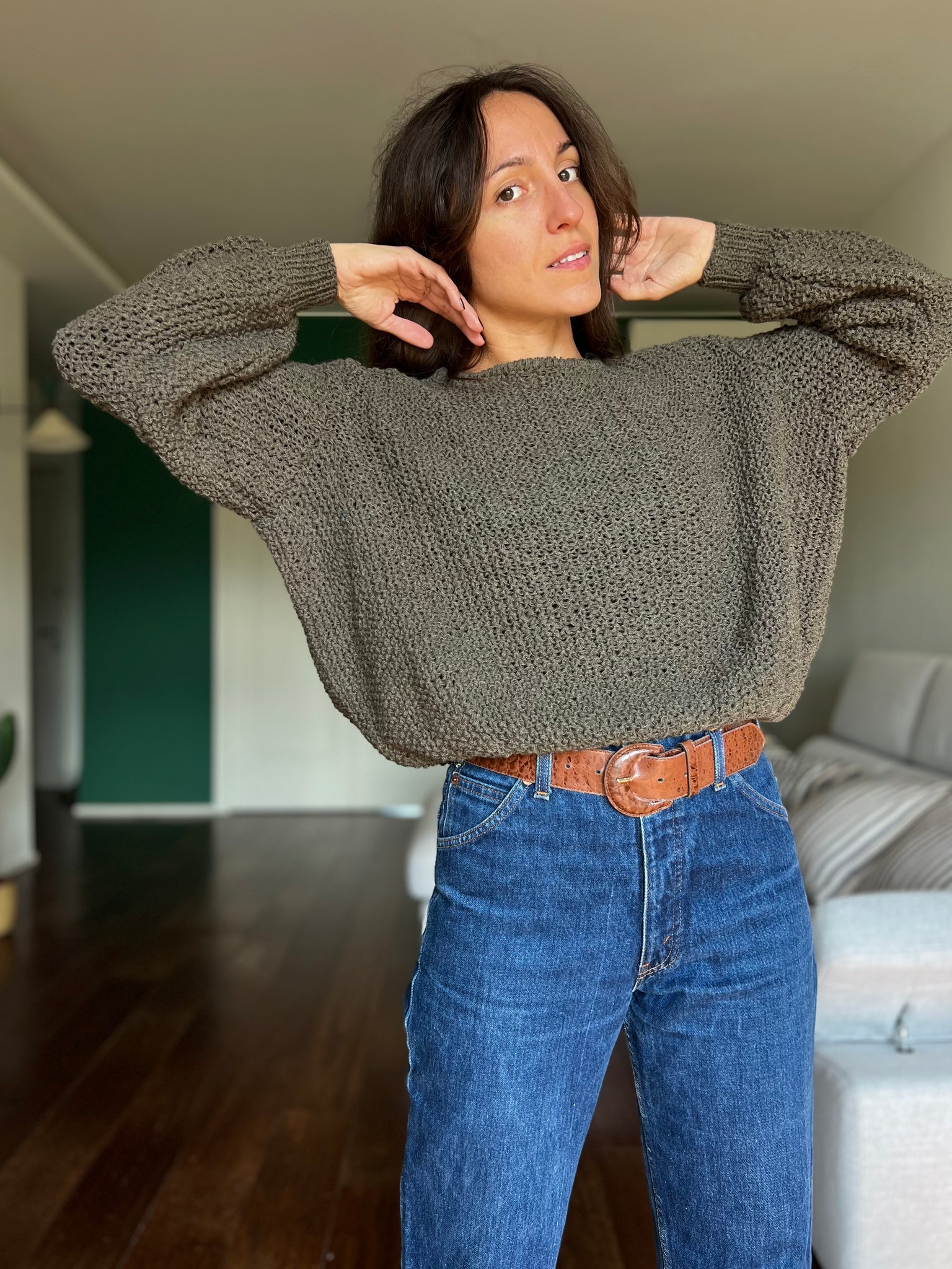 Maglione vintage fatto a mano in un filato misto lana di un bellissimo colore tra il verde e il marrone.