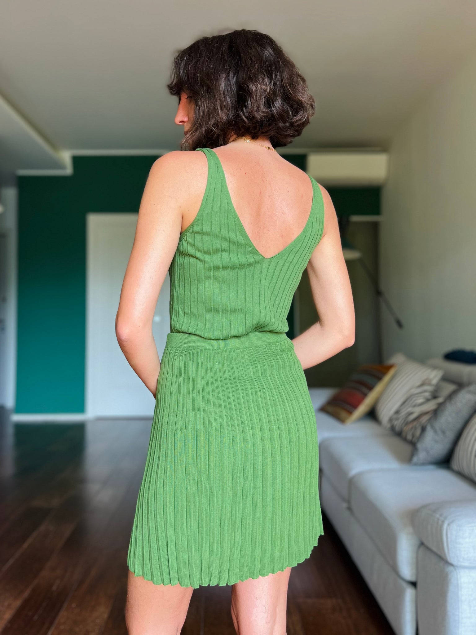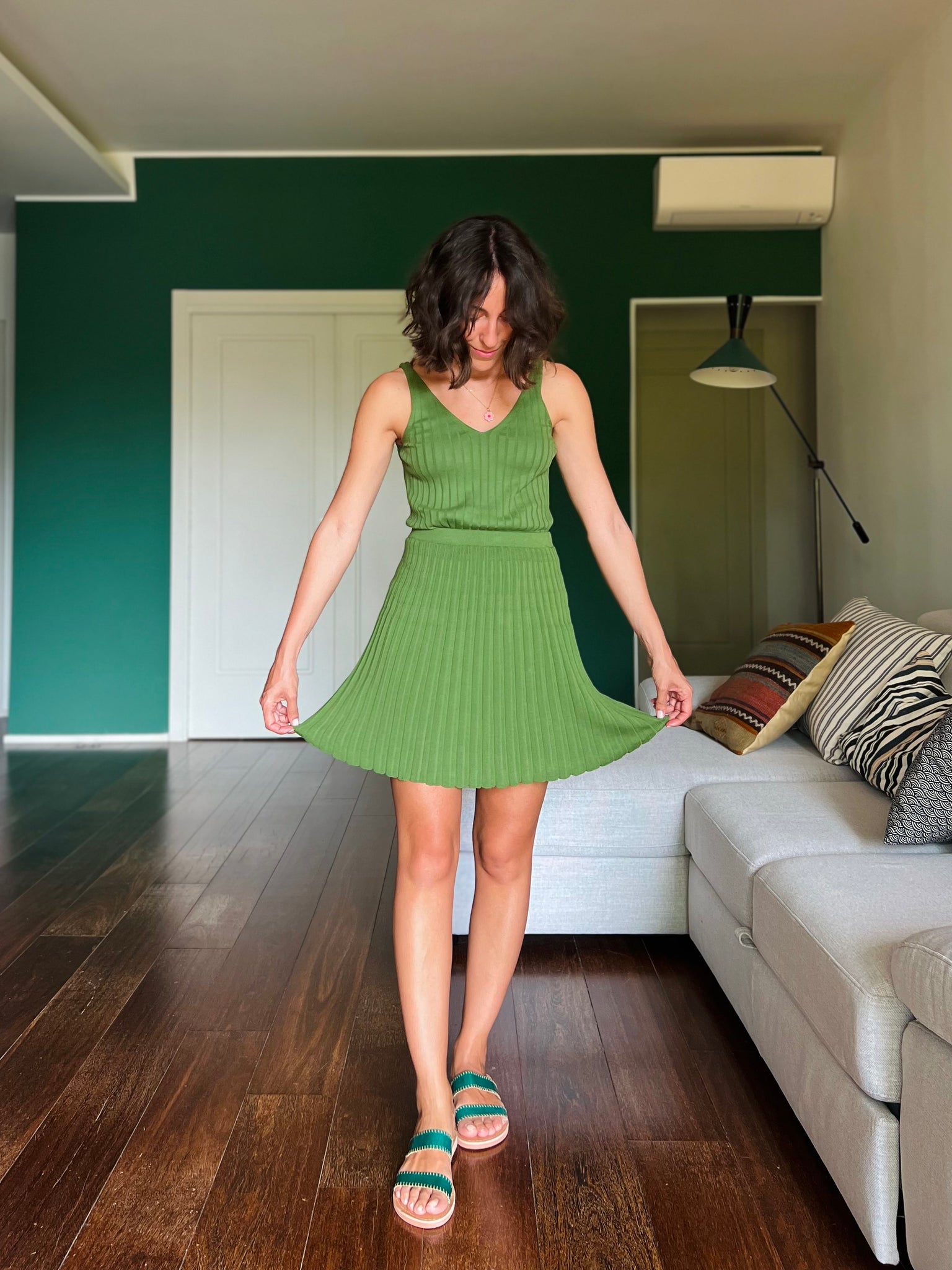 Maglia plissé, vita alta elastica, scende morbida valorizzando le forme e segnando davvero poco.