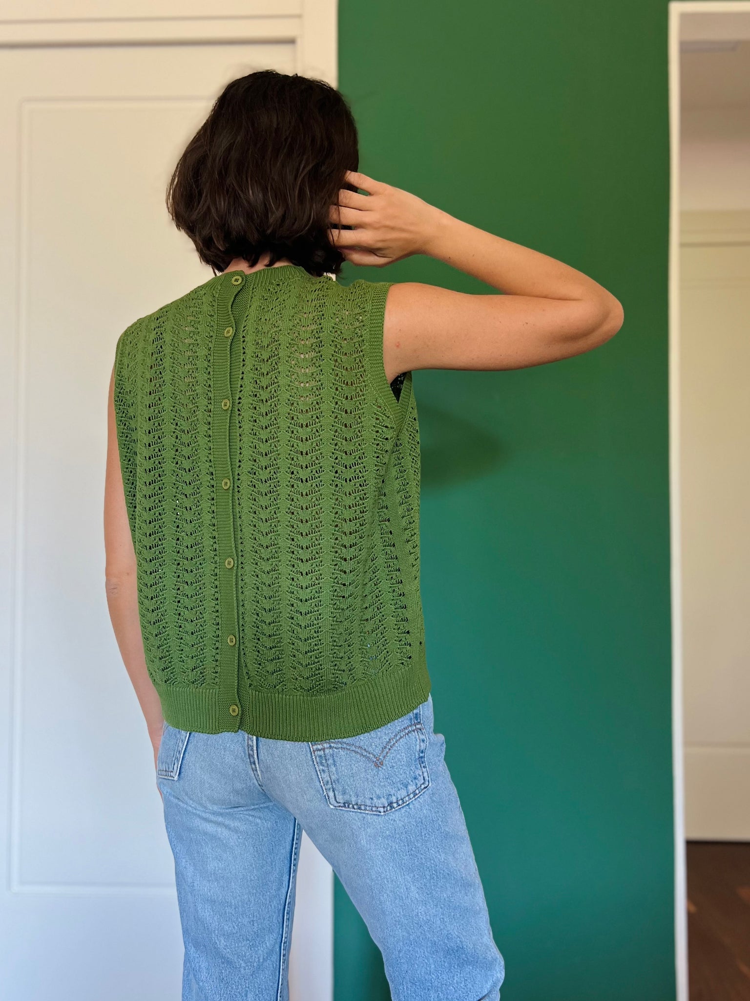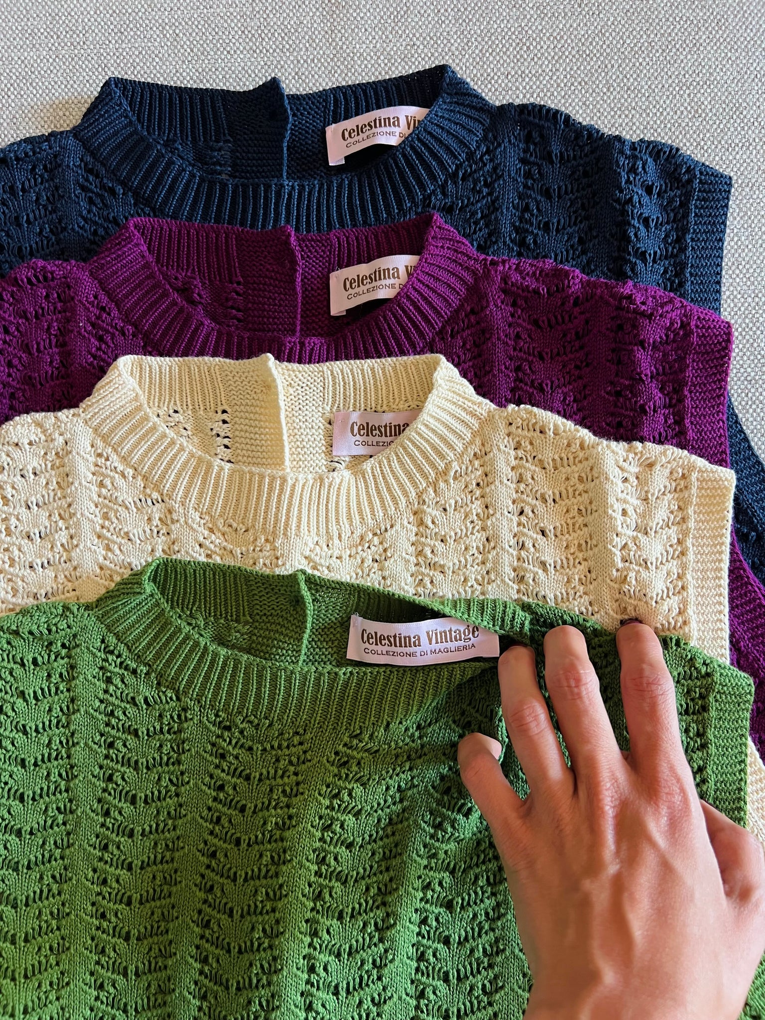 Maglia traforata, girocollo, bottoni sulla schiena.