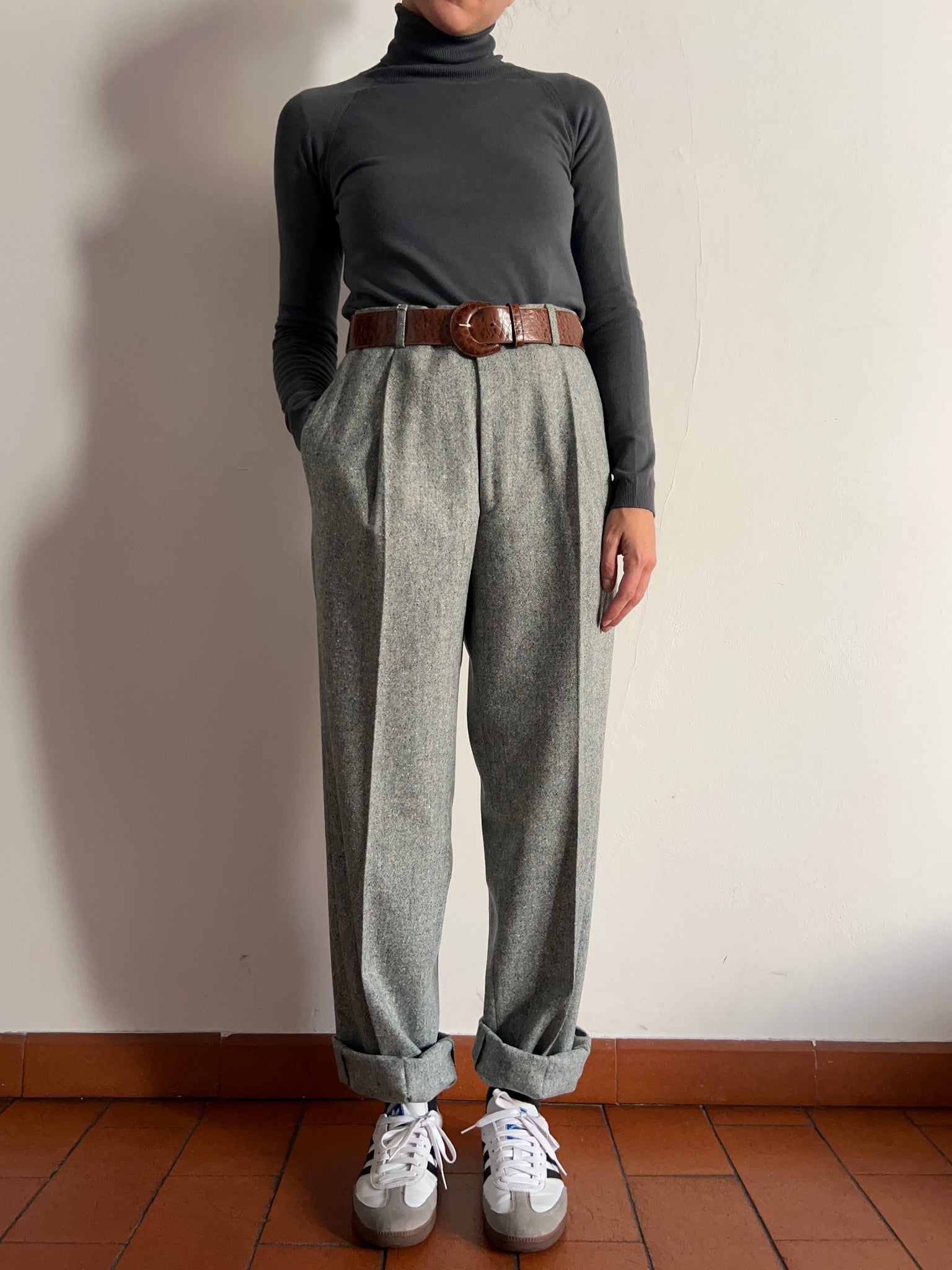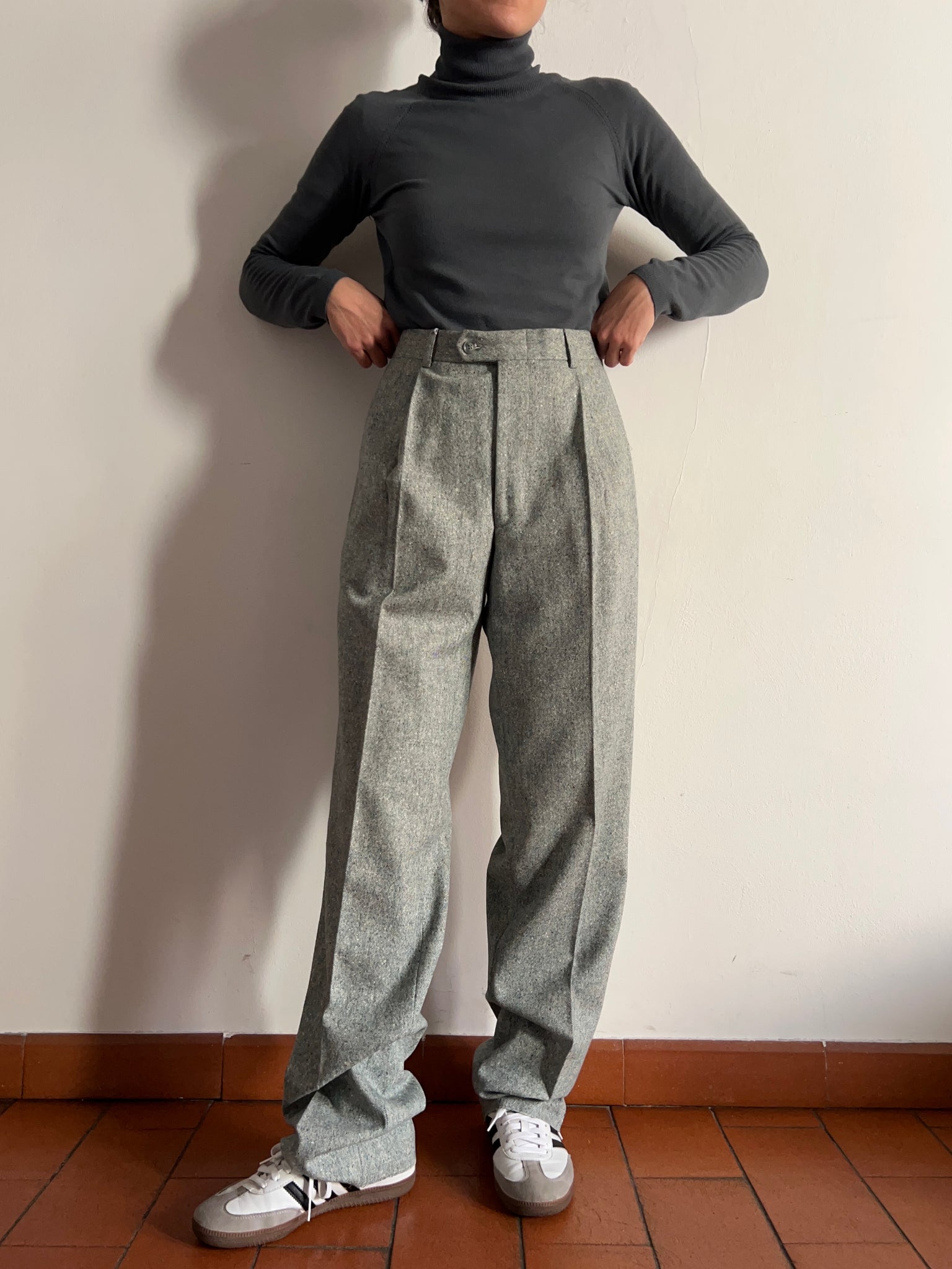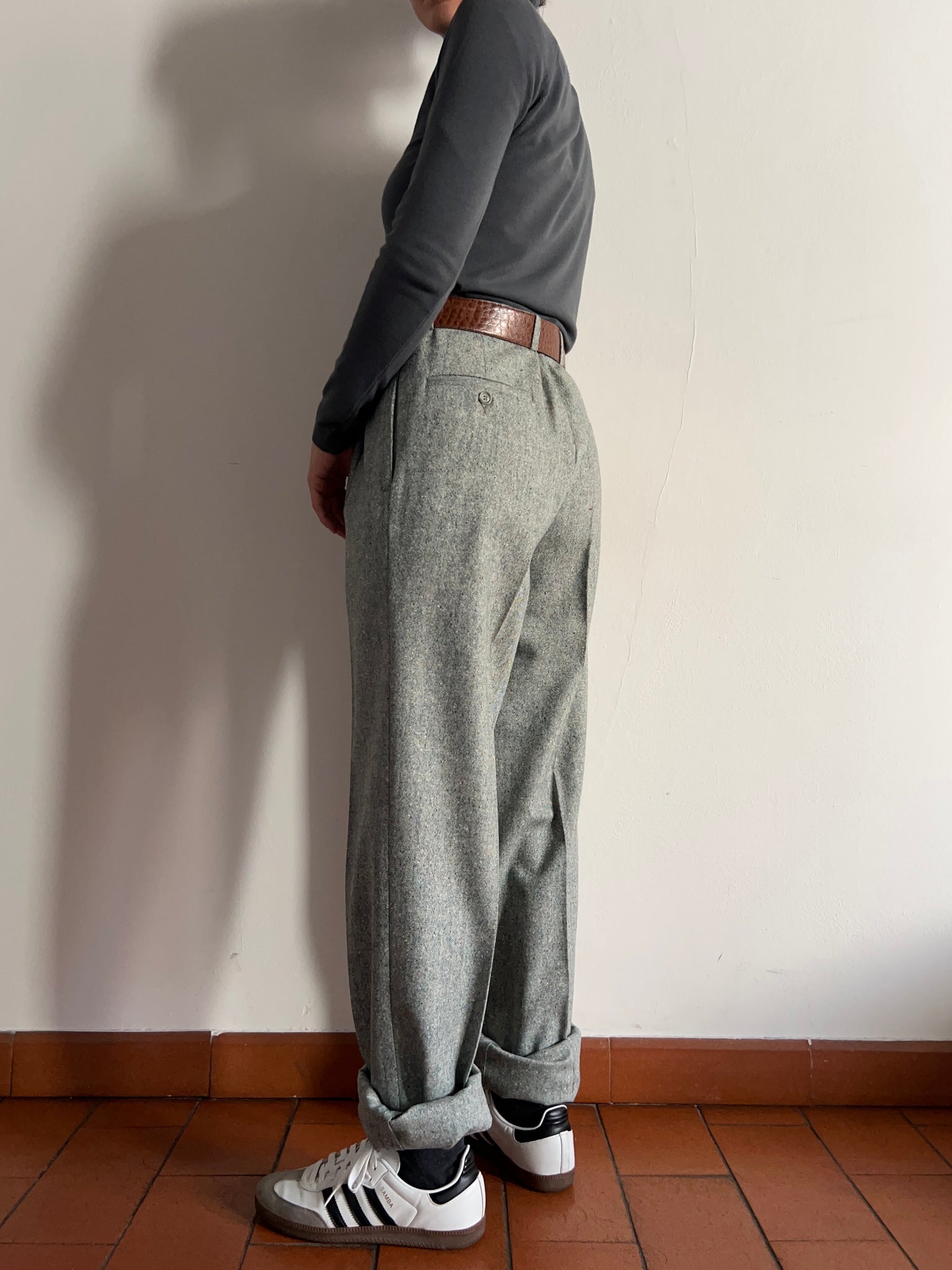 Pantalone vintage maschile a vita alta, con passanti, pince e tasche.
