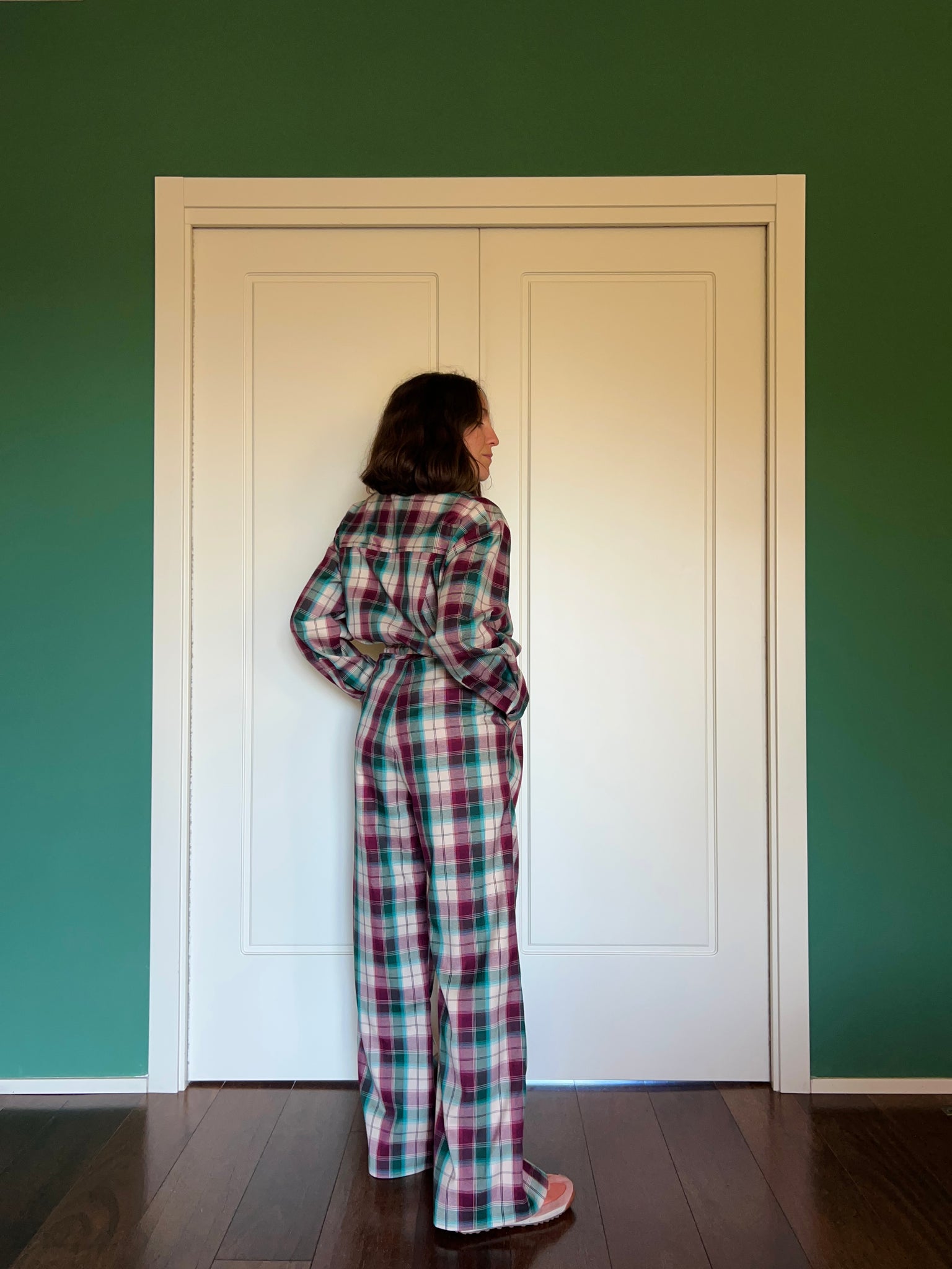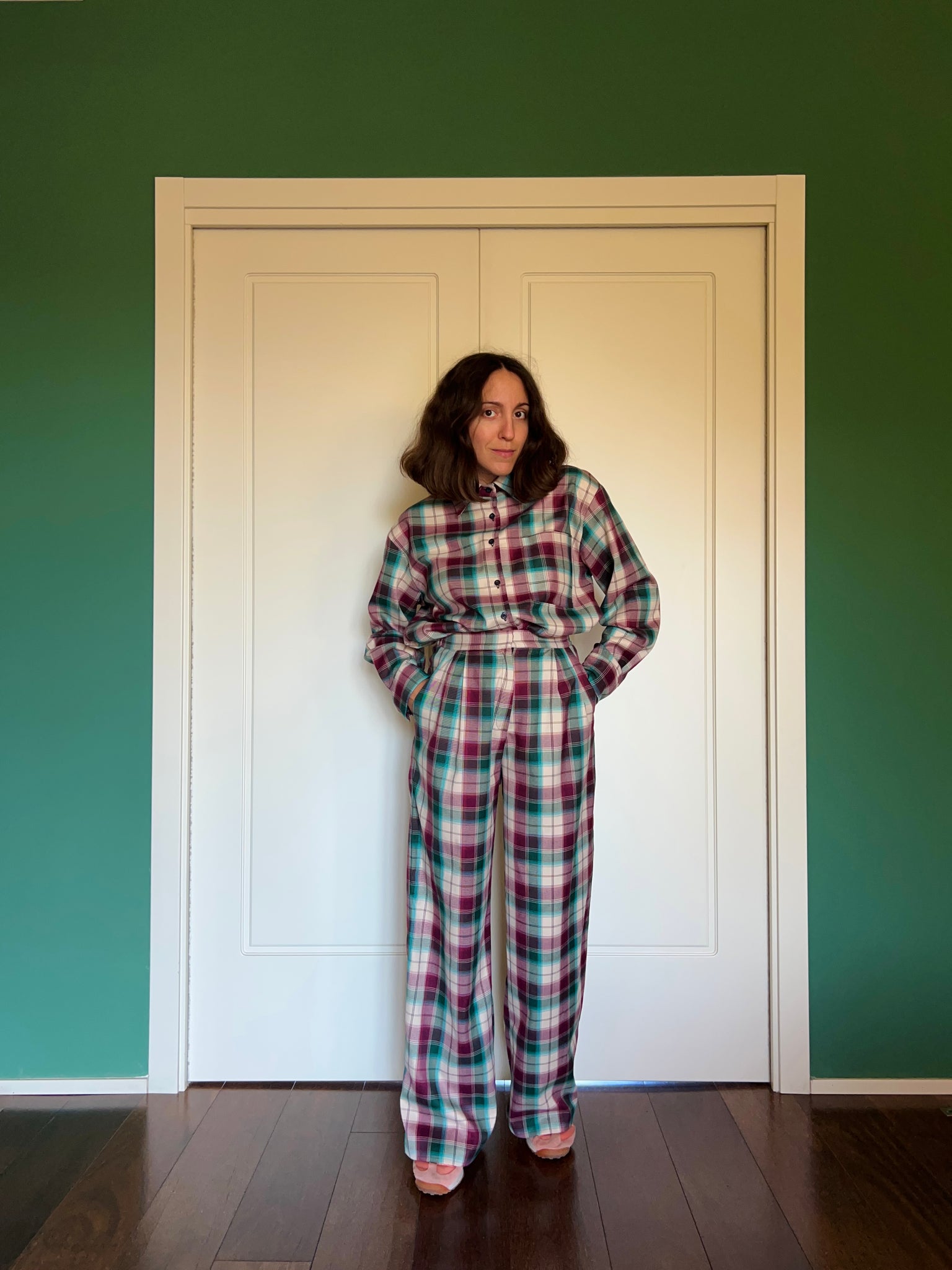 Pantalone sartoriale con le pince tartan violetto e ottanio