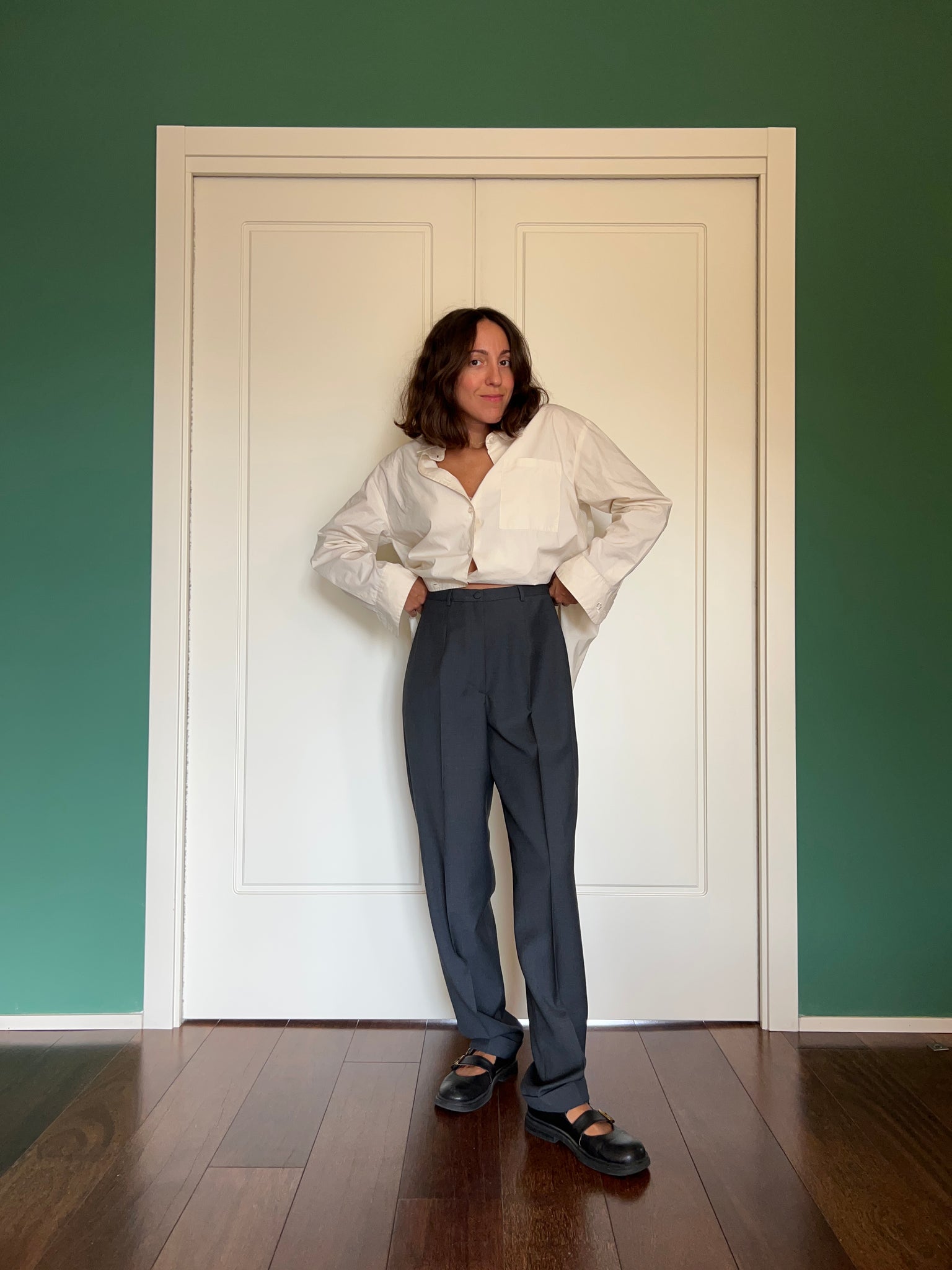 Pantalone a vita alta con passanti. Girovita 77cm. Fianchi 108cm. Lunghezza gamba esterna 108cm. Molto bello il dettaglio del bottone ricoperto.