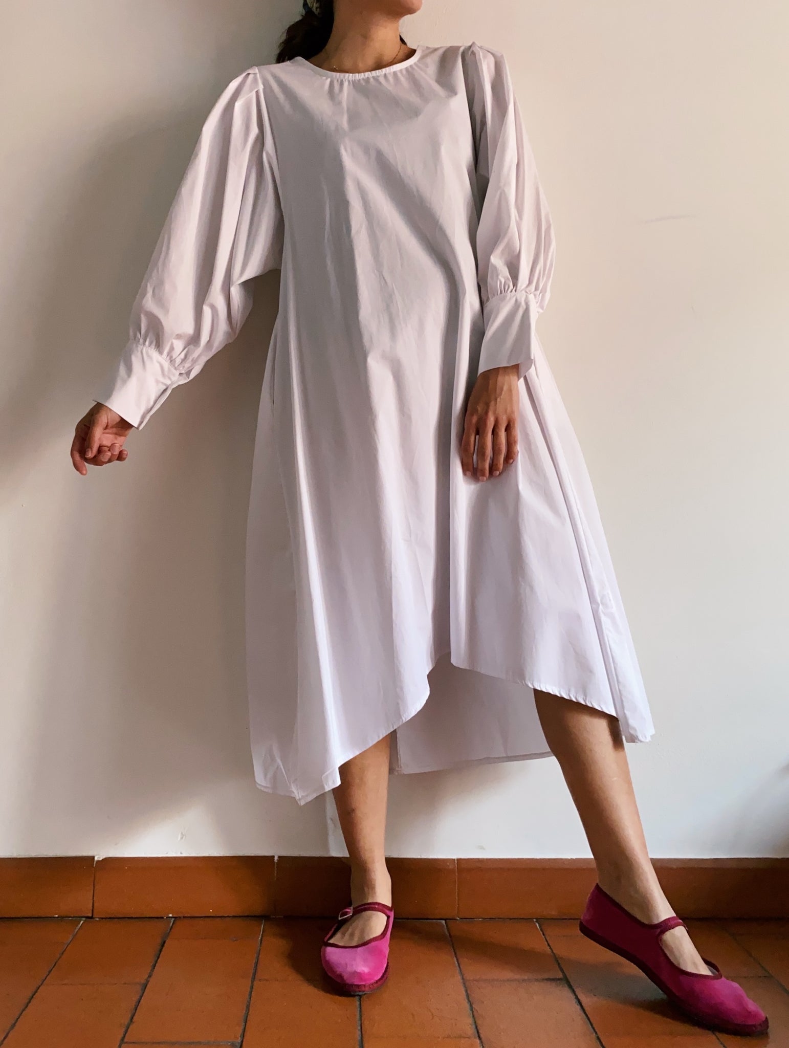 Abito handmade di Chiara Luppi, modello ampio svasato con maniche a sbuffo.