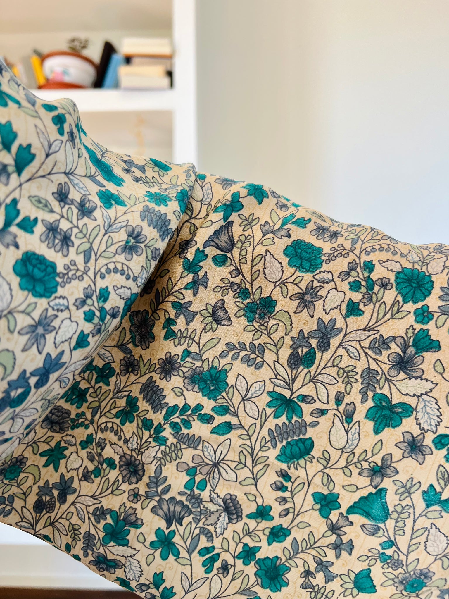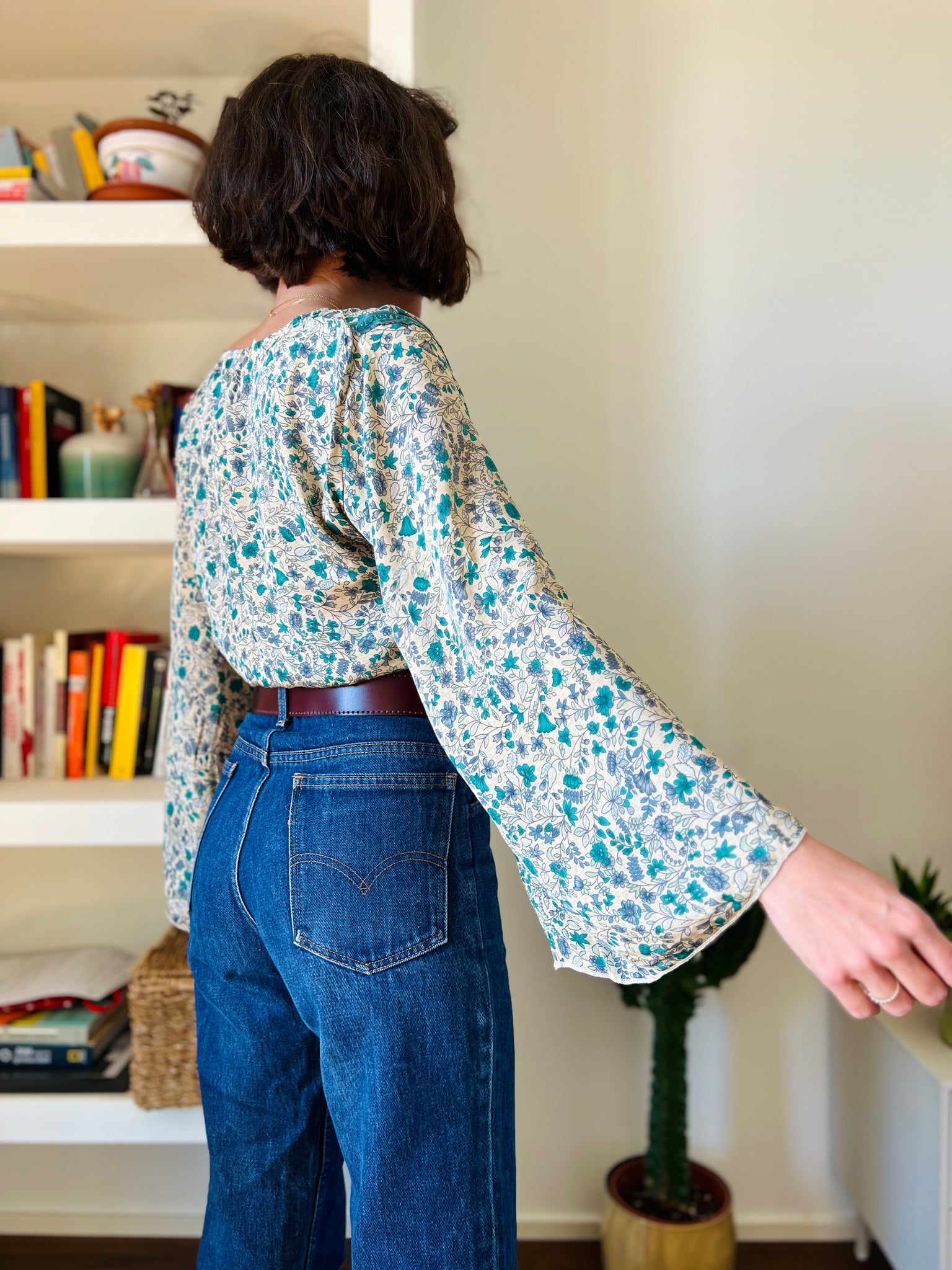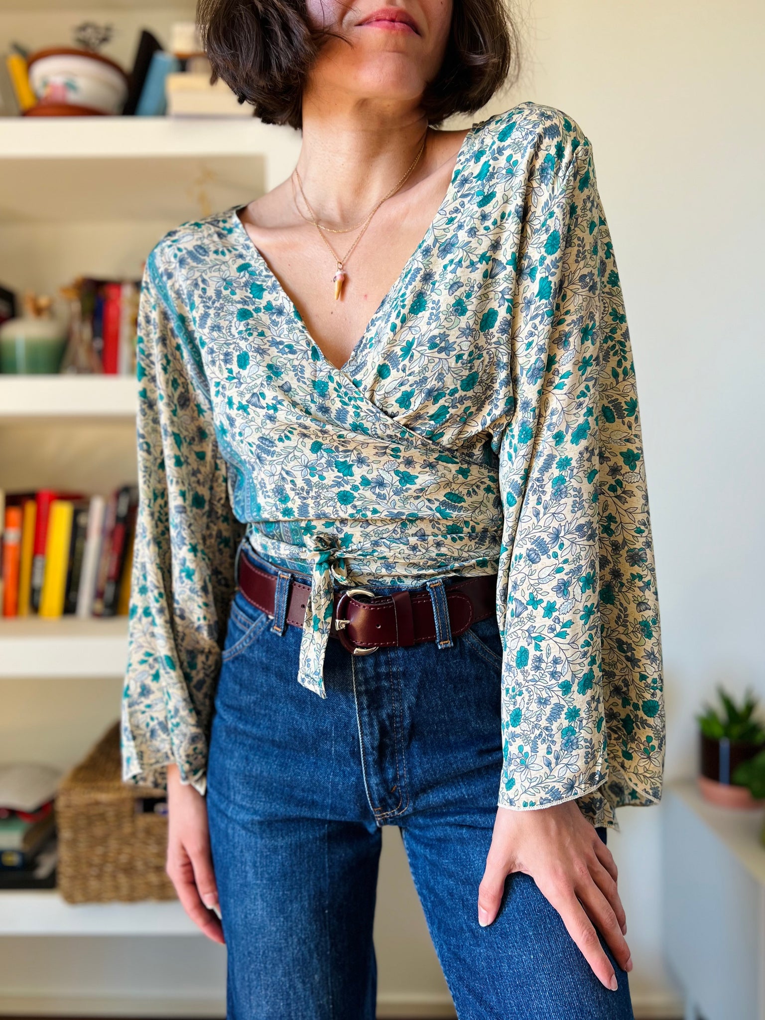 Camicia indiana incrociata beige fiori turchesi