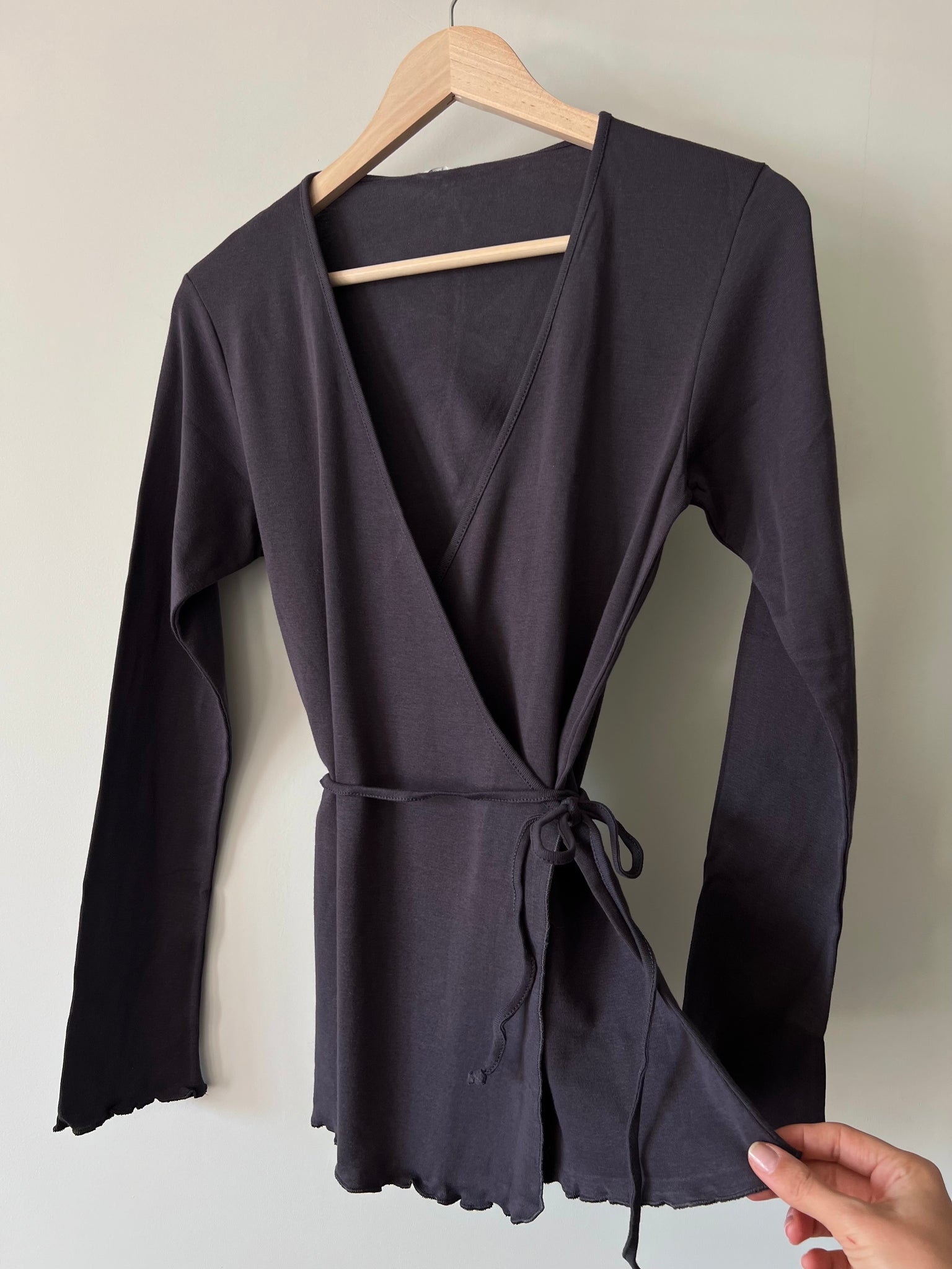 Maglia modello scaldacuore incrociato, si chiude infilando il laccetto nell’asola laterale e legandolo sul lato, davanti o dietro, come si preferisce.