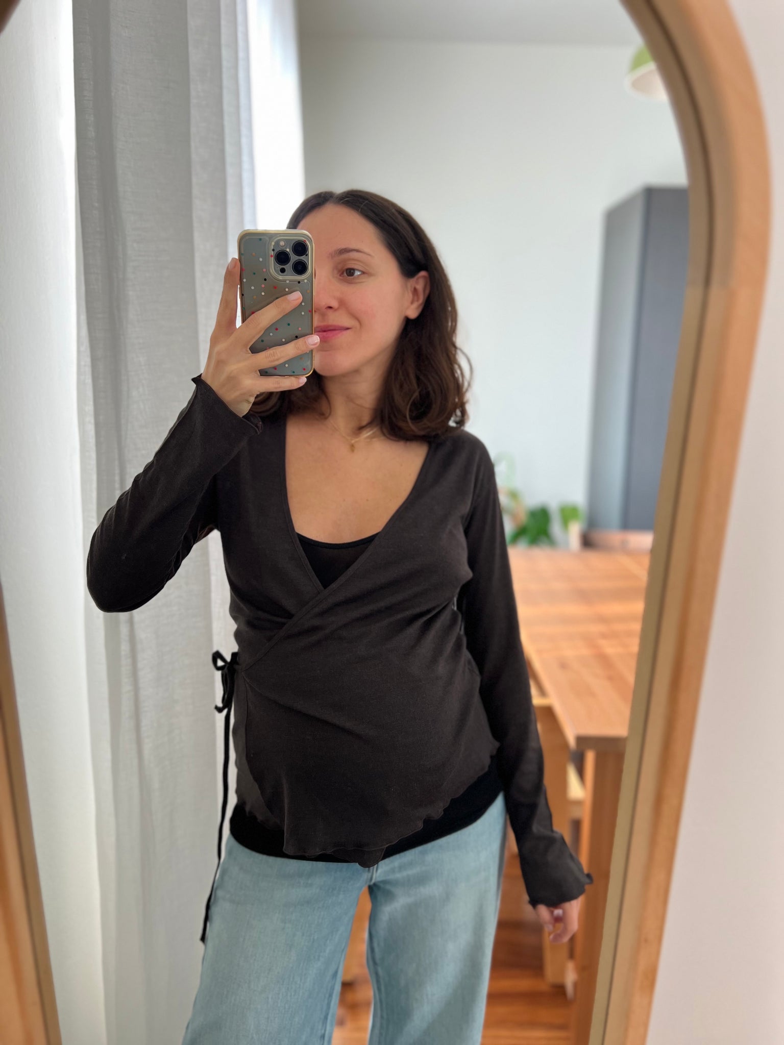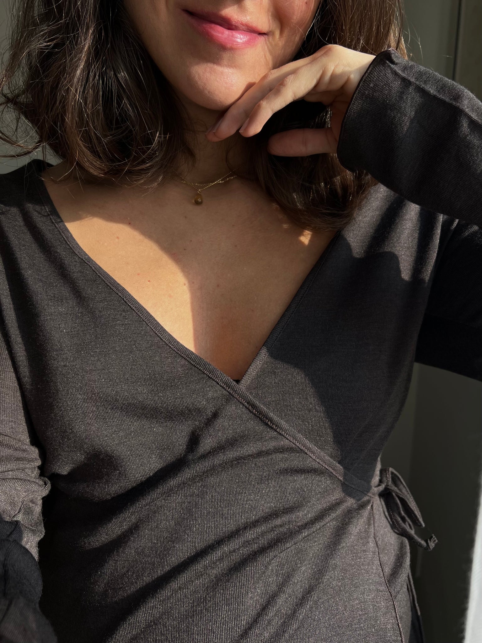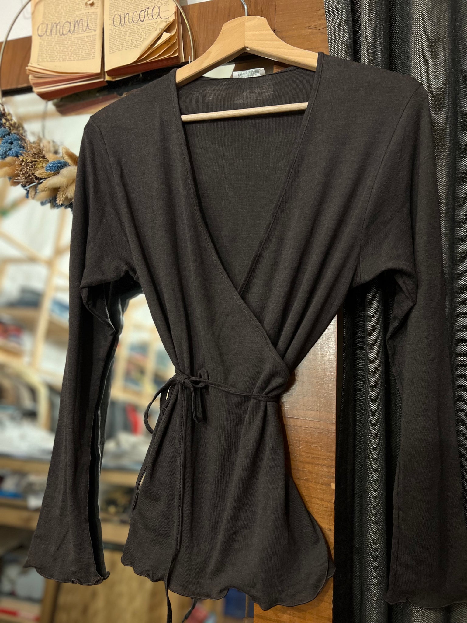 Maglia modello scaldacuore incrociato, si chiude infilando il laccetto nell’asola laterale e legandolo sul lato, davanti o dietro, come si preferisce.