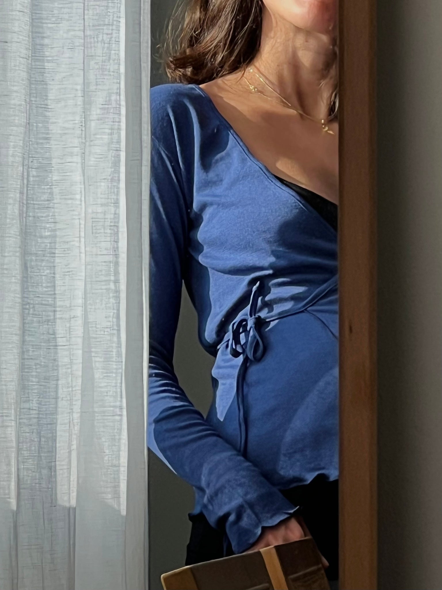 Maglia modello scaldacuore incrociato, si chiude infilando il laccetto nell’asola laterale e legandolo sul lato, davanti o dietro, come si preferisce.